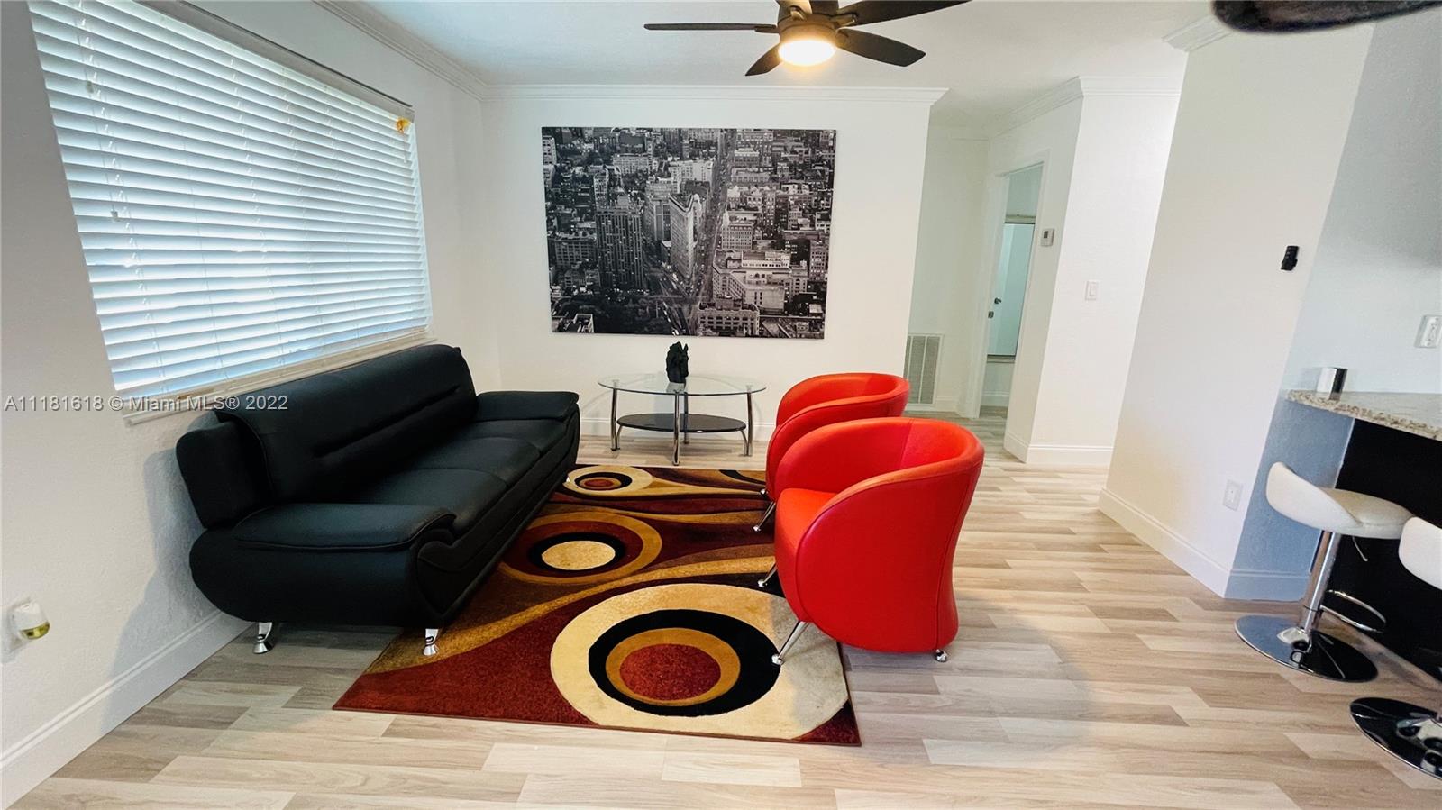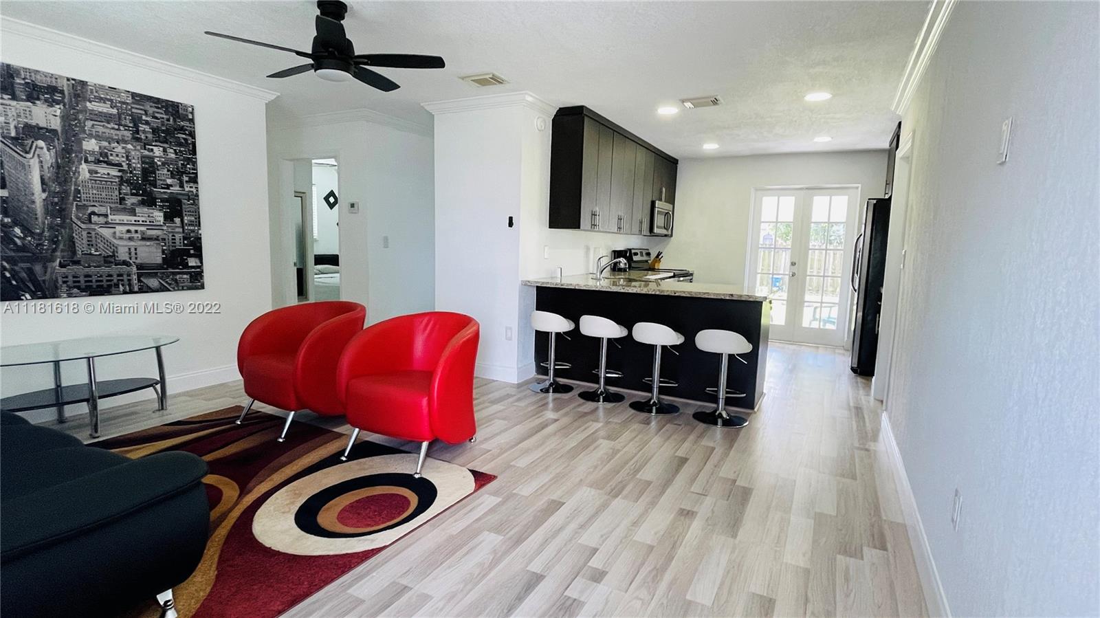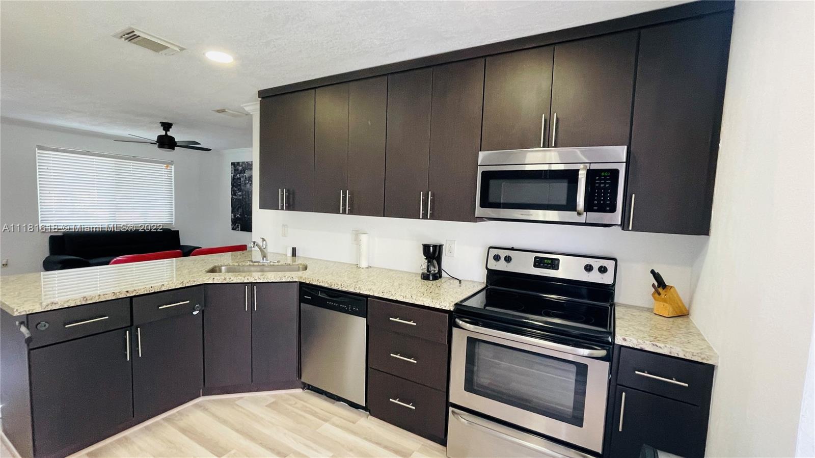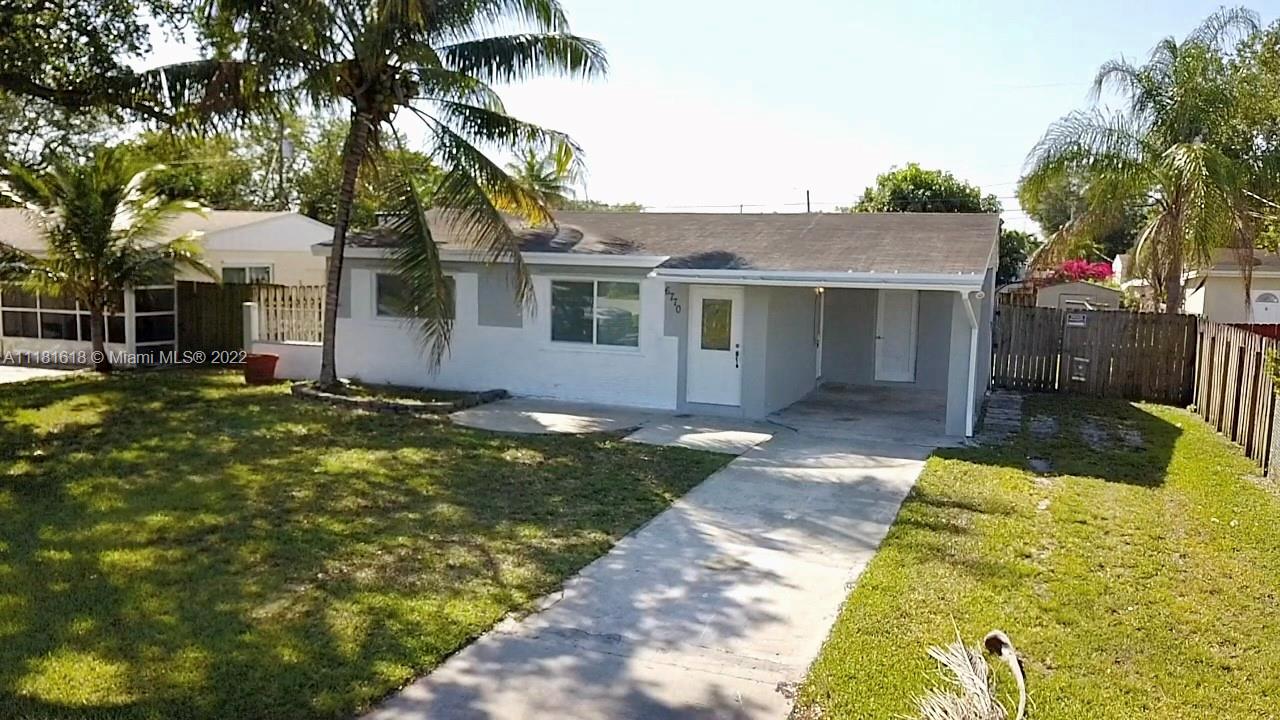 Immaculate Conditions 2/1 + Carport and Separate Laundry Room. Fresh Painted Inside and Outside, Impact Windows. Wood Kitchen Cabinets, Granite Countertop with Stainless Steel Appliances, Updated Bathroom, Laminate Wood Flooring entire property, Crown Molding, Knockdown on Walls, Central A/C + Ceiling Fans. Nice and Spacious Fence Backyard with Playground, Open Porsche and Shed to Enjoy with Family and Friends. Click on the Virtual Tour link.