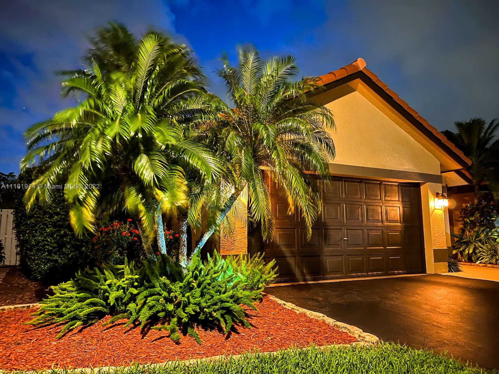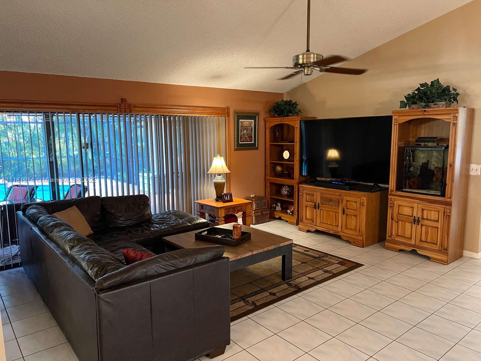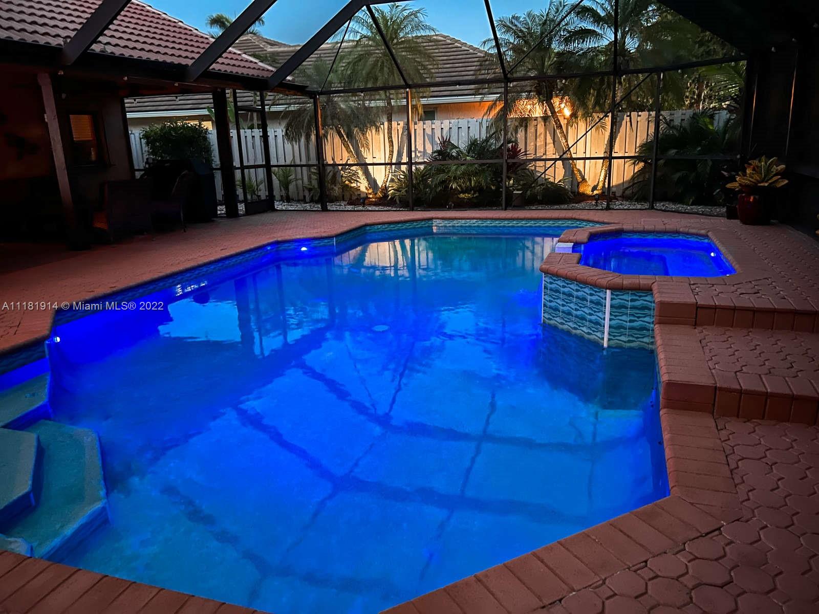 This elegant ranch-style house feels like home the minute you pull up. Beyond the double doored front entry, you are greeted by the 15 ft. vaulted ceilings of the elegant great room. This luminous entryway flows into an open concept living room that showcases a tropical paradise. The resort-like backyard boasts a large, screened-in swimming pool and waterfall jacuzzi, paved patio, fully fenced backyard, and lush landscaping. The newly renovated kitchen is right off the patio area, perfect for entertaining guests or enjoying a family dinner. The open floor plan and large sliding glass doors throughout, allow for for you to enjoy the captivating views of your backyard oasis both morning and night. The roof on this luxurious home was recently replaced and still under warranty. Welcome Home!