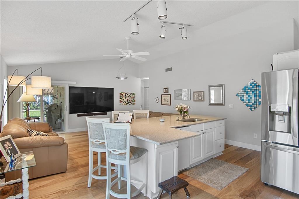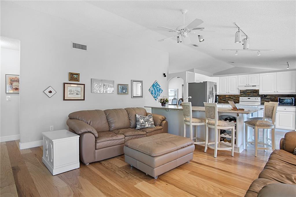 Welcome Home to this 4 Bedroom, 2 Bathroom Split plan Lakefront Home on the LARGEST LOT in the community! This house has been exceptionally maintained by these long term owners. Upgrades Include: NEW ROOF (2020), IMPACT Windows & Doors (Including Front Door & Garage), Tankless Hot Water Heater, Newer A/C (2014), Engineered Wood Floors Throughout, Carpet in the Bedrooms, Open Kitchen w/ White Cabinets, Stainless Appls, Brand New Refrigerator, Quartz Countertops, Bose Surround Sound in Family Room, Vaulted Ceilings in Living Room, Huge Master Bedroom w Extra Large Walk in Closet, Completely Renovated Bath w dual Sinks and Separate Walk In Shower & Jacuzzi Tub! Backyard is Fenced w/ White Vinyl PVC, HUGE YARD, Screened In Patio off Family Room Perfect For Entertaining, Electric Awning & More!