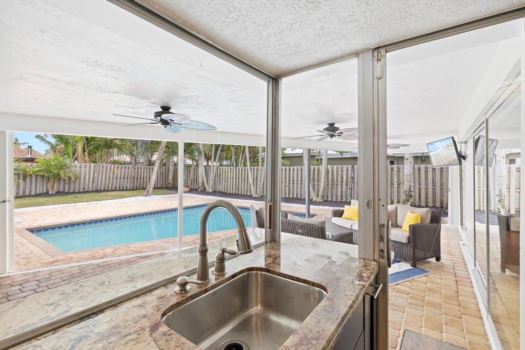 Looking for a true 4 bedroom home? Then look no further! This move-in ready home features a unique pool design, large open & covered patio with outdoor TV, nice fenced yard space for a swingset, putting green & Fiddo to play. Inside delights include newer stainless steel appliances, gorgeous new high-end washer and dryer. The owner's suite has pool access & views, walk-in closet & ensuite bath. The other side of the house has 3 additional bedrooms & a large guest bath with access to the pool. The 2 car garage is currently used as a super cool game room with custom bar & lighting. The living room has a modern fireplace & great views with access to the pool. This home has hurricane windows & the sliders have accordion shutters. A/C is 5yrs. Walk to Addison Mizner & skip the car pickup line.