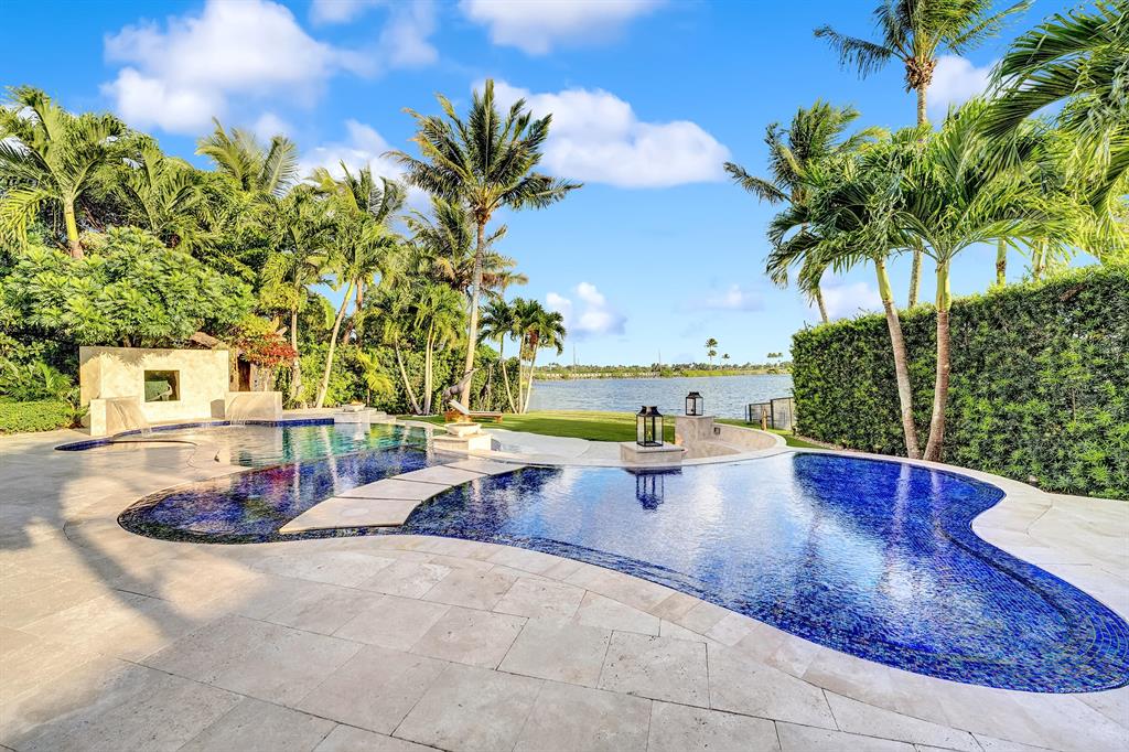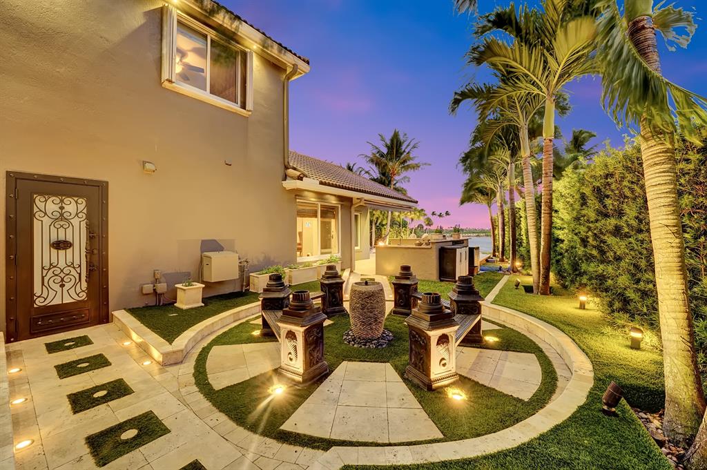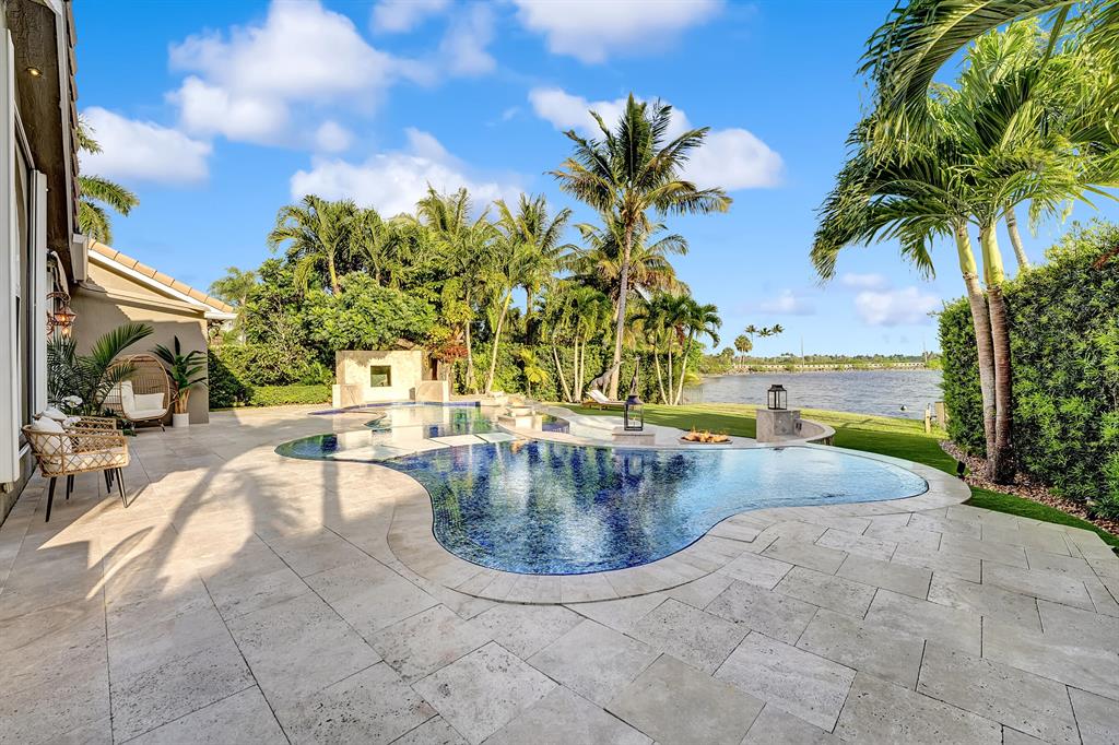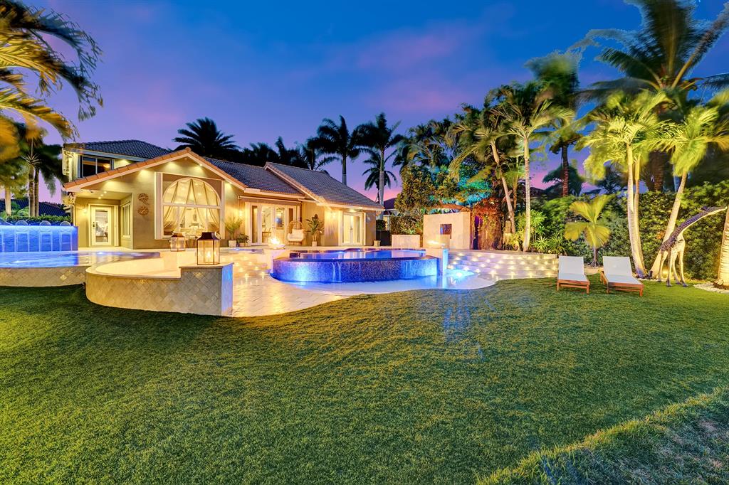 Enjoy expansive & breathtaking waterfront views from this designer backyard oasis. You will feel like you're on a private island complete with a luxurious 3-tiered pool, beach entry pool, outdoor tree shower and 3 gas fire pits, perfect for entertaining, family gatherings and more. This exquisite home is privately situated on a professionally landscaped corner lot with lighting that will take your breath away. 100% impact windows and vault style doors for added security. Property has been fully upgraded and features 5 bedrooms with master on main floor with pool access and custom closets throughout. Fully automated smart home, complete with security camera system, Numi toilets, Nest devices, smart pool/salt water therapeutic system, delicious mango tree and more!