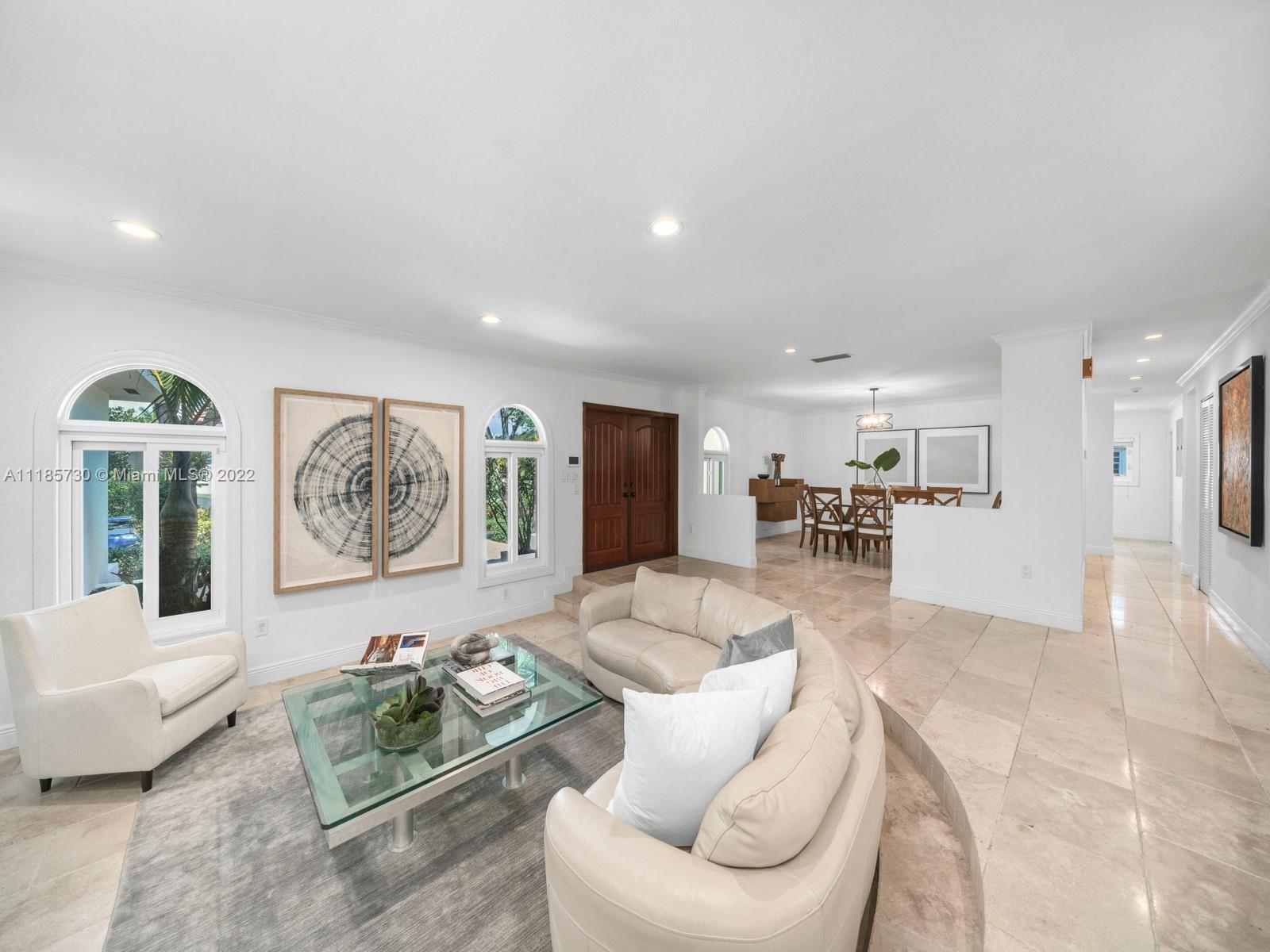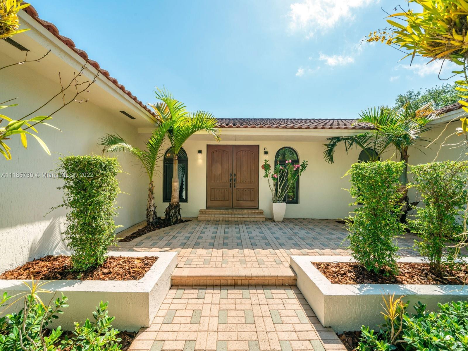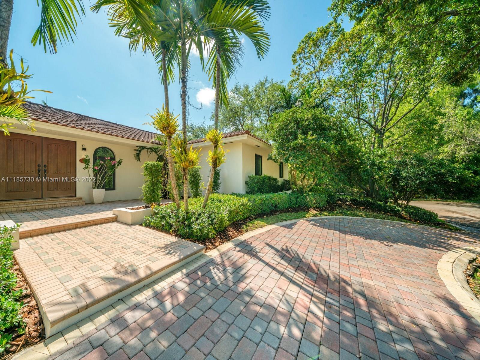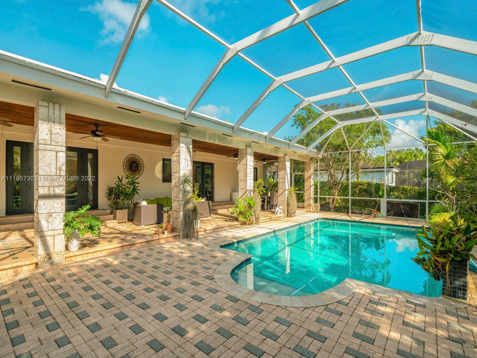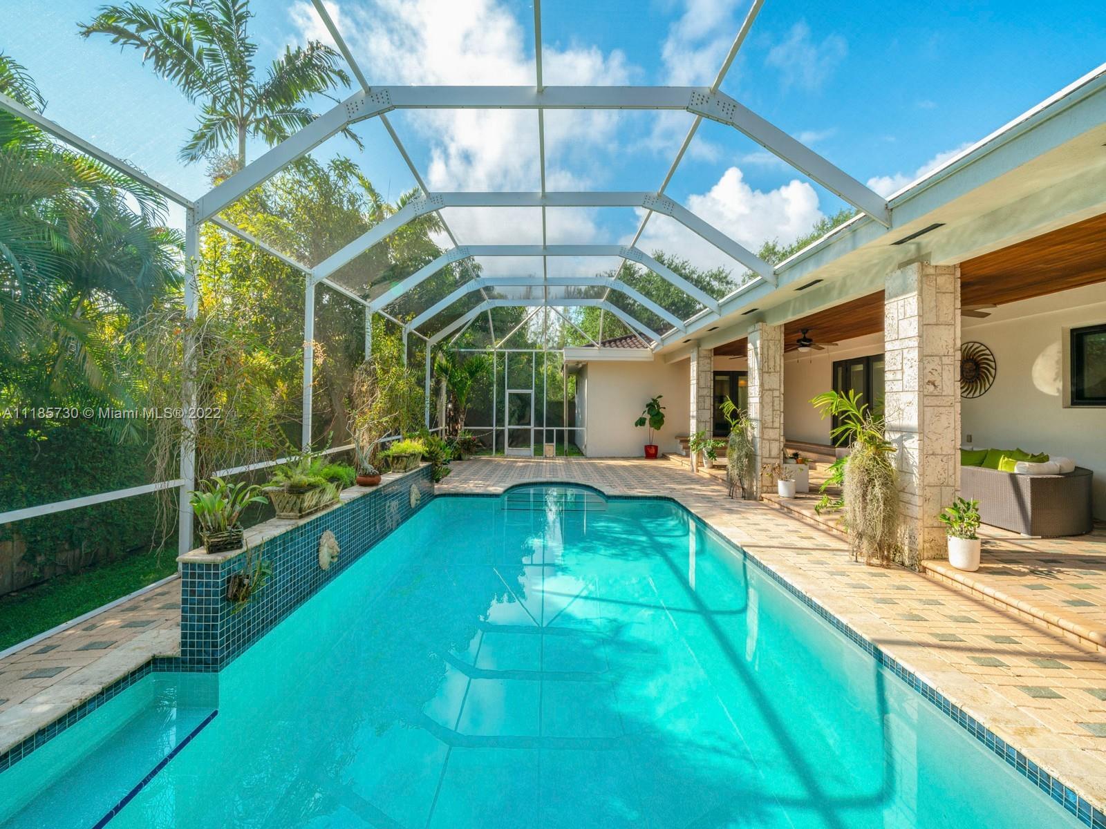 Gorgeous and completely renovated one-story home in highly sought-after Pinecrest by the Sea. An exclusive guard gated community offering a neighborhood park, pedestrian friendly roads, top municipal services, and an excellent voluntary HOA. Elegantly renovated move in ready home that includes 5 bedrooms and 5 full bathrooms plus home office/den and converted garage. Home features elegant interiors, spacious living areas, formal living and dining, family room adjacent to an updated kitchen with quartz countertops and stainless-steel appliances overlooking a beautiful pool surrounded with luscious landscaping. Features include impact windows and doors, travertine floors, saltwater pool, and Tesla charger. Beautifully elevated and oversized corner lot. Elite schools nearby