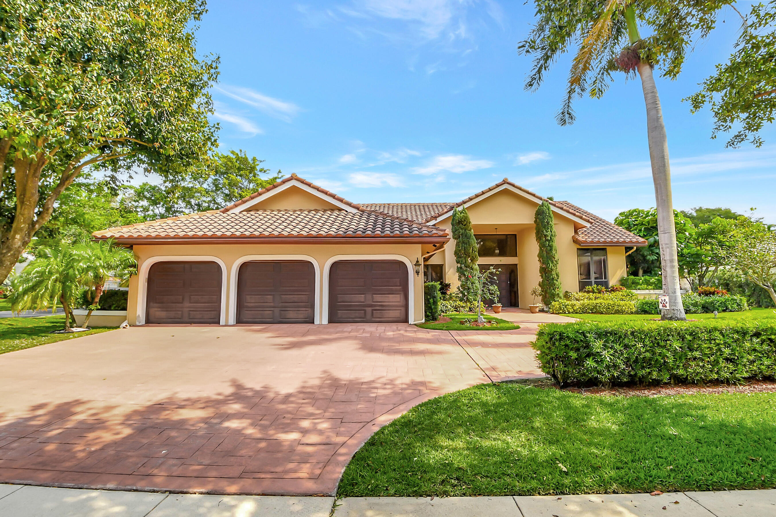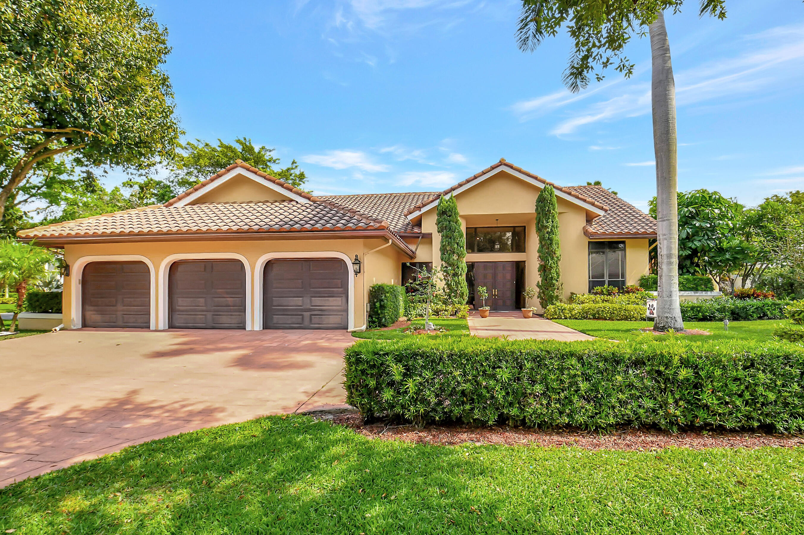 This tremendous single story 4 bedroom 4 bath custom estate home is located in Water Oak Estates, one of the most sought after villages within the Broken Sound Country Club. Inside you will find volume ceilings throughout, a split bedroom open concept floor plan with plenty of space. The gourmet kitchen features granite countertops and stainless steel appliances. The master bedroom suite features a large walk in closet, frameless shower door and large soaking tub. Walk outside to the massive screened-in porch and private pool that adds plenty of living & entertaining space to the back of the home. The yard that extends out past the enclosure is lushly landscaped with stunning pink bougainvillea, trees and grass for pets.