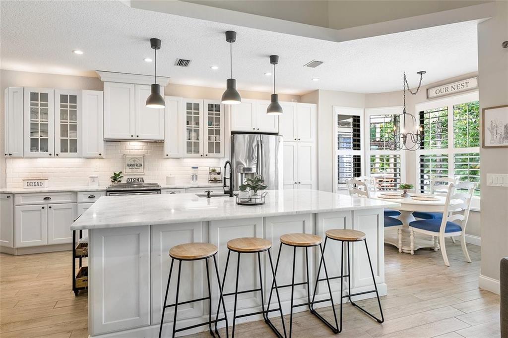 Simply a beautiful home with a fabulous a Florida design and modern farmhouse influences. The fresh and light interior is drenched in natural light giving it a bright and airy feel. The jaw-dropping crisp white kitchen with a very large island takes center stage in the open & spacious family room/kitchen area. Sublime primary suite with spa like bathroom is recently updated. The backyard is a prime spot for relaxing with a pool, summer kitchen, outdoor living areas and a sprawling lawn. Adding to the splendor of the home is its location in a quiet tree-lined cul de sac featuring impressive homes. Other offerings: most impact windows/doors, fireplace, large secondary bedrooms, wood elements, white tones & soft neutrals