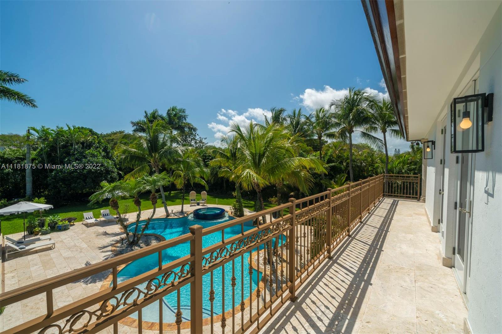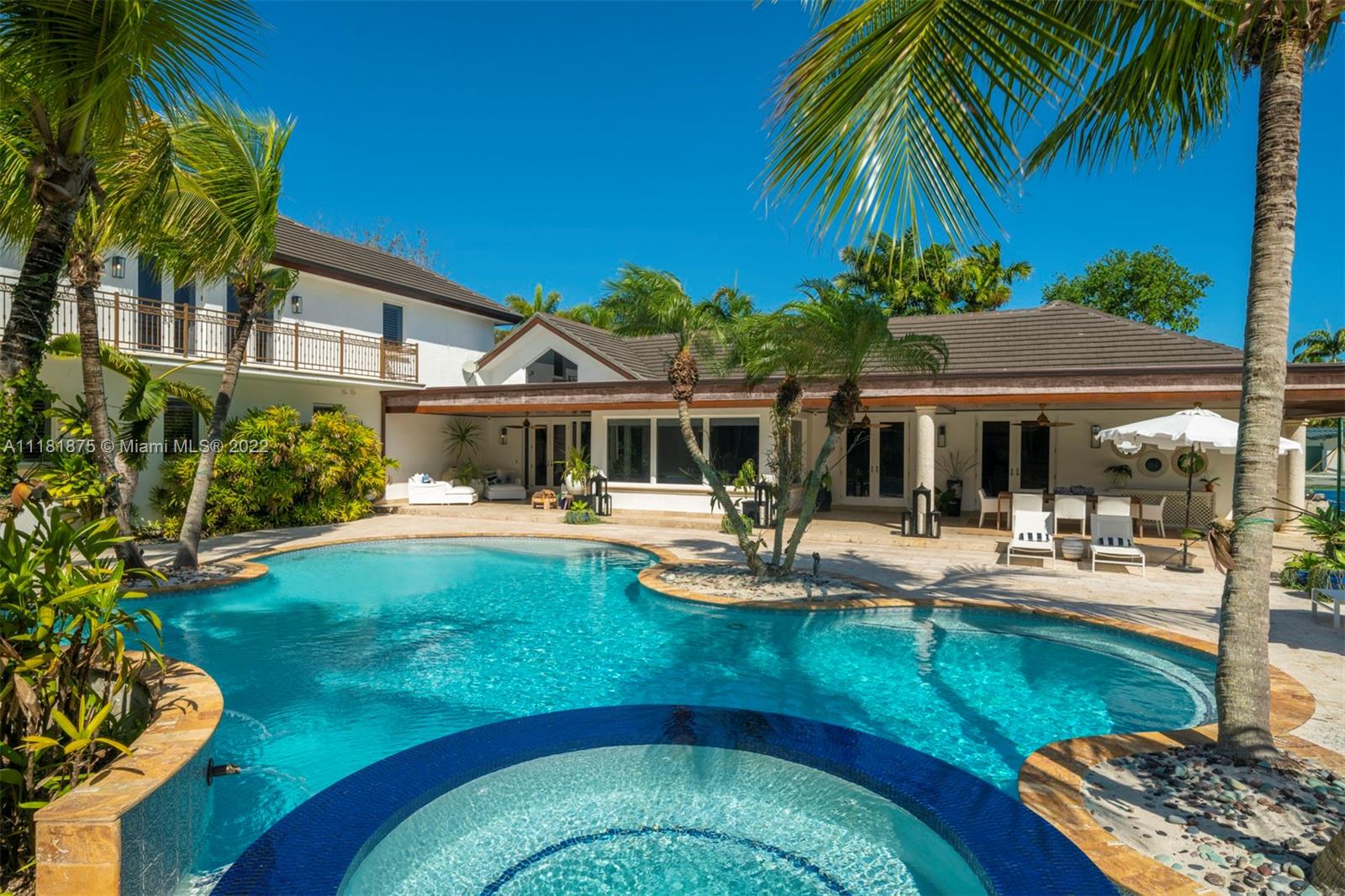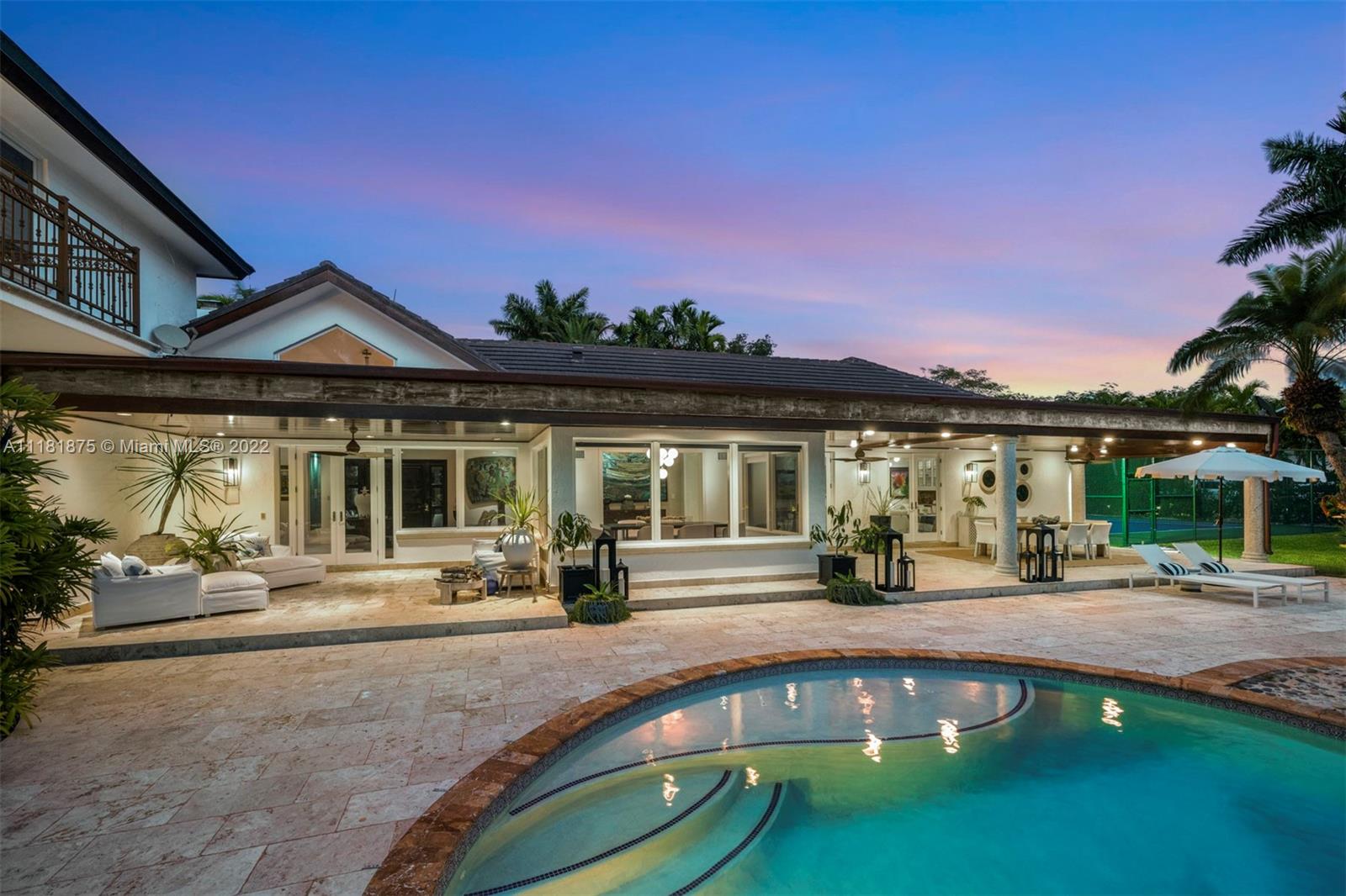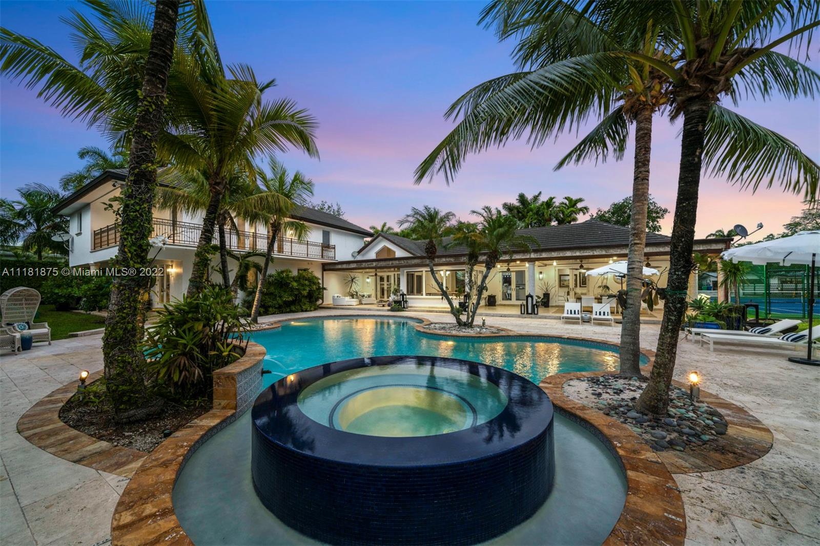 This exquisite 2-story retreat is a family dream home, featuring 6 BR, 6 BA and a myriad of contemporary comforts & conveniences. Designer details abound including custom millwork & vaulted cedar ceilings. The chef-style kitchen is replete w/ high-end appliances, finishes & a large island w/ quartzite countertops. The family room showcasing coffered ceilings features a wet bar & Sonos sound system. The owners’ suite is a standout w/ a large den, custom oak herringbone floors, a walk-in closet w/ granite island & French doors that open to a balcony. Likened to a resort-style oasis, the backyard stuns with a heated pool, optional saltwater system, large jacuzzi & tennis court. Additional features include impact windows, phone-activated sprinklers, security system & full-home generator.