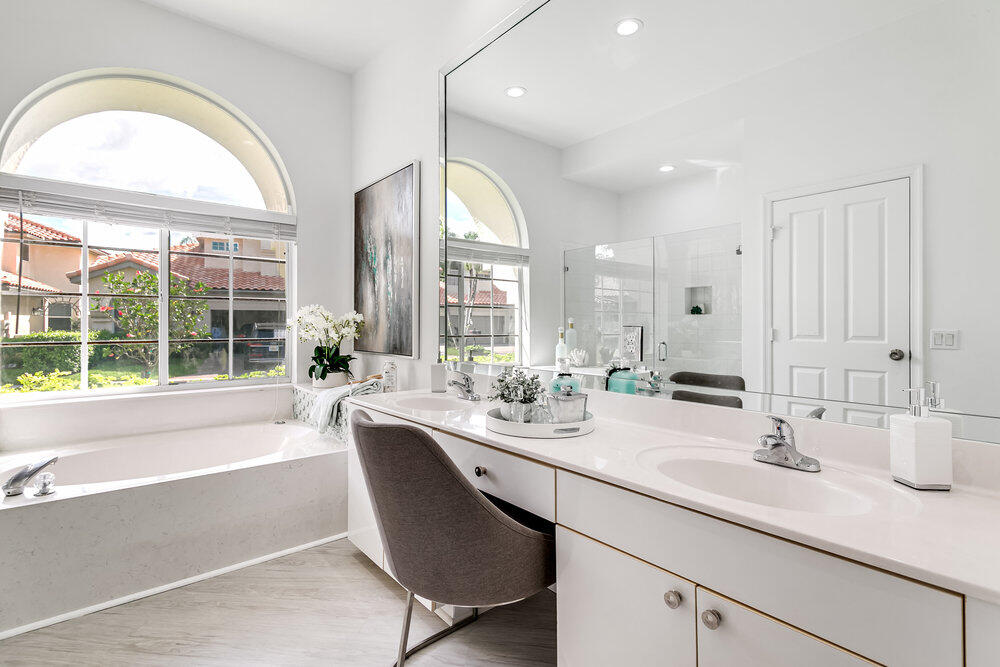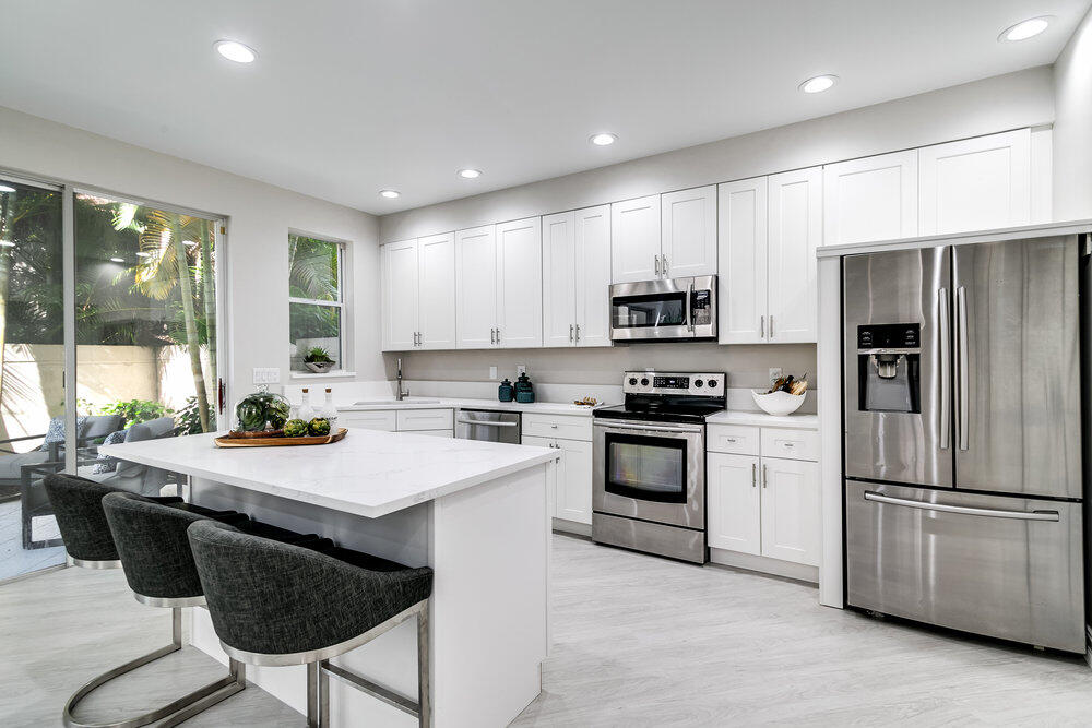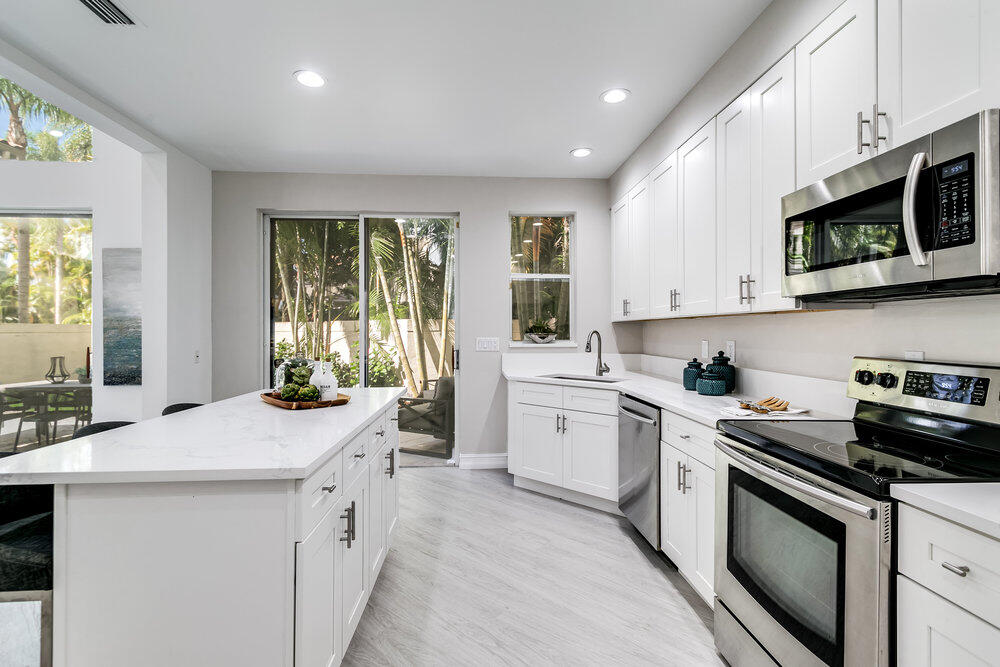 Welcome to Laurel Pointe within the prestigious, award-winning resort style community of Broken Sound Country Club. This highly coveted subdivision is just steps away from the new 100,000 sf clubhouse with indoor and outdoor dining and resort pool with bistro. Broken Sound also contains 23 tennis courts, 6 pickleball courts, a spa, fitness center, playground and two signature golf courses. This bright and spacious two-story home has just been renovated, containing 3 bedrooms and 3.5 baths. New Santorini Grey flooring throughout. Open concept kitchen with custom new cabinetry. Newly installed island with calacatta quartz counter throughout and newly built pantry with barn doors. Stainless steel appliances.The impressive Great room contains volume ceilings. Sliders open to a private