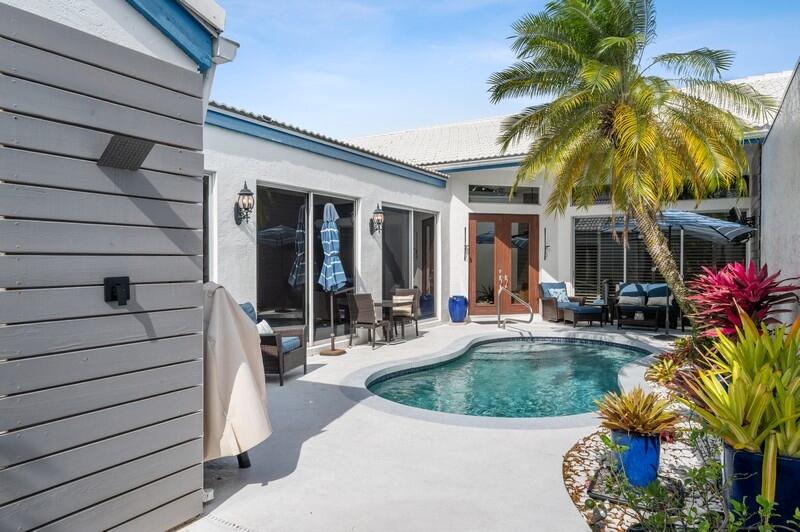 Stunning One-Story 3 Bed/2 Bath Courtyard home has everything to offer from an outdoor shower, built-in closets and hardwood floors throughout the main rooms. Enter paradise through the private courtyard with a landscaped garden. Gated community without any membership fee required.