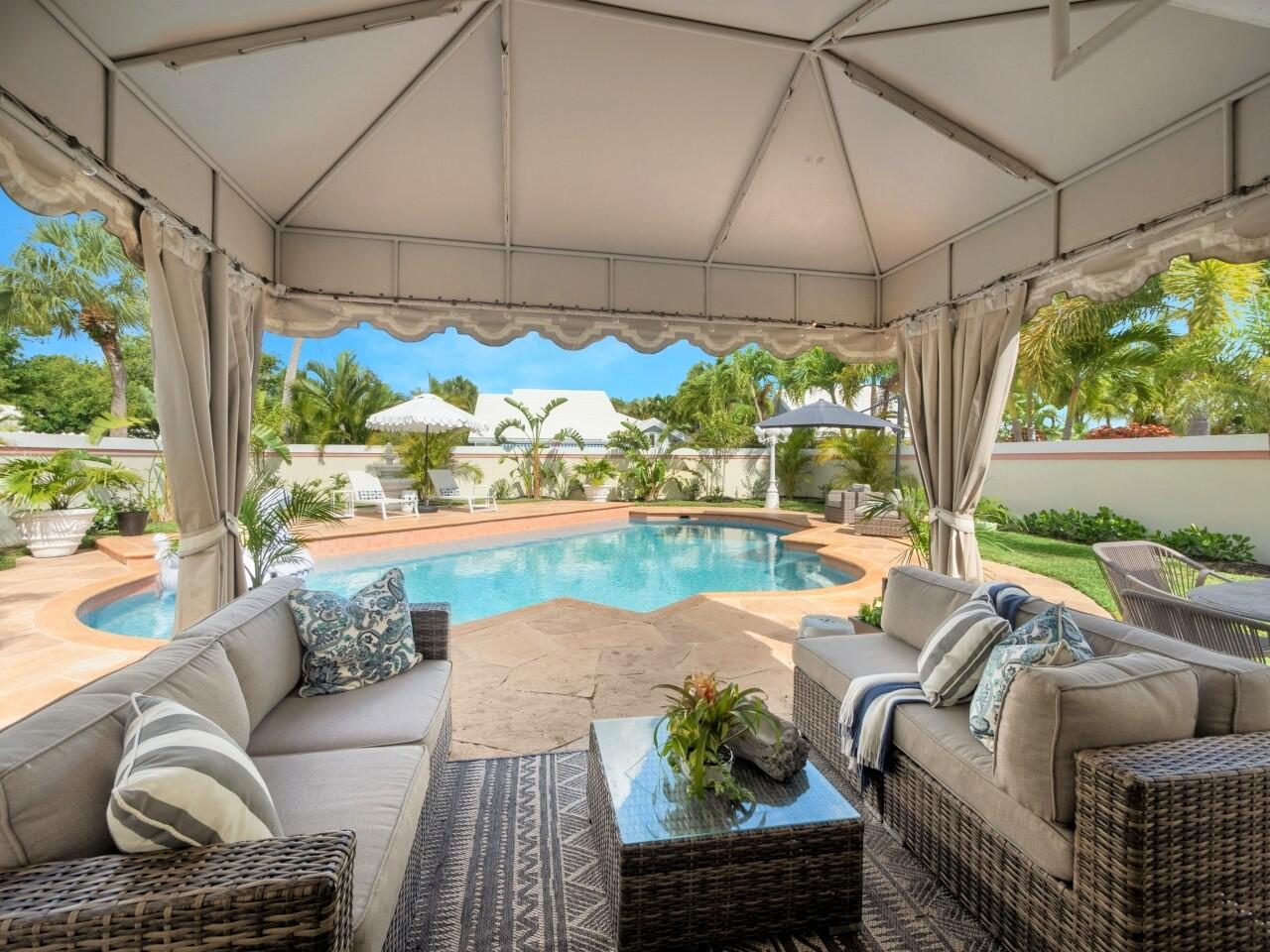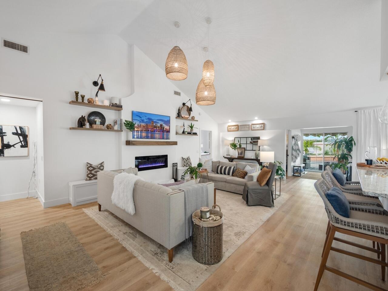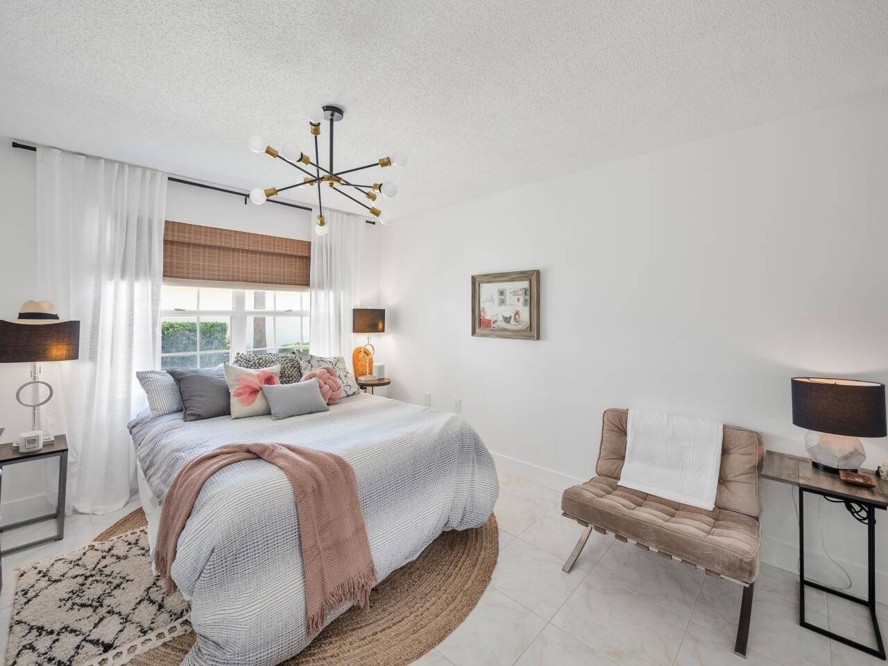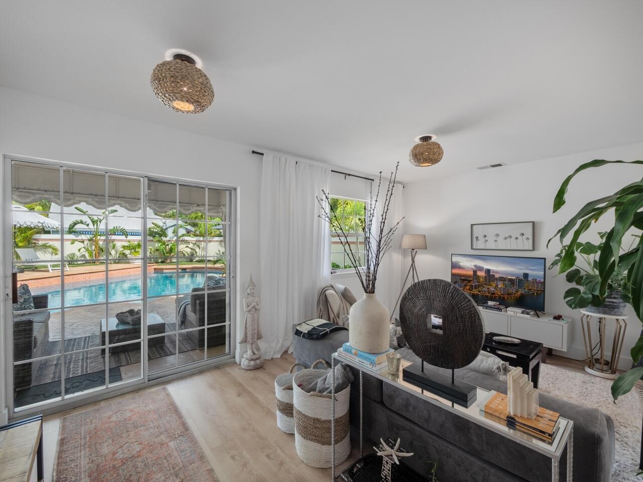 No detail has been overlooked in this absolutely stunning renovated pool home owned by an interior designer. Close to downtown, Rosemary Square, and the restaurants and shops of Palm Beach, and minutes to the ocean. The entire home has been reimagined from its original floor plan. This heated pool home sits on a large corner lot in the desirable gated golf course community of Bear Island. This is the Saratoga model, the larger of the two models in Bear Island, with 2271 square feet under air. The home is bright and light with 3 BRs, 2 baths, plus an office with split floor plan. White oak luxury vinyl plank flooring, all new designer transitional light fixtures, new baseboards and 5 panel custom doors throughout set the tone for the home. The living