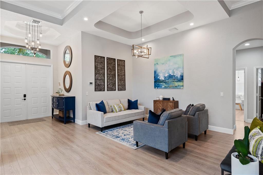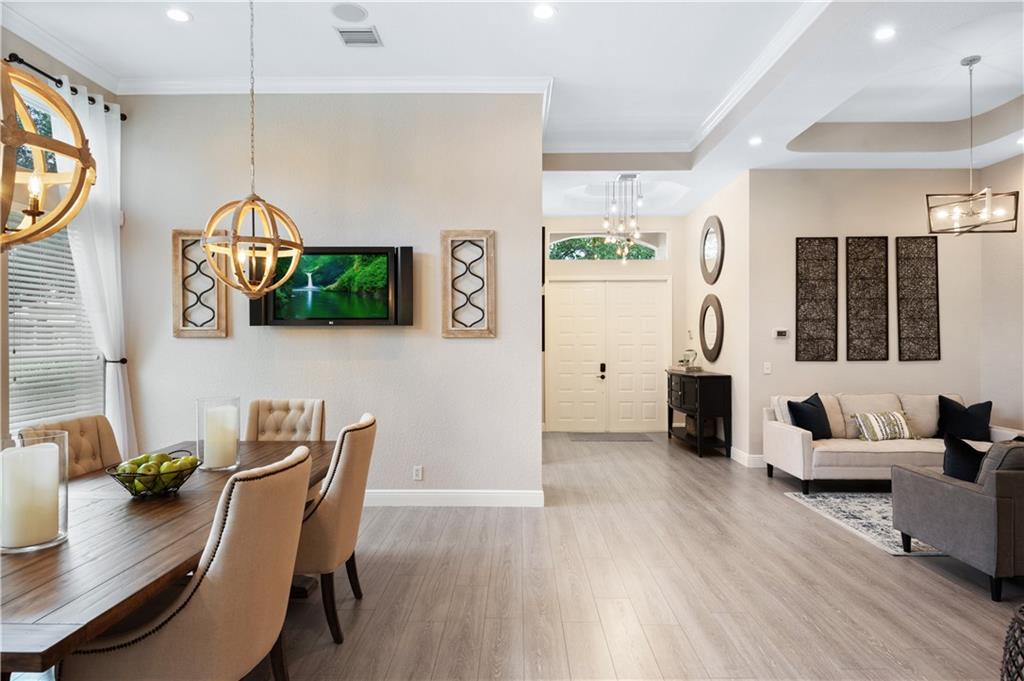 Stunning, turn key 4 bedroom (4th bedroom is currently used as an office), 3 full bathroom pool home located in the guard gated community of Grand Reserve. This home features an open floor plan with volume ceilings and an updated kitchen with white shaker cabinets, new quartz counter top, subway tile backsplash, a built in coffee bar, upgraded kitchen pantry shelving, GE Profile Stainless Steel Appliances. Laminate and tile flooring throughout with upgraded baseboards. Large master with a walk in closet, bathroom has dual sinks with a separate shower and tub. Screened in pool w/ salt water pool and travertine. Enjoy your fully fenced, private back yard w/ lots of green space and a fenced dog run w/ a gate to the main yard. Laundry room has 2 stackable washers and dryers with laundry sink.