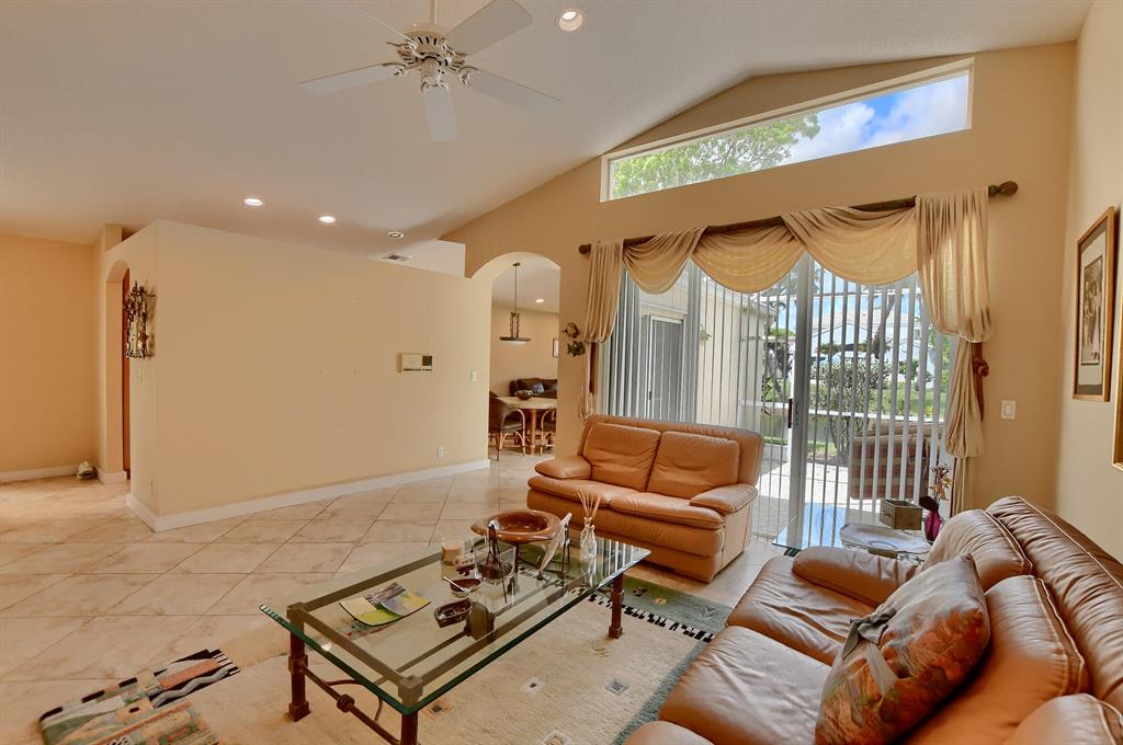 Lovingly maintained one story single family home available now in popular Palms at Boca Pointe. Enjoy the peaceful lake views from the screened in patio. Spacious floor plan with living room plus den off kitchen area. Kitchen updated with wood cabinets, granite counters, stainless steel appliances, and mosaic tile backsplash. Large master bedroom with huge walk in custom fitted closet and sliders to go out to patio. Master bath updated with replaced cabinet with double sinks, spa tub and updated shower. Accordion hurricane shutters throughout! Roof approximately 12 years old. Other features include tile floors through out home, custom closets, A/C 2015, easy access to backyard. Community has pool and 24 hour manned gate. Country club membership available, but not mandatory.