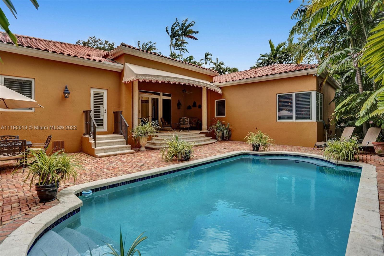 Stunning residence in a sought-after central Coral Gables area location awaits. An inviting foyer leads to a spacious living room, formal dining, entertainment room, and a large kitchen with cooking island with an informal dining area. The principal suite and two bedrooms with a hall bath are on one wing of the home; the 4th bedroom or office is opposite, with an adjacent hall/guest/cabana bath. Soaring ceilings throughout, and a bonus gardener's bath in the garage. Poolside, a covered terrace and pergola with a summer kitchen make the tropical outdoors quite inviting. Expanded and updated in 2002, the property offers a fabulous lifestyle in a desirable residential area, yet close to all the Downtown Gables amenities that our treasured City Beautiful offers.