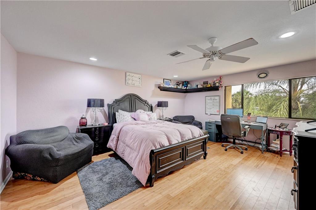 Beyond the manned gates of this quiet little community are tree-lined streets leading you to this 2-story, landscaped home on a beautiful canal-backed 1/2 acre. A few finishing touches can make this a polished gem. With 6 bedrooms, 5 having an en suite bthrm and a bedroom on the first floor, this home can be configured to your taste and needs. MBR has large adjoining room and balcony overlooking the water views. Vaulted ceilings, with wood beam details are gorgeous! Big pool in the back. Great space for entertaining as well. This house will not last! Plenty of parking on driveway and cul-de-sac. Call listing agent for showings. Highest and best offers only!