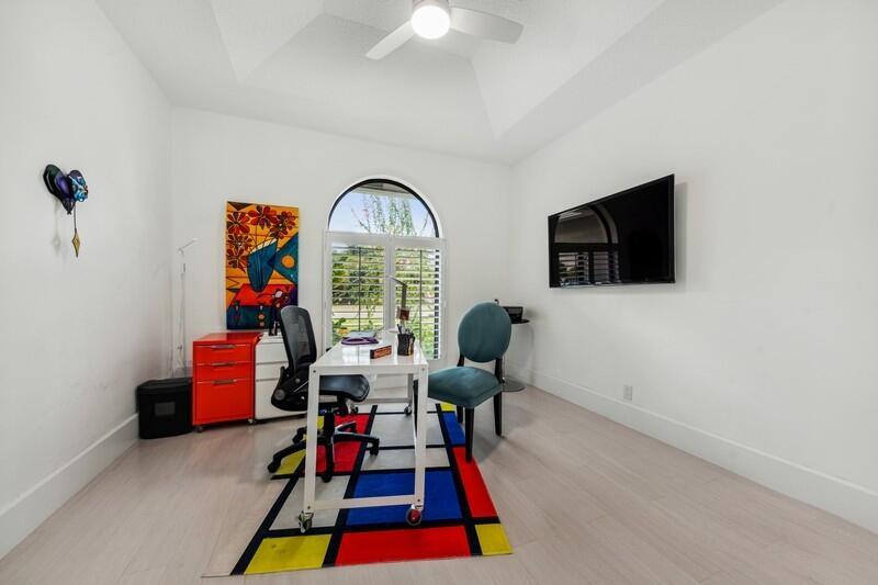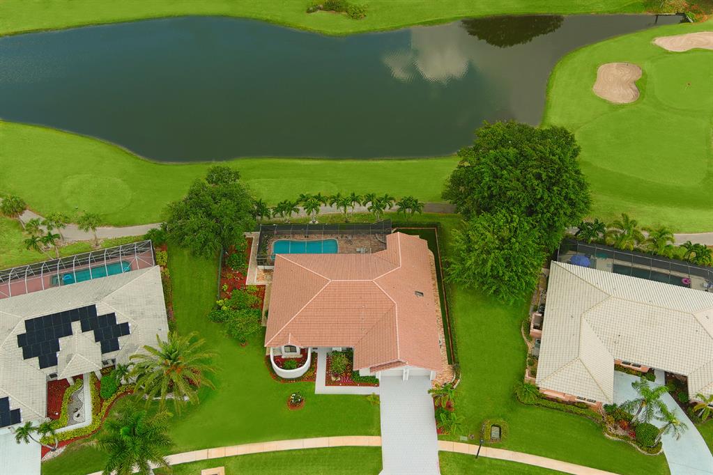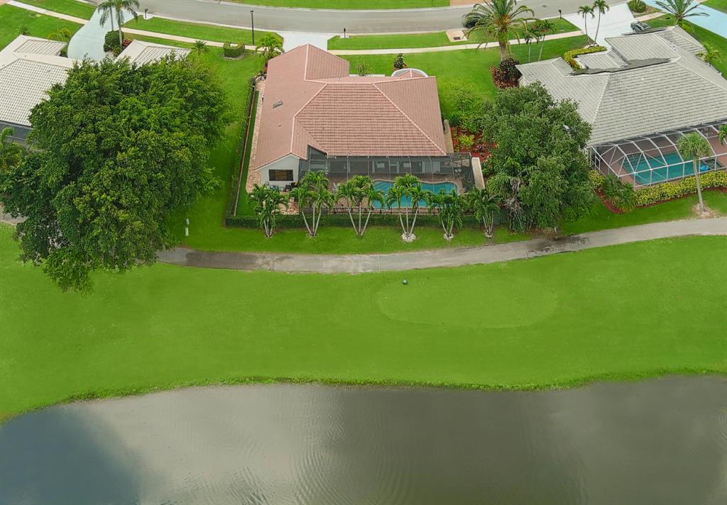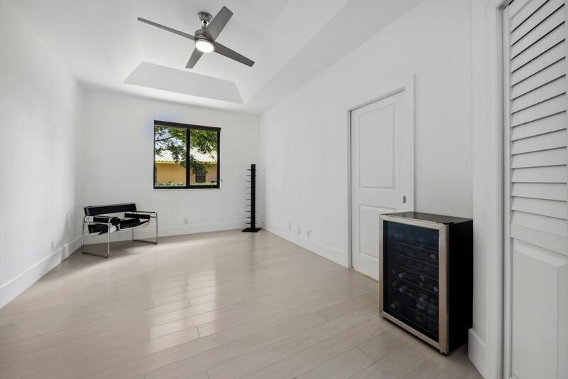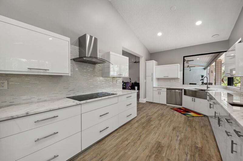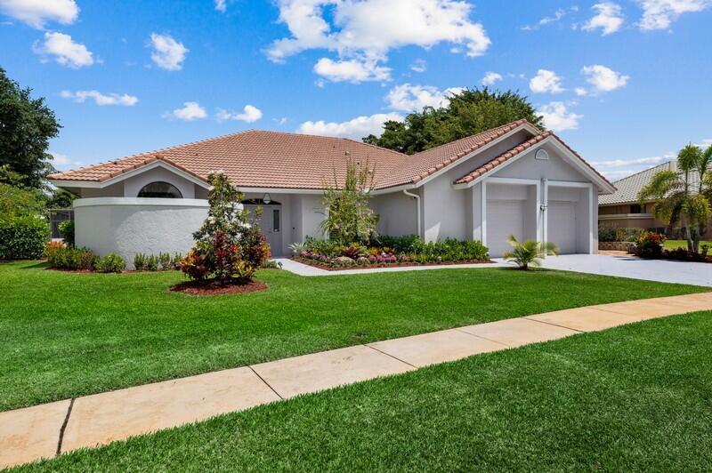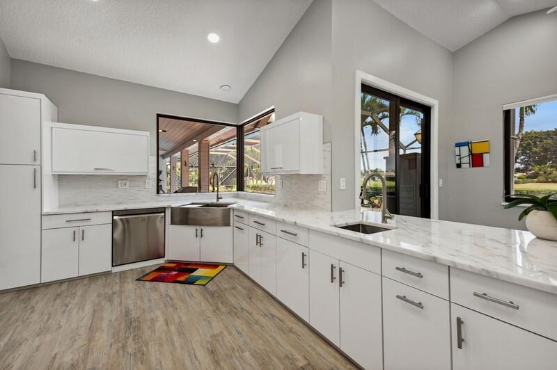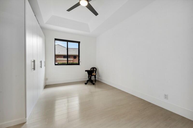 Your search for a truly turn key home is over. Elegantly situated on over 1/3 an acre in the Estate section of Boca Greens, this sprawling four bedroom, three and one half bath waterfront home has been meticulously redone with the highest taste and finishes. As you enter the open, sun-filled single story home you are greeted with soaring ceilings and stunning pool, lake, and golf course views through the French doors comprising the north side of the home. New wood floors and LED lights run throughout. The stunning eat-in chef's kitchen has been completely remodeled (2022) to include marble countertops, induction stove top, double wall oven, two sinks, and custom cabinetry. The private master suite includes a new custom double sink designer vanity (2022), oversized walk in closet, and