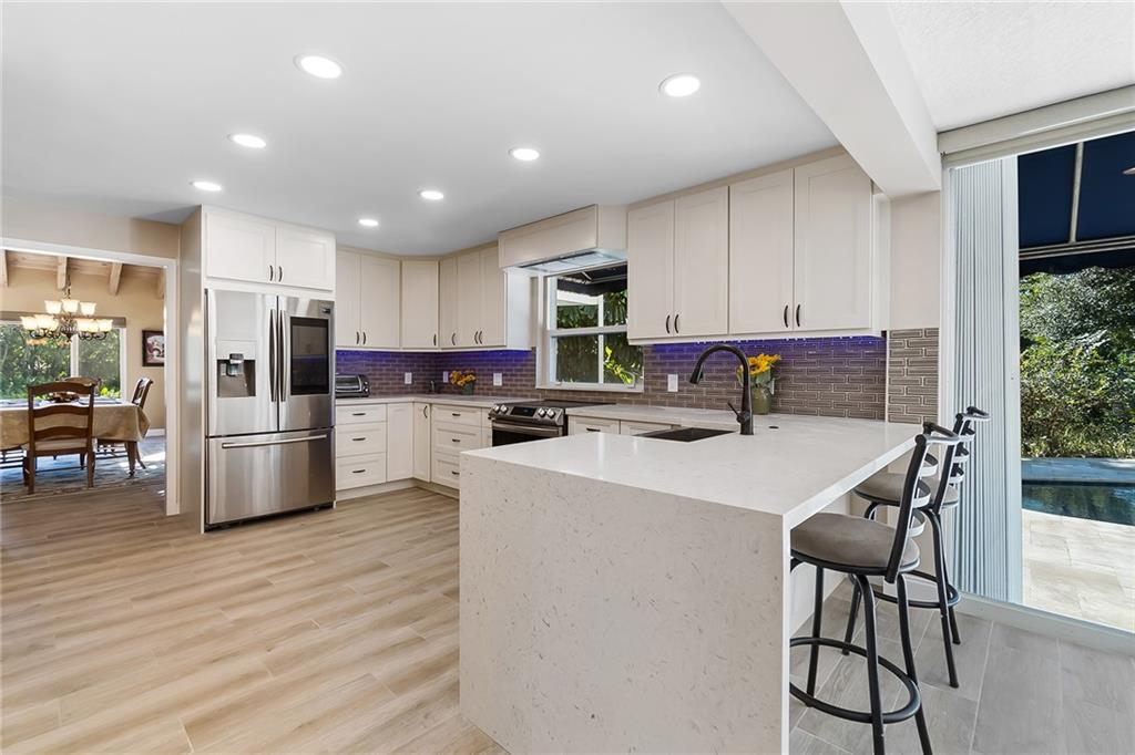 This beautifully updated home is located on a cul de sac street in the heart of Plantation Acres with an open floor plan perfect for entertaining! Floor to ceiling windows and vaulted ceilings throughout, allowing for a ton of natural lighting. A newer kitchen that was remodeled and modernized, including all new appliances. Split bedroom plan with two bedrooms downstairs and two bedrooms upstairs. New wood porcelain tile through living areas. Outside updates included pool remodel, outdoor kitchen, pool deck, landscaping, 2020 pool pump, new awnings, new windows, and a new garage door. This home even has a private pond nestled on a canal for free irrigation.