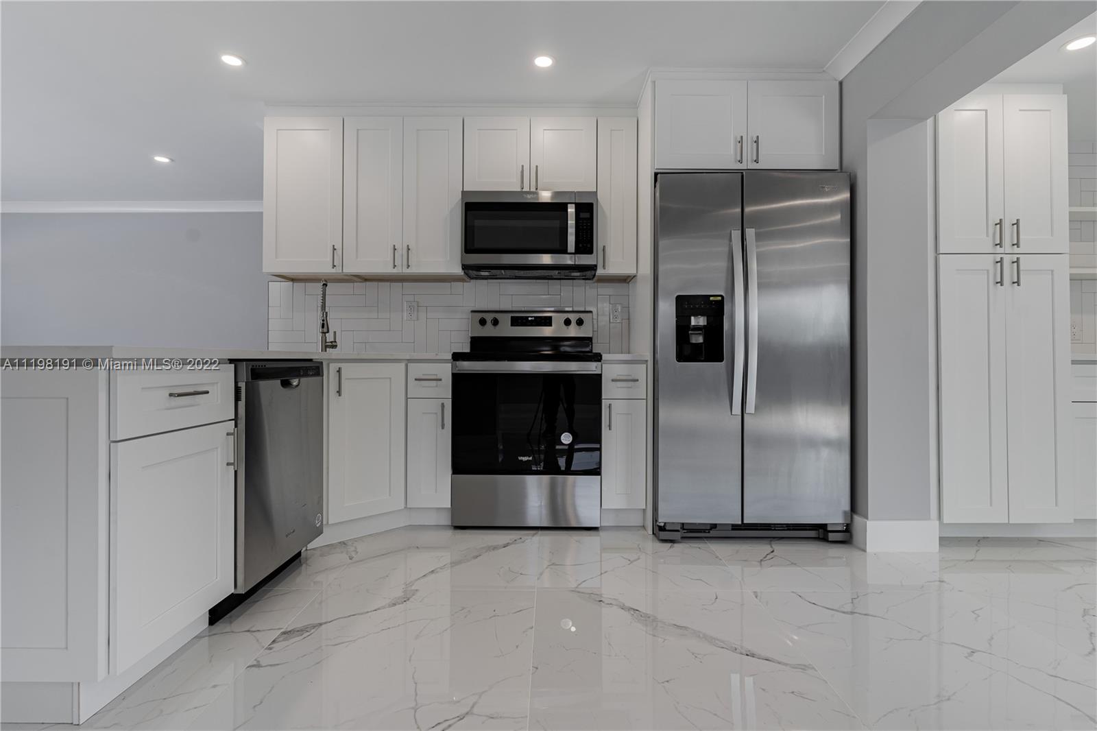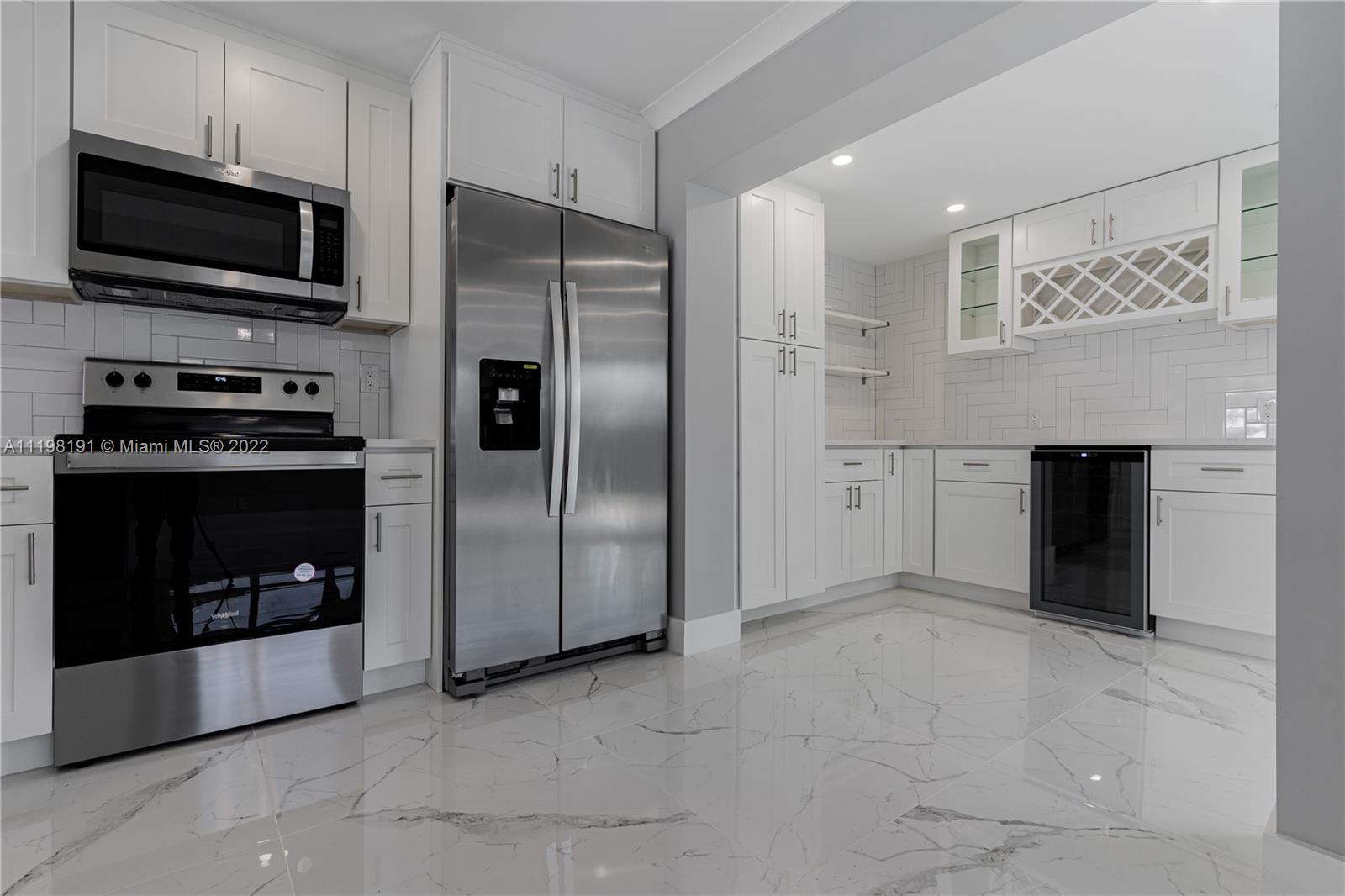This gem will be hard to find again and will go fast! The home was updated completely with really good taste and high end materials. Since you open the door you are welcoming with a Porcelain Carrara floors in the entire home, the open kitchen face the living and dinning area perfect for entertaining. All kitchen and Laundry appliances are brand new and beautiful combined with the backsplash and countertop, we have added a wine cooler ready for your party!. The Rooms have good sizes and the master is located at the other side of the home for privacy. Showers with rain style and decent size. The home has natural, newer water heater and newer A/C. The outside area is completely fenced for privacy, new grass and paver patio.