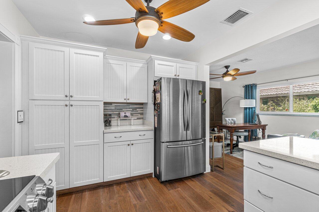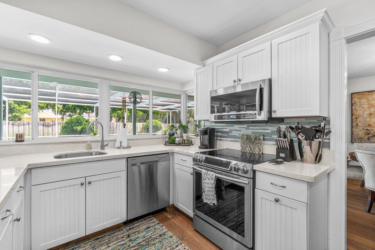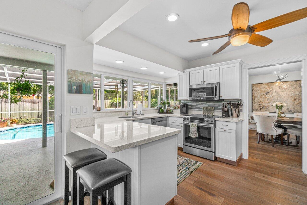 This spacious 2 bedroom home with additional office-den-family room in Camino Gardens is charming, renovated and move-in ready! Situated on a quiet street with no through traffic, mature landscaping, and great neighbors. Home features porcelain tile flooring throughout, remodeled kitchen with stainless steel appliances, updated bathrooms, and impact windows and doors. Primary bedroom boasts a custom closet and en-suite bathroom that doubles as a cabana bath. Spacious backyard with a screened in pool and expansive patio are perfect for entertaining, playing, or relaxing in your private oasis. Camino Gardens is a manicured and sought-after East Boca neighborhood in close proximity to A-Rated schools, beaches, shopping, restaurants, parks, golf and tennis.