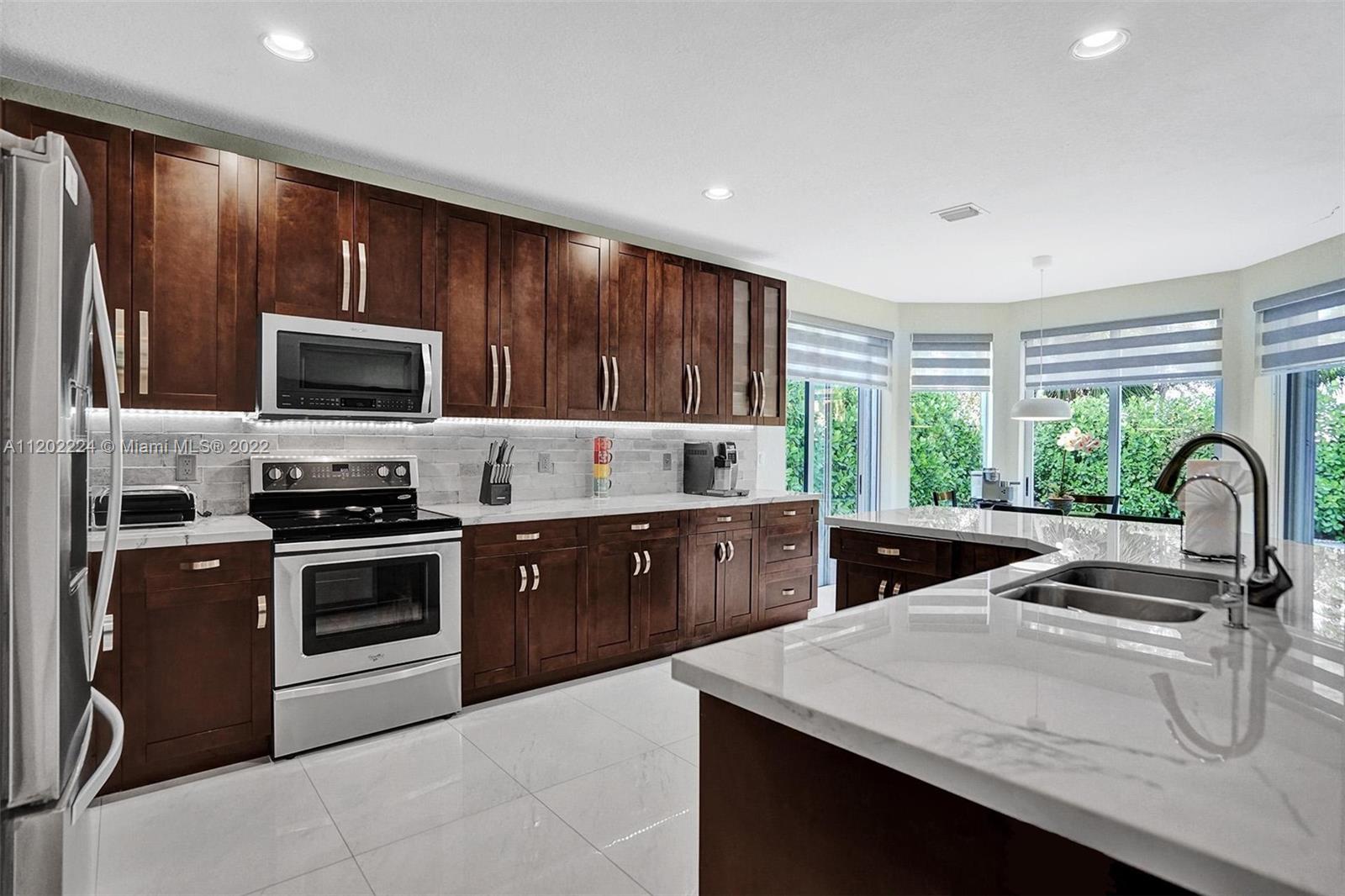 Stunning single family home in sought after Doral Isles/ St Croix community. Huge 5 bedroom,3 bathroom, 3 car garage floorplan. Boasting over 3700 Sq. ft. One full 1 bedroom and 1 bathroom downstairs. Flooring beautifully redone with porcelain tile downstairs and and upstairs. All stainless steel kitchen appliances, kitchen and bathrooms cabinets and countertops tastefully remodeled with a modern touch. Home protected by accordion shutters, great insurance savings. Pavers all around home exterior. Enjoy a resort style neighborhood with amenities such as a clubhouse with a restaurant, pool, gym, tennis court, basketball court, and soccer field. No association approval required. See brokers remarks.
