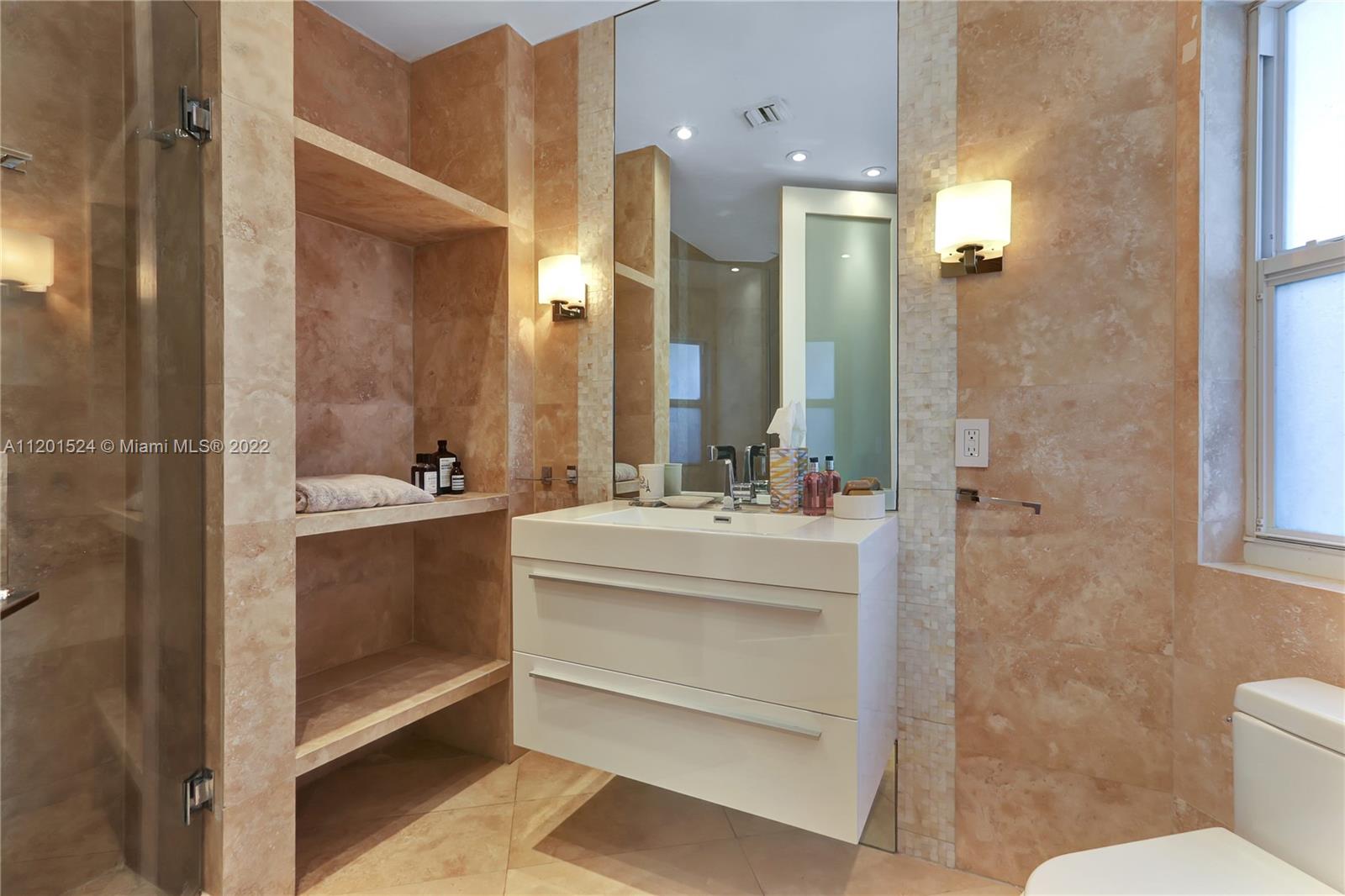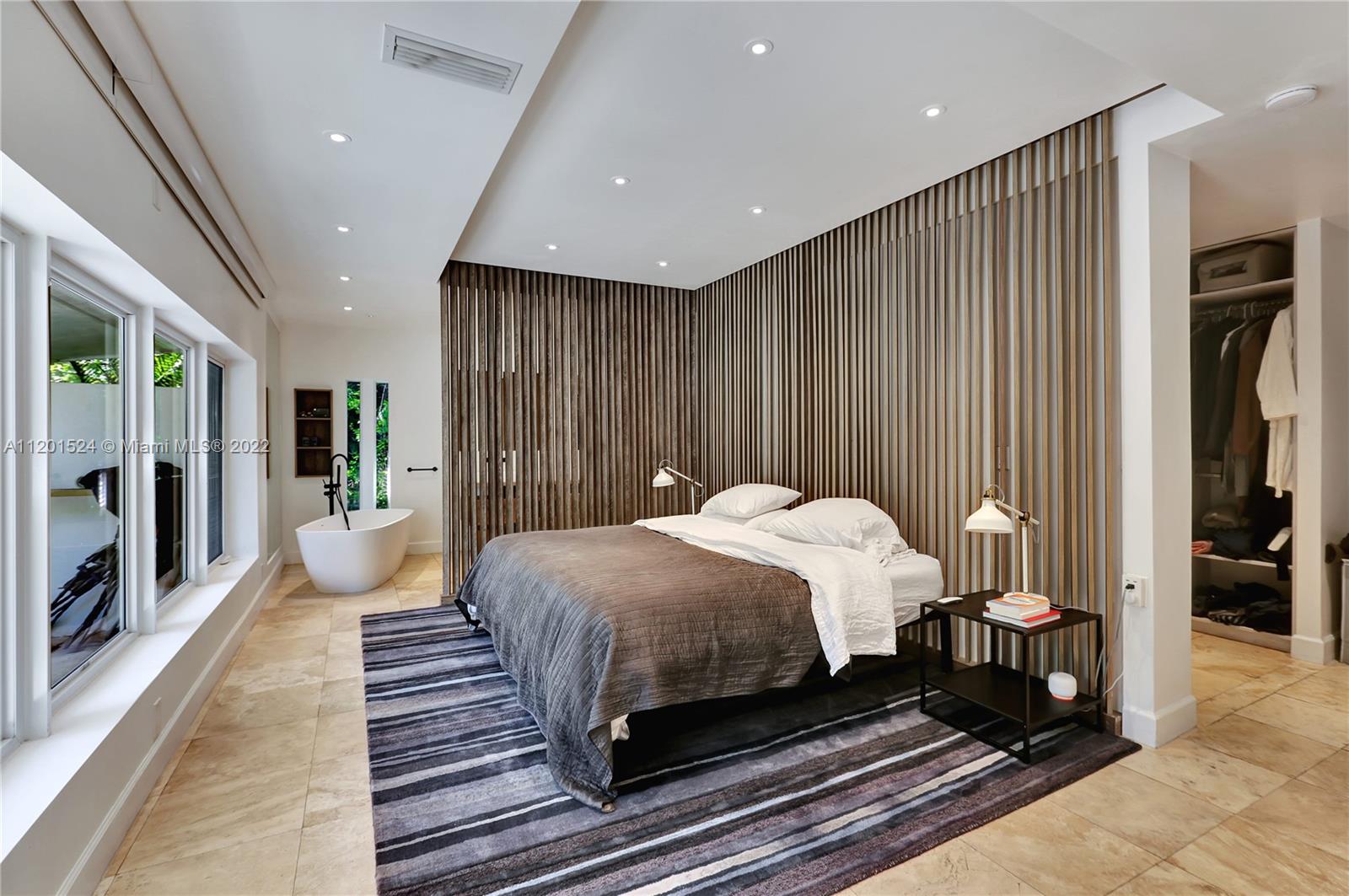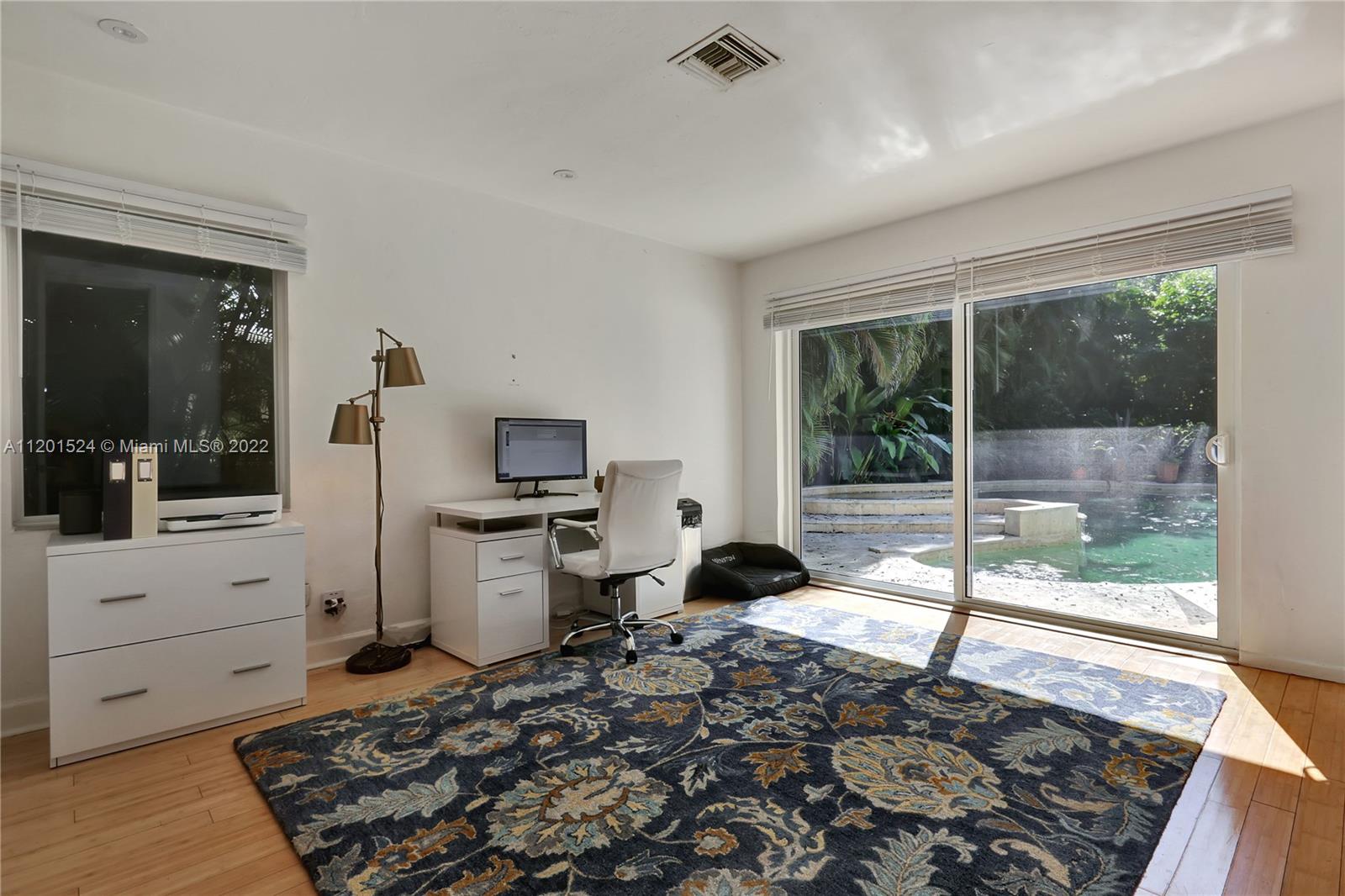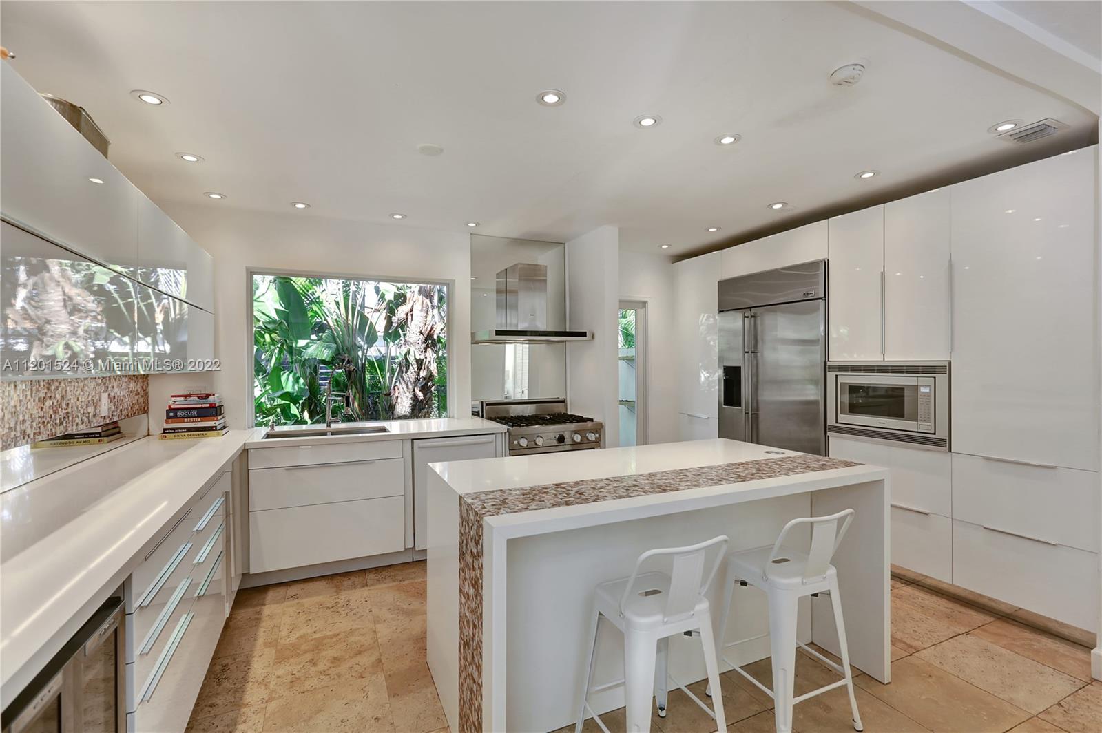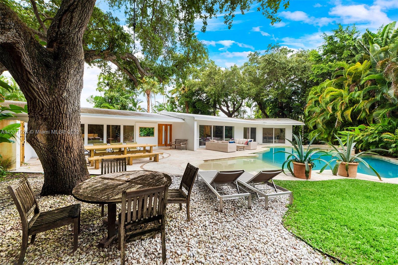 Beautifully updated, 2,464 SF, 4 bedroom, 3 bathroom, midcentury modern home in the most prestigious part of Miami Shores. This private, tropical, 12K+ SF lot sits under majestic oaks overlooking a heated, free-form pool with jacuzzi, and waterfall. The open floor plan features large rooms with floor-to-ceiling impact sliding doors throughout that exaggerate the lush greenery that surrounds the residence for a true indoor/outdoor living experience. Gourmet kitchen with quartz countertops and VIKING gas stove. The previous owners converted the 2 car garage into the new master wing with permits, it features luxurious walk-thru closet, custom dual sink vanity, oversized shower, and separate extra-large soaking tub with a view of your private tropical oasis! 2 A/C units Gas water heater!