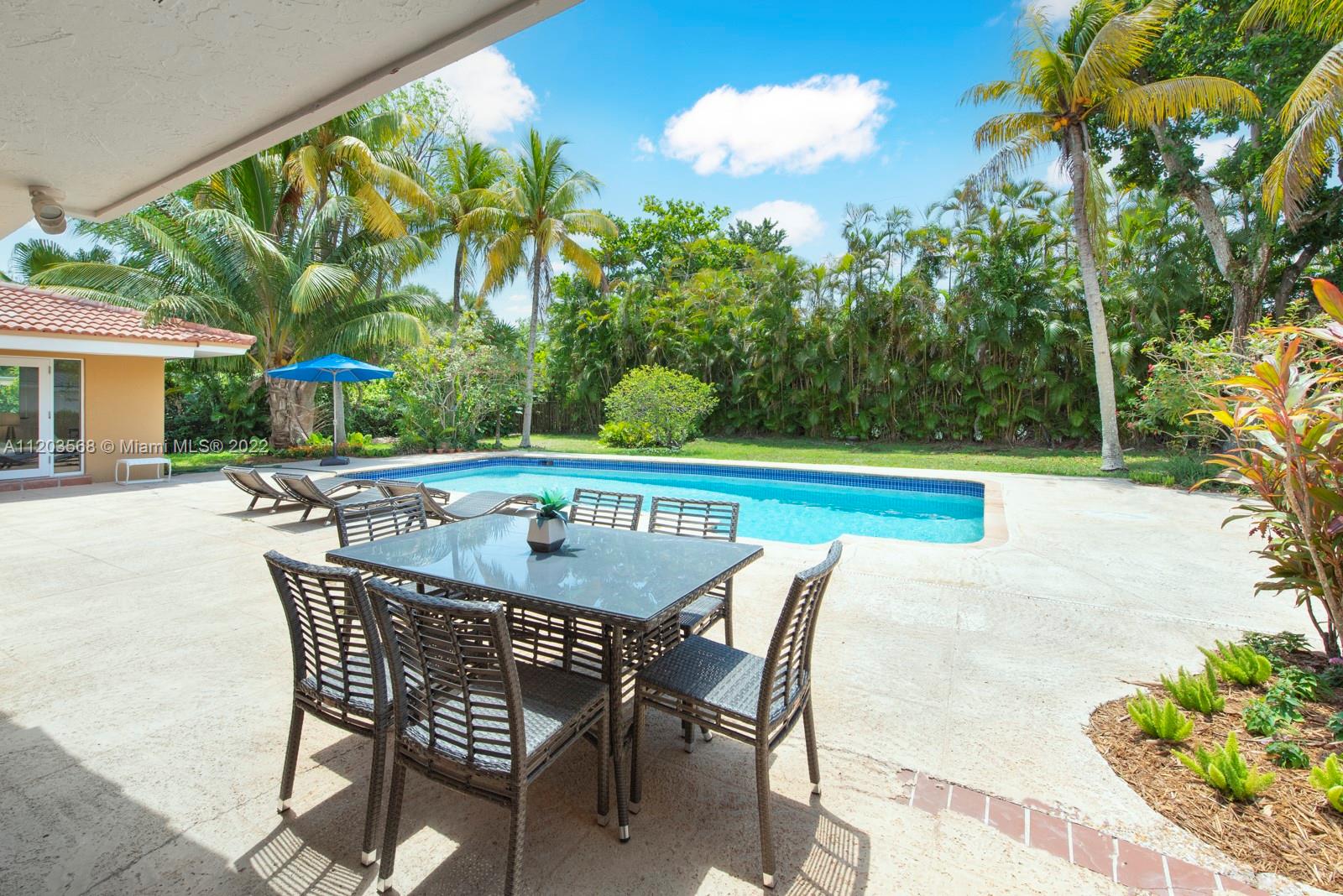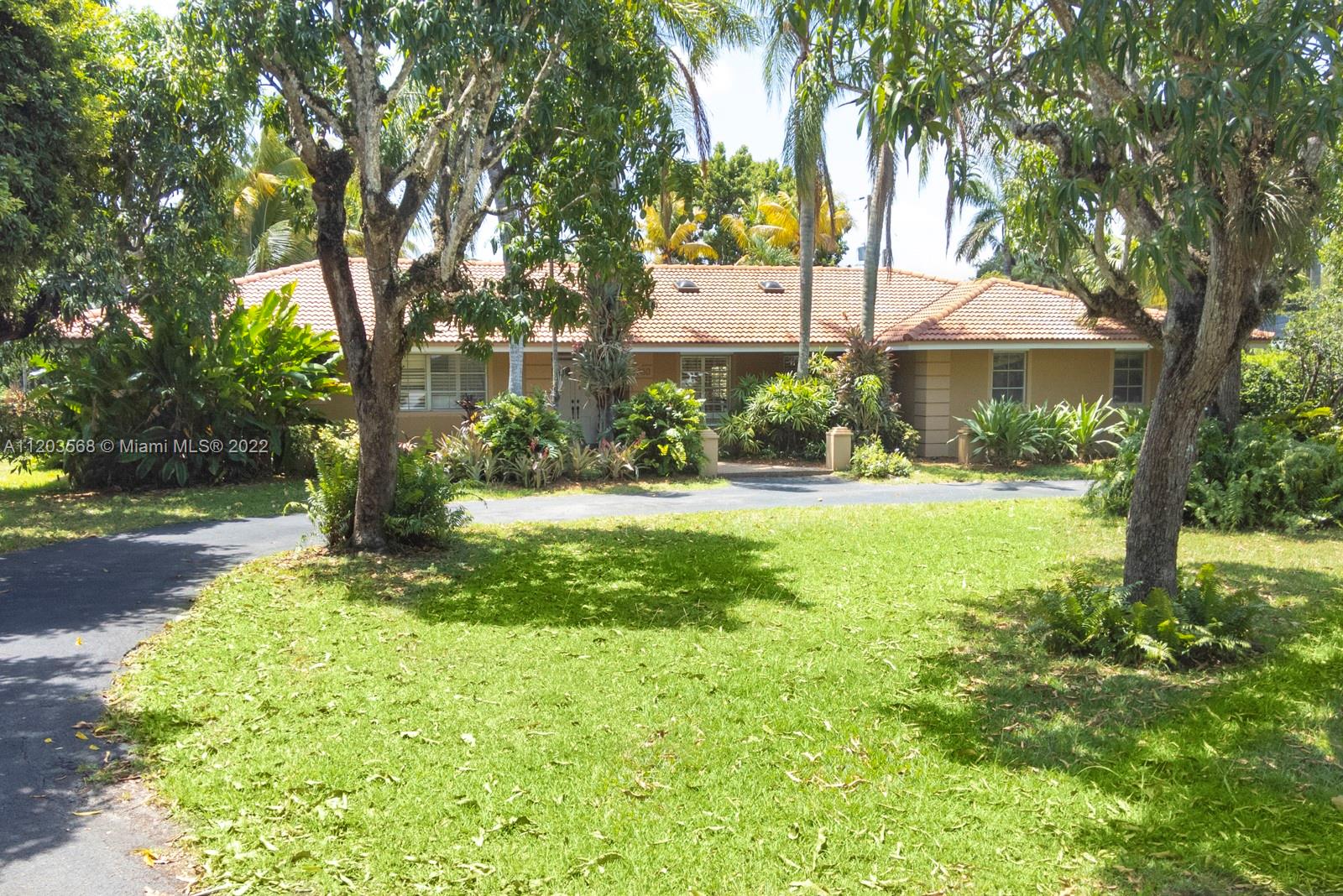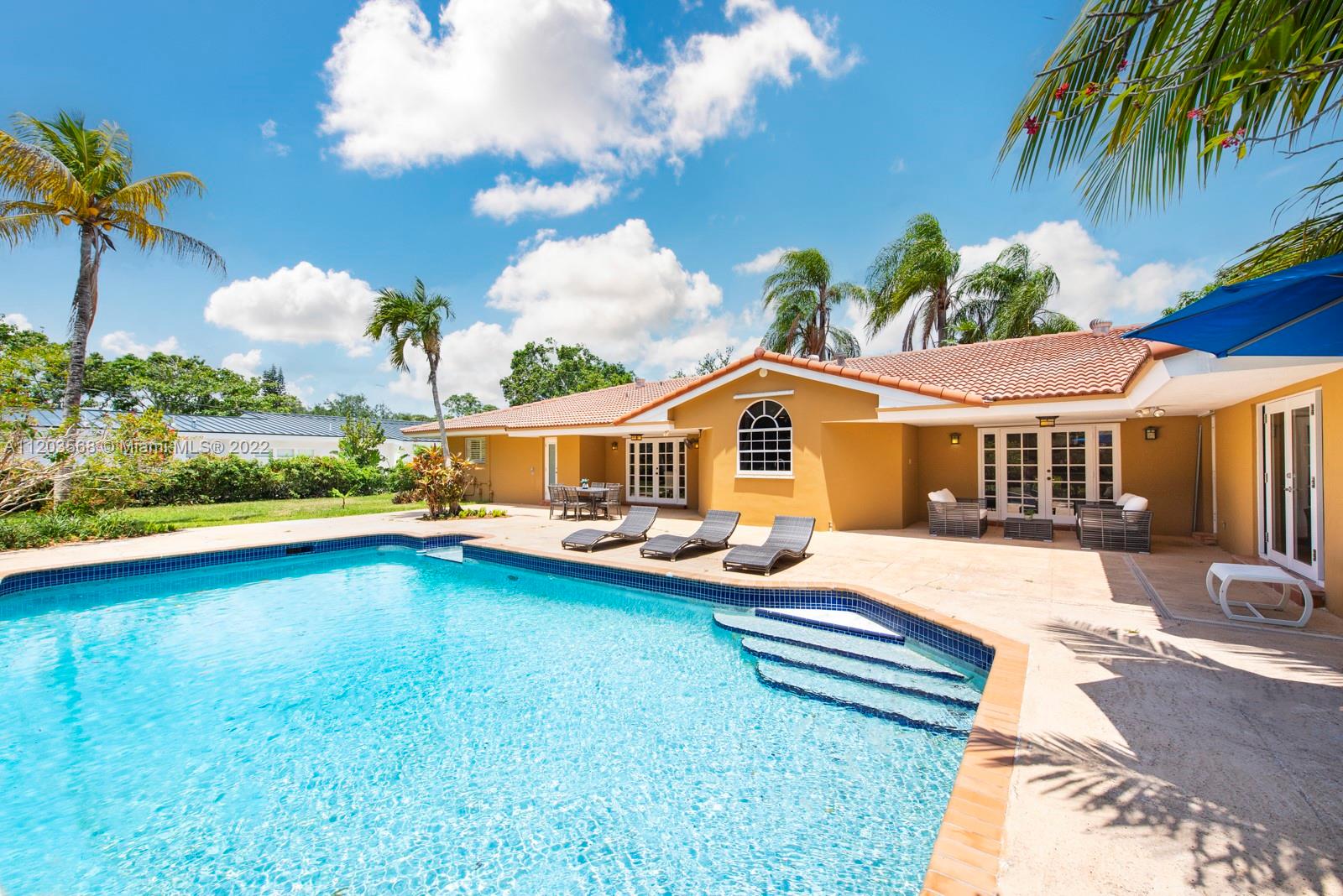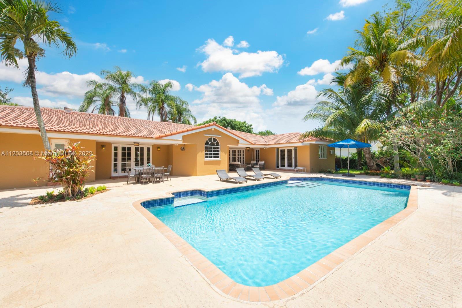 Sought after and rarely found 5-bedroom family home on an oversized half acre lot on quiet no traffic North Pinecrest street. Split plan, tile roof, enlarged wood kitchen, wood flooring in bedrooms, 2 skylights. Great layout with 2-car garage, deep pool, large cantilevered overhang (no columns) , big yard and privacy. Hurricane shutters throughout (some impact glass windows) , flood zone "x" so no flood insurance required. Pinecrest Elementary.