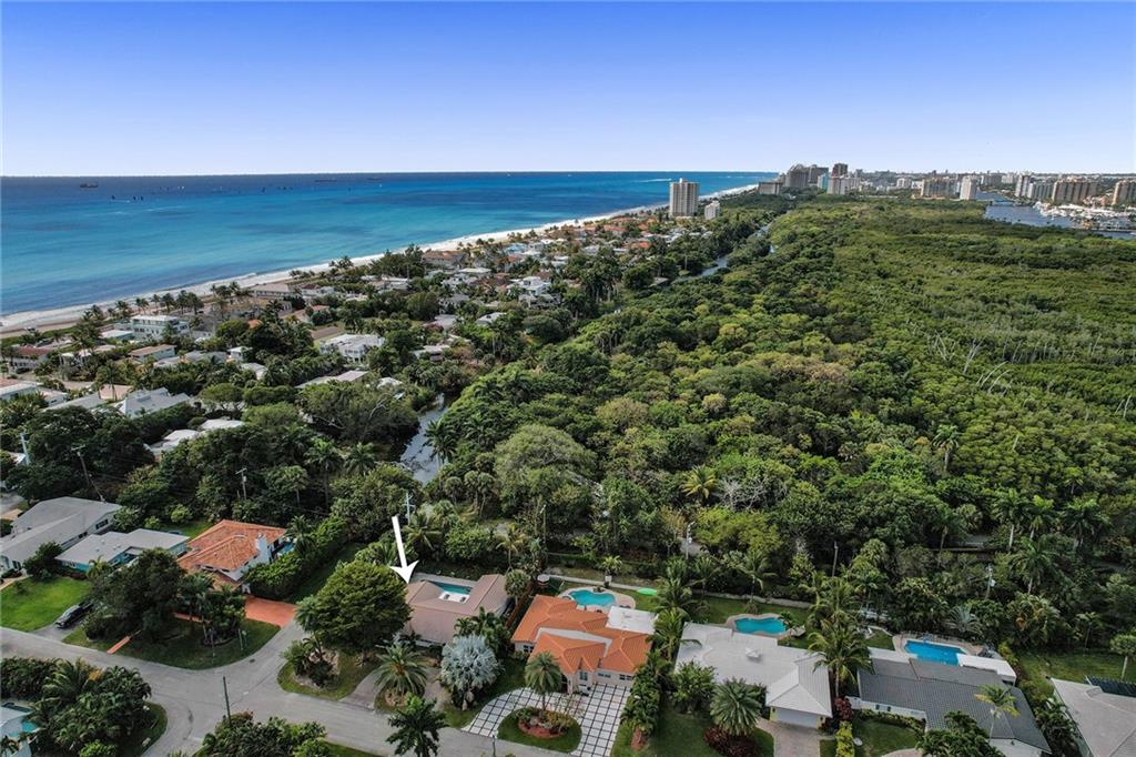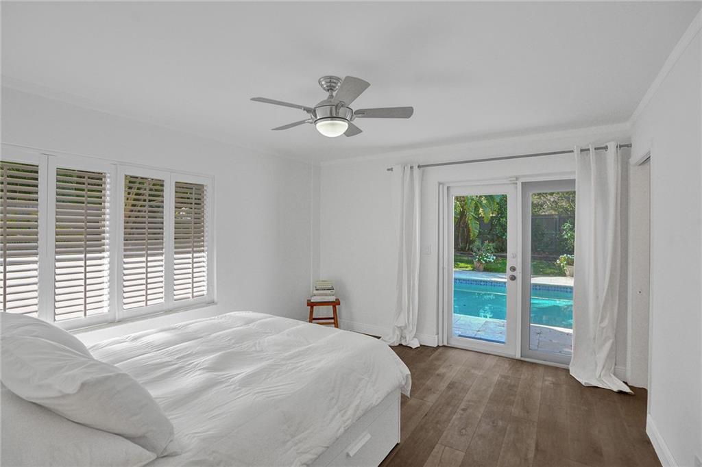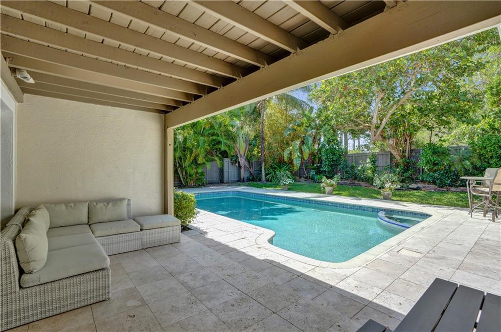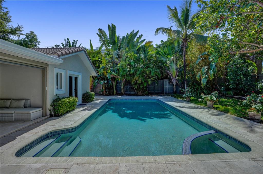 Nestled between the Atlantic Ocean and the Intracoastal, this beautiful and tastefully updated home is located in the sought-after and quiet beach side neighborhood of Dolphin Isles. Spacious open kitchen w/ granite counters and stainless appliances, impact glass throughout, stylish updated bathrooms and a cool combination of tile and wood flooring. Wonderful 3/3 floor plan with dual primary bedroom suites, both offer direct access and views to the oversized and totally private garden that adjoins Birch State park. Relax on your spacious lanai or cool down in the resort style salt water pool and spa. This unique corner lot offers total privacy with no neighbors to the east or to the south and boasts private neighborhood gate access to the park just a few feet away. Bayview school district!