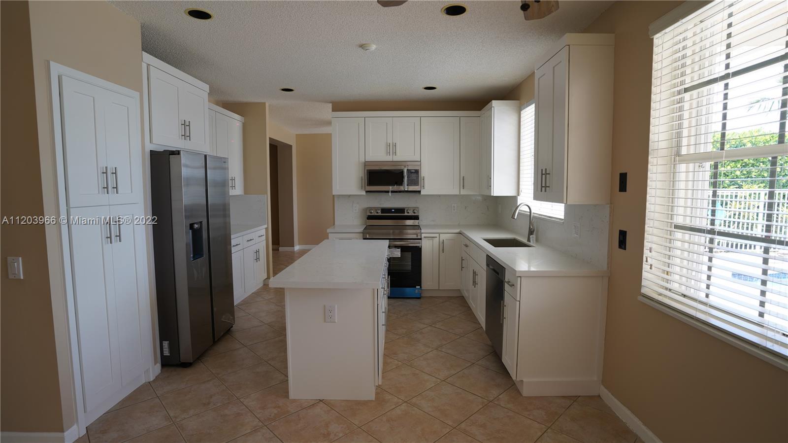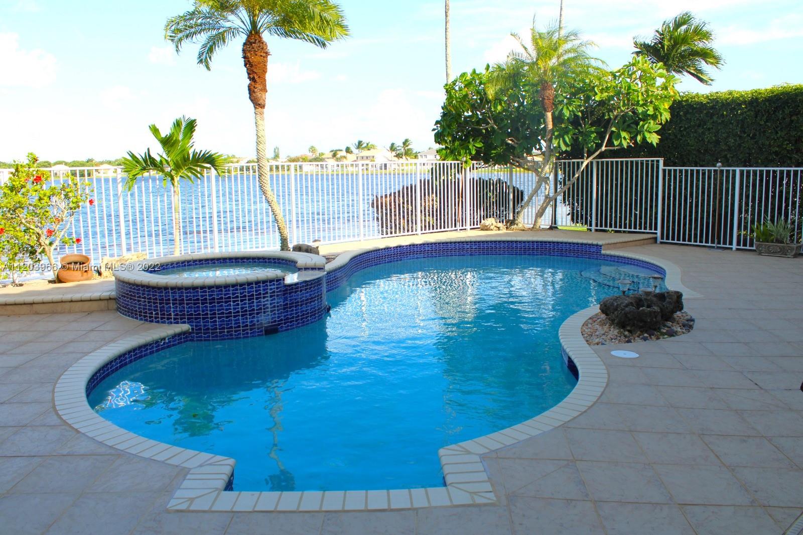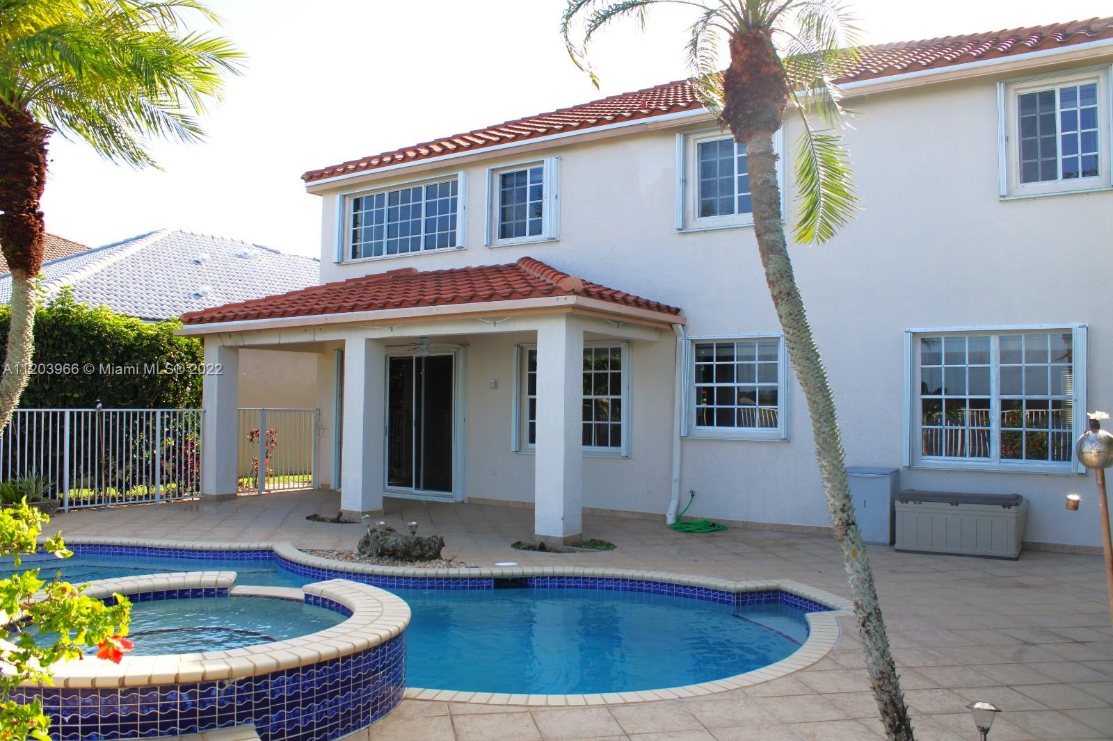 PRICE REDUCED! This spectacular home is found in the well sought-after neighborhood of The Meadows in Weston. This beautiful lake-front home has 5 bds + den, 3 ba, and 3-cg. Take in stunning views from the fenced-in brick patio while enjoying the heated pool and spa with waterfall feature. You’ll find gorgeous bamboo hardwood floors on the second floor and tile throughout the first floor. The bathrooms have granite countertops with seamless showers. The kitchen was just upgraded with brand new white cabinets, granite countertops, and stainless-steel appliances. Move-in ready. Roof-2018; A/C-2015. Located close to restaurants, shops, parks, and A+ schools. HOA includes manned gate for entrance, community swimming pool with adjoining clubhouse, children’s playground, and basketball court.