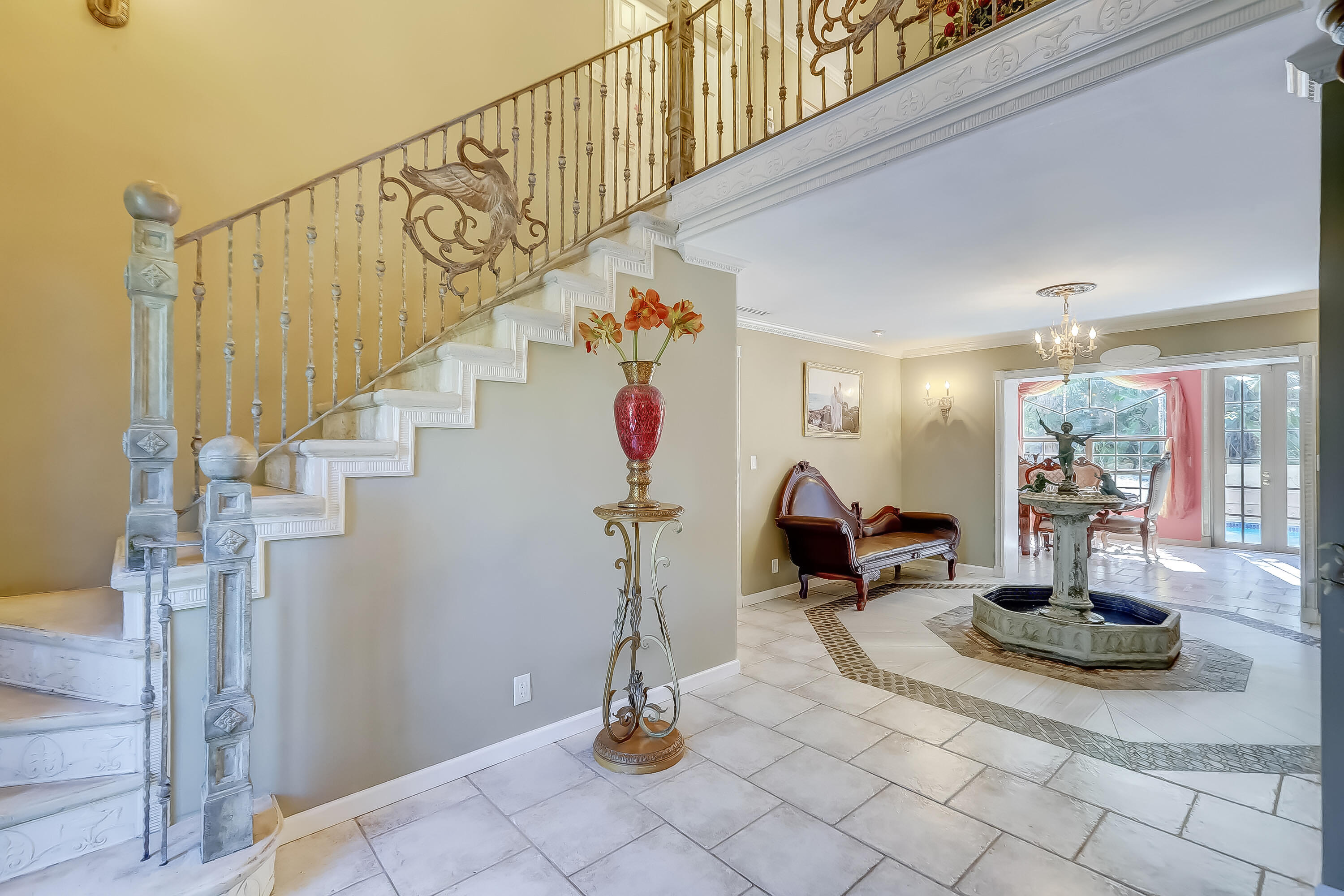 An enchanting and private stately European inspired home. Dramatic architectural features include a gallery foyer, formal dining room, ballroom sized living room, beautiful gardens, flowing water fountains, and a pool & spa area Designed for entertaining. This corner property sits on almost 13,000 s/f and is surrounded by mature hedges for privacy. This home features fine woods, custom iron work, detailed moldings, volume ceilings, a 4 yr old roof, a bonus loft room, (or 5th bedroom) an expansive private office, large laundry room, 2 car garage, & ample driveway space. The location is second to none! Nestled in the private gated community of Sunrise Intracoastal, walk to the beach and minutes to the yacht club marina. Amazing location! Make this estate your forever home