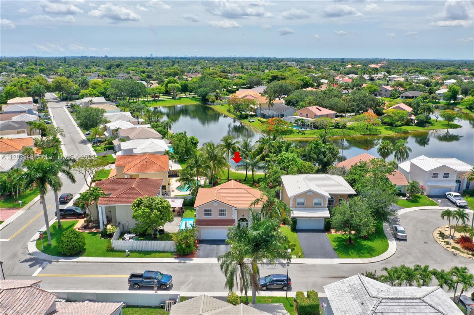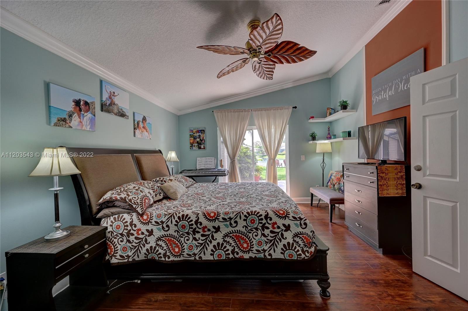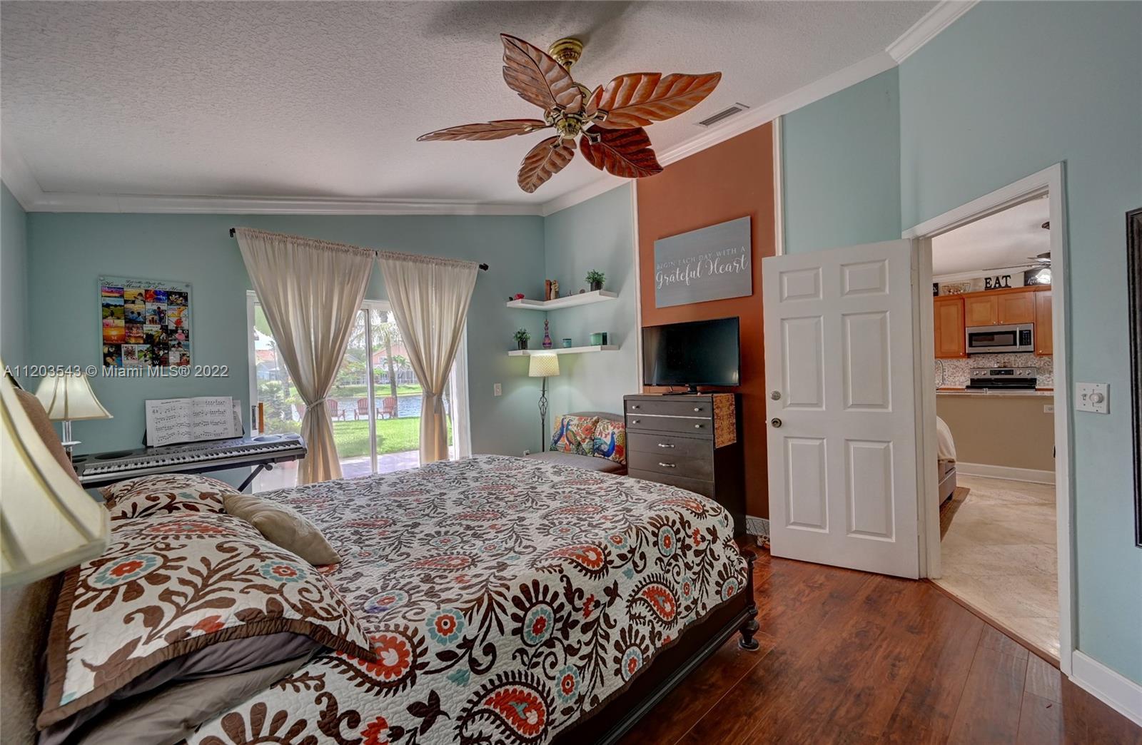 Rarely Available Wedgewood Cove in Shenandoah! Lake view on a cul-de-sac! Well maintained 2 story 4/2.5 with the master on the first floor. Updated kitchen with quartz counters and stainless appliances. Updated bathrooms as well. Open living space with crown molding, natural stone floors. Upstairs and back patio have accordion shutters, hurricane glass in living room. Roof was replaced in 2010. The attached garage has been made into a gym (equipment is negotiable); but can easily be converted back to garage. Washer/dryer stay and the shed in the back yard and the yard equipment inside are negotiable as well. Beautiful landscaping to go with the beautiful view and the landscape lighting enhances the outdoor space. Showing on Thursday and Friday May 19 and 20, open house on Saturday May 21.