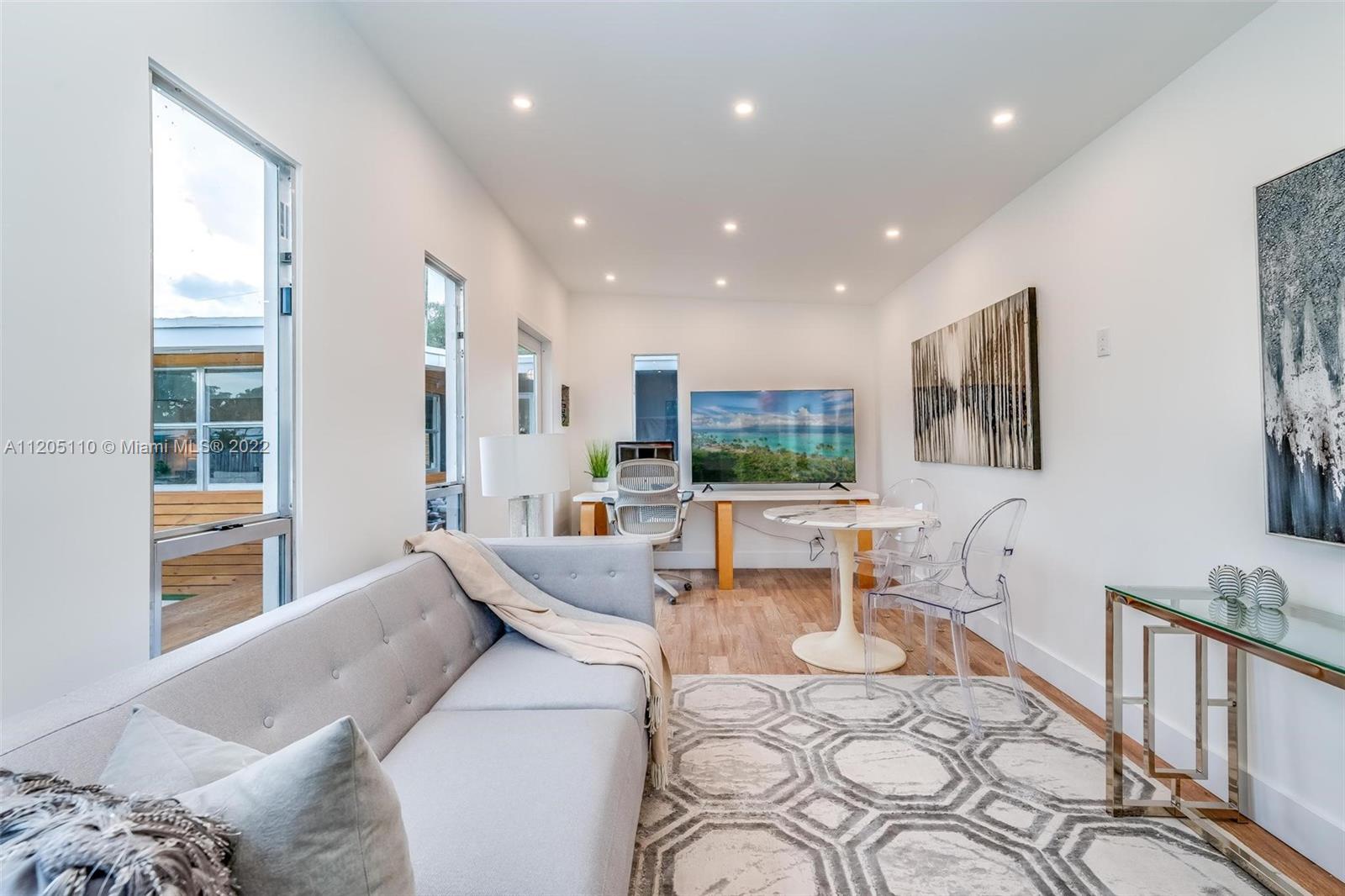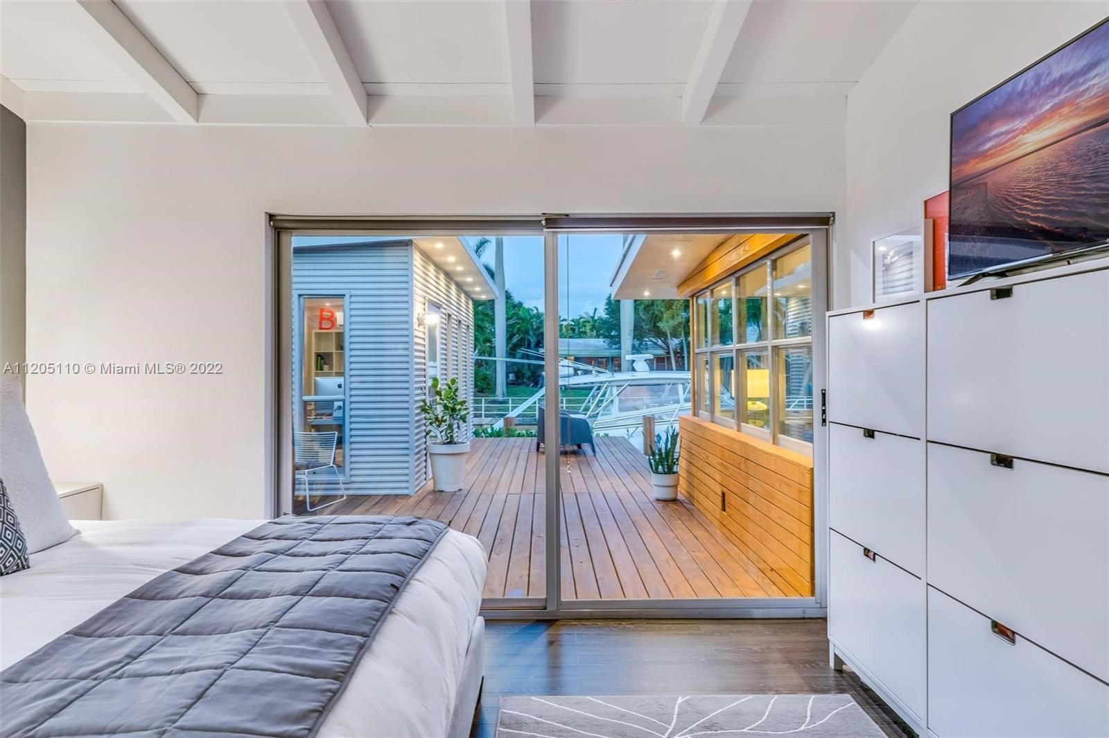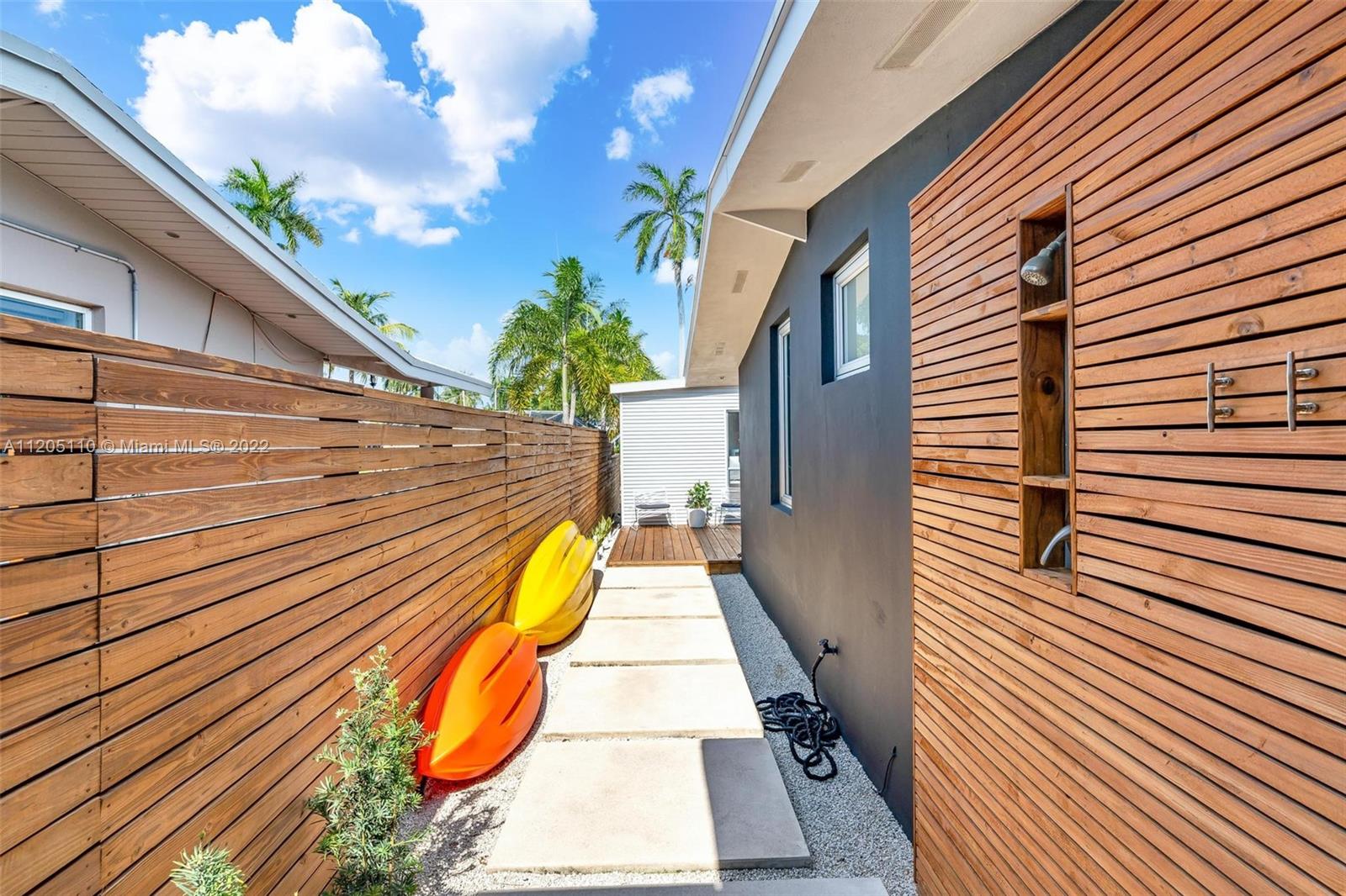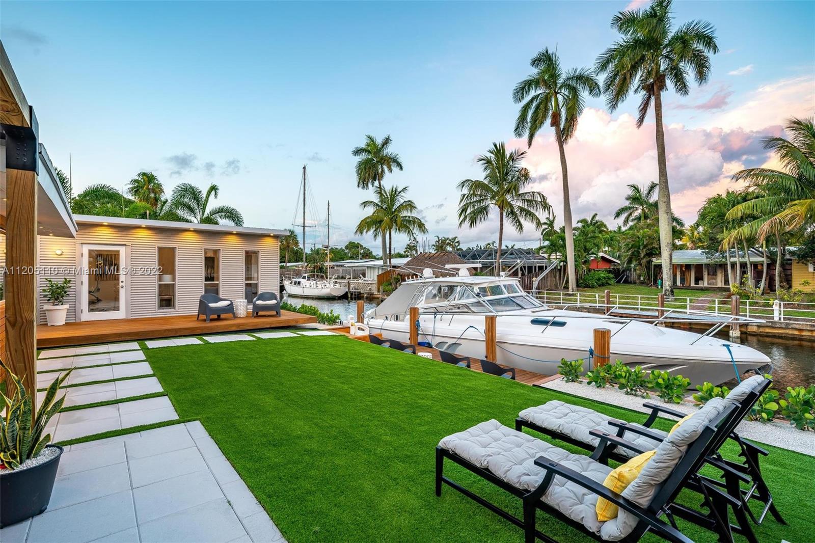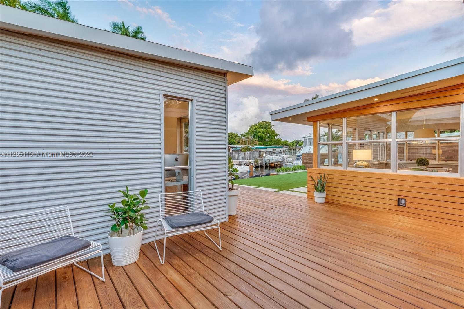 Mid-Century Modern Turnkey Stunner! High-End Waterfront remodel with an open concept layout and vaulted ceilings on 60' of deep water ocean access and no-fixed bridges. Free-standing modern bonus space office/guest structure overlooking the canal that can be a live/work at home space or a 4th guest bedroom. Updated Kitchen and Bathrooms, new electrical and plumbing, impact windows and doors. Extended outdoor gathering space around a fire pit and covered 14' x 14' pergola. Outdoor shower, artificial turf and pavers throughout the entire private backyard. This amazing modern California vibe boating home is in the hidden gem of the Lauderdale Isles neighborhood. Only 3 miles from Las Olas, downtown, beach and FLL International Airport.