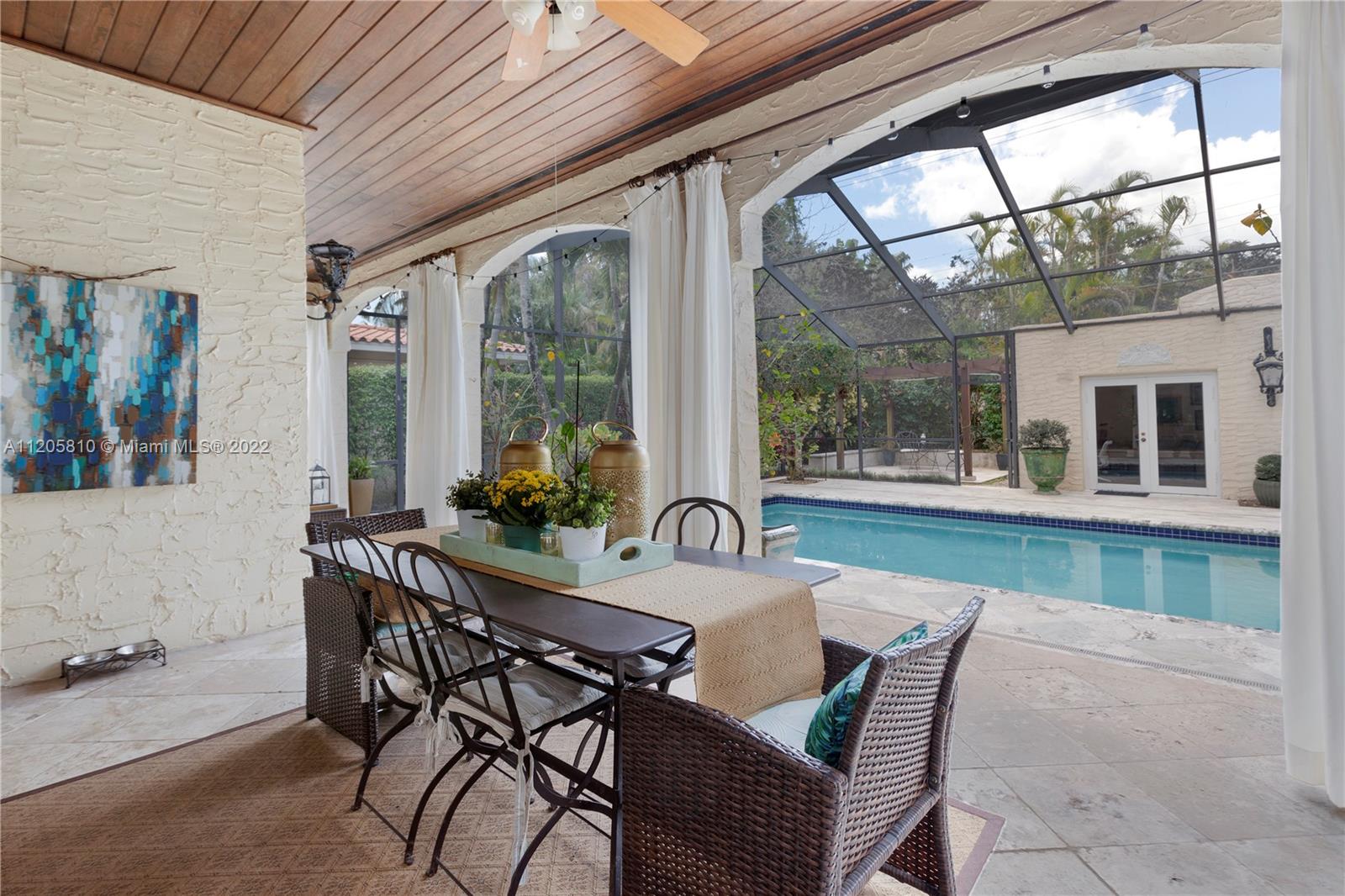 This historically designated 1925 two-story Old Spanish gem has been extensively updated! Vintage charm, character & many original architectural details throughout. Courtyard entry with fountain & French doors lead to the foyer. Living room with functional fireplace. Formal dining room. Eat-in kitchen with ample storage & built-ins. Breakfast room & family room overlooking covered patio, pool, cottage & backyard. Den, half bath, & large master suite with 2 walk-in closets downstairs. 2 bd/1 ba upstairs. Detached 1 bd/1 ba cottage. 42KW whole home generator. Situated on a large 11,250 sf lot on a quiet tree-lined street & only a couple of blocks from the Granada Golf Course. Short distance to best Schools, Parks, Golf Course, Downtown Gables & everything the City Beautiful has to offer!