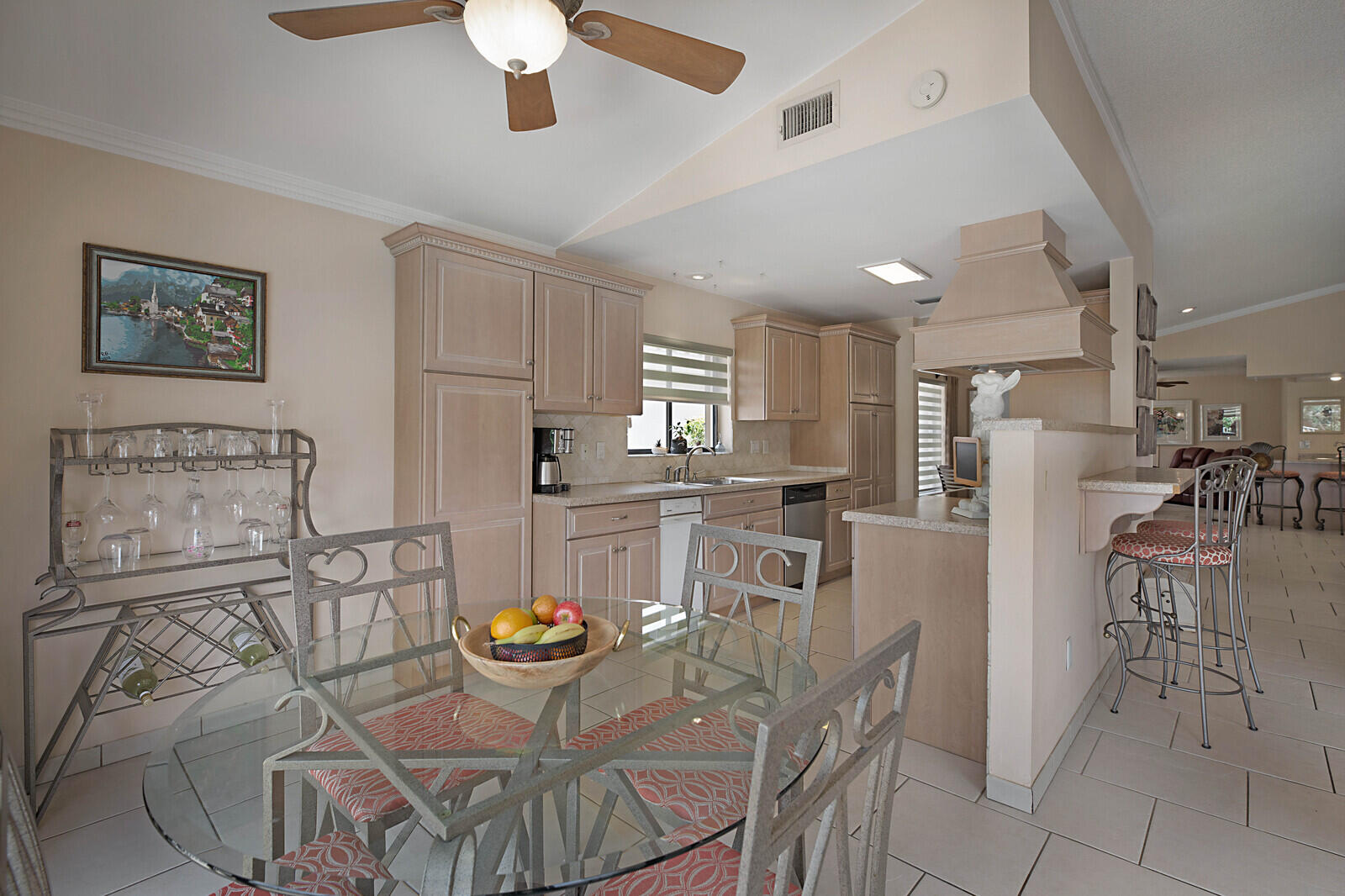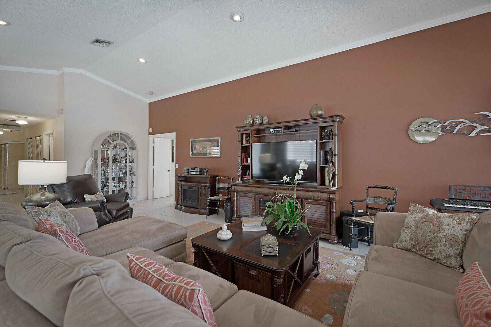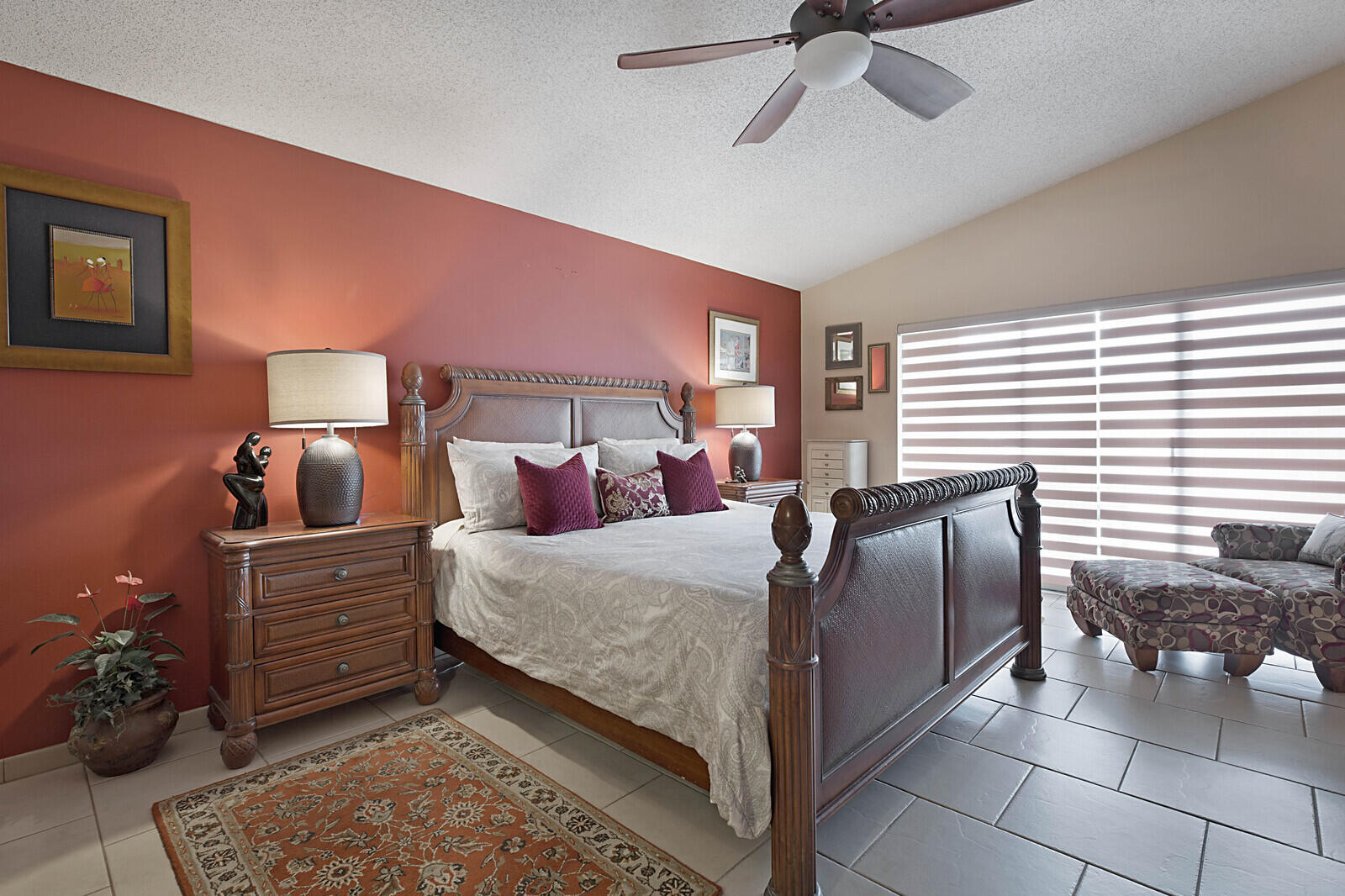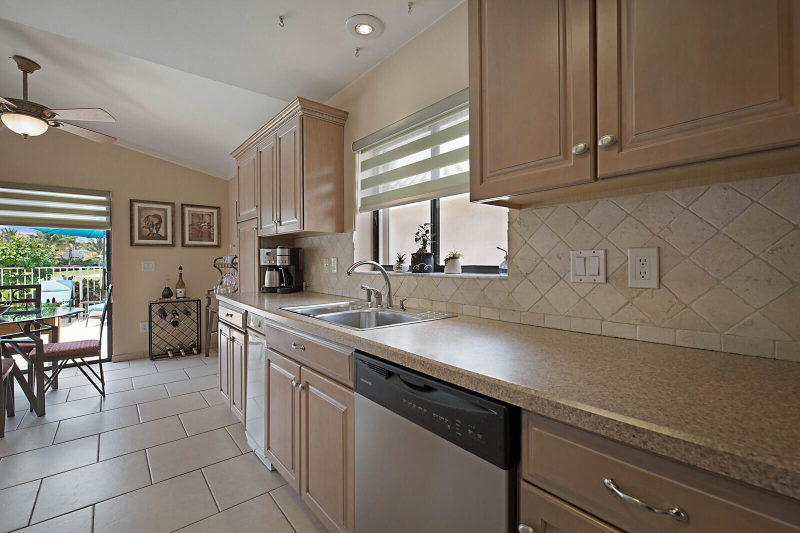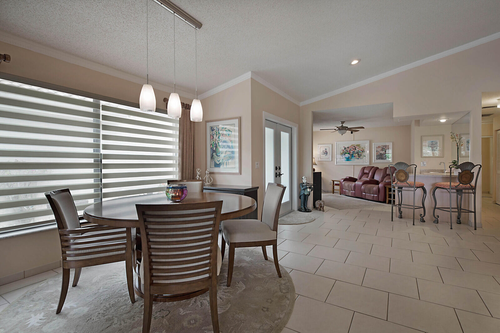 Welcome to Boca Woods - one of the area's premier golf and country club neighborhoods with not only 2 golf courses, but tennis, pickleball, a new sports/fitness complex, social clubs, elegant clubhouse and dining +++. Membership is mandatory and full golf is available, however this home is eligible for a Social Membership option. Popular Pinewood model w/heated pool on beautifully landscaped golf and lake lot. Very private patio. Large, neutral tile in all living areas + Primary Bedroom. Laminate in the 2nd bedroom. 3rd bedroom used as a den has wet bar. Vaulted ceilings. Crown molding. Kitchen & bathrooms have been updated. Accordion shutters + impact front and garage doors. Beautifully maintained with new/newer roof, AC, water heater & most appliances. See ''more'' for more specifics
