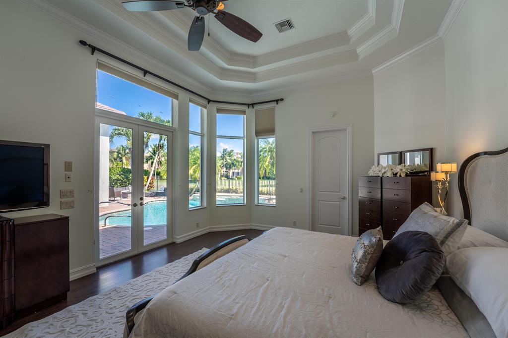 COME SAIL AWAY WITH ME... to this glorious waterfront 5-bedroom home with sweeping serene lake views from the family room, living room, kitchen and master bedroom. Located in one of the most sought-after gated communities in South Florida, The Oaks at Boca Raton, this estate home has an immaculate master suite including separate his and hers bathrooms, den and second bedroom on the first floor, an open floor plan offering 4,702 square feet of AC living space and 5,932 total square feet features many luxurious upgrades such as coffered ceilings, crown molding, fireplace, wet bar, custom built-ins, impact glass windows on the second floor and brand new luxury flat tile roof and gutters. A sparkling pool with waterfall spa is surrounded by an expansive southern-exposure pool deck