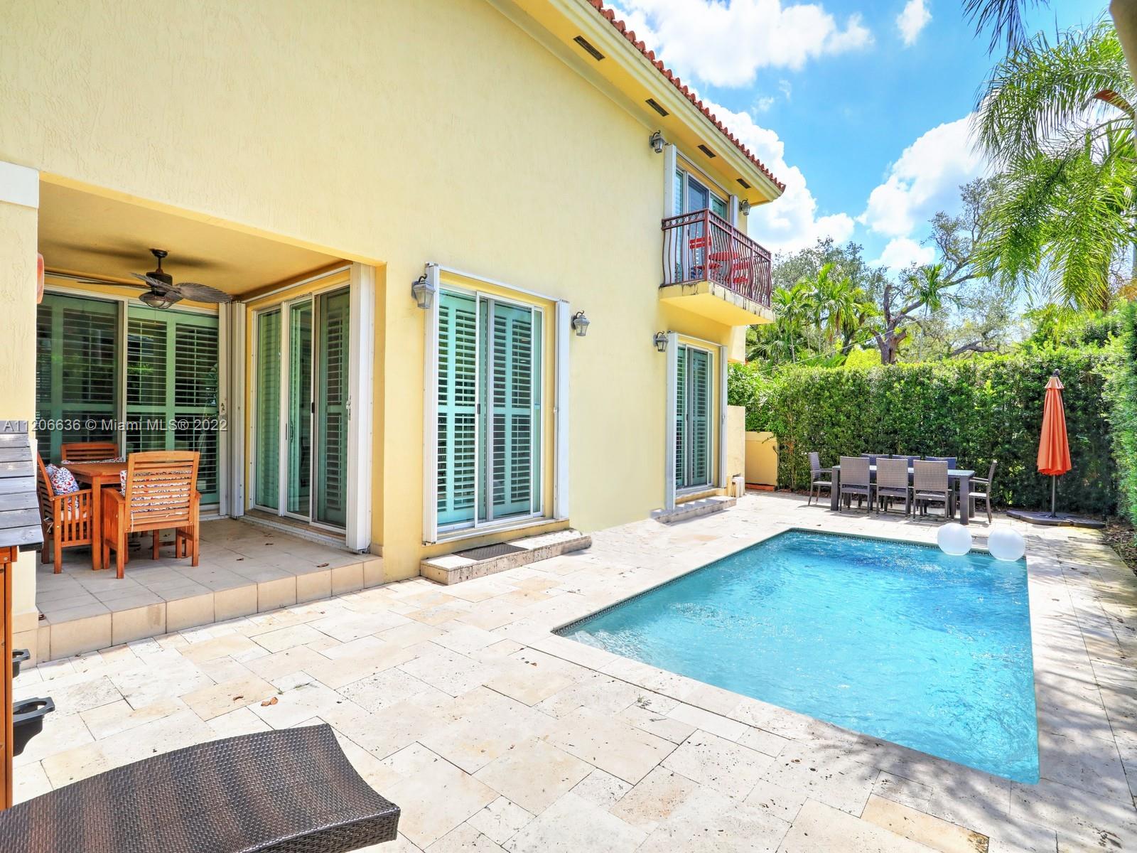 Centrally located on a charming tree-lined street, this beautiful two-story, 3 bed, 3.5 bath home is situated perfectly on its 5250sf private lot. This home features high ceilings, ample natural light, two car garage, formal living and dining rooms, powder room and eat-in kitchen with stainless steel appliances and granite counters. A large family room opens to a covered and breezy pool patio, perfect for dining al fresco in the evening while being protected by the recently installed Swat mosquito system. Upstairs, the master suite has a large walk-in closet and bathroom with dual vanities, whirlpool tub and large shower. The pool area has external bathroom access and pavers throughout the yard for easy maintenance. Enjoy walking distance to UM campus and mere minutes to Gables dining.