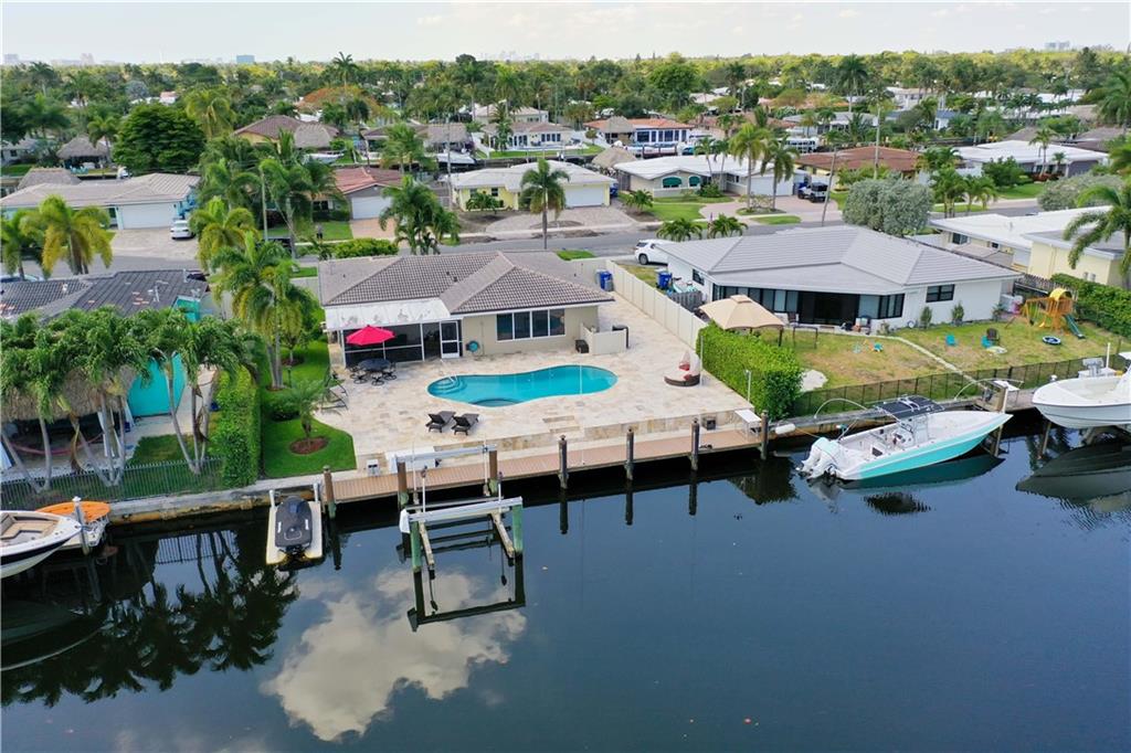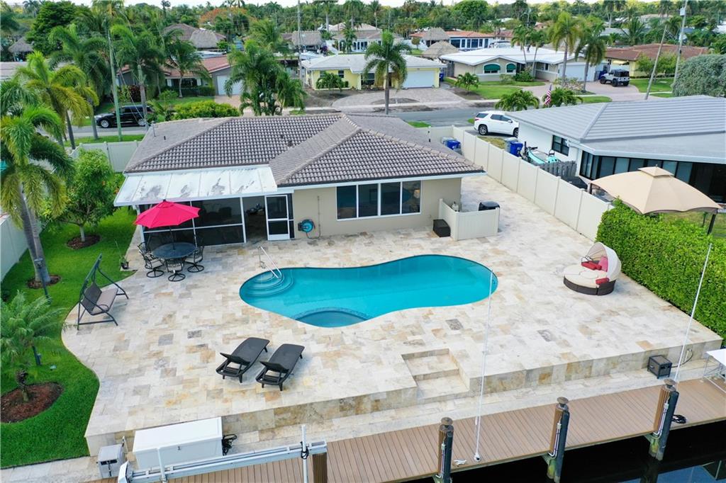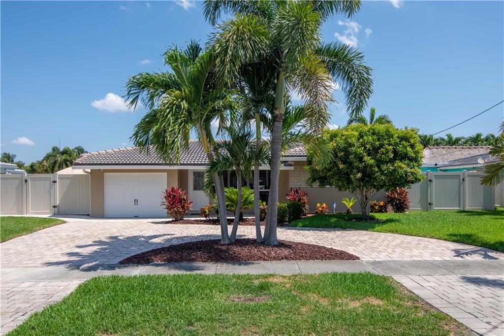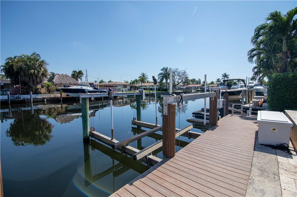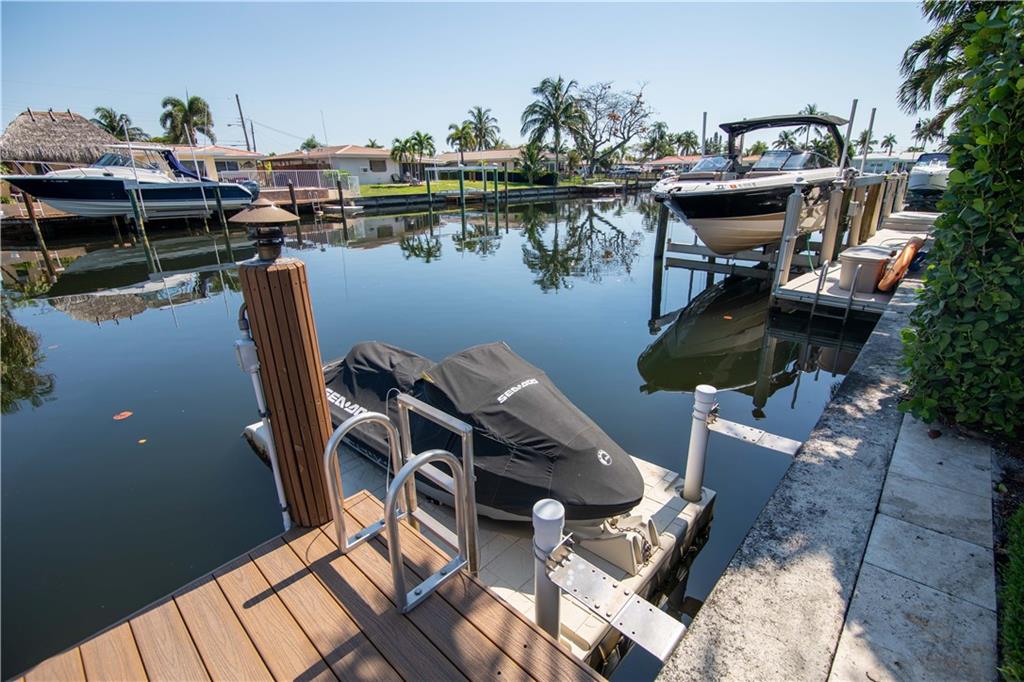 This stylish waterfront home offers 75' of ocean access waterfrontage on a wide canal. The home offers 3 bedrooms (3rd bed has no closet) and two baths that have been remodeled with elegant detail. The open kitchen boasts new Frigidaire SS appliances and glass top range/oven. The family room seamlessly opens to the back yard for unparalleled indoor and outdoor living. The back yard is a tropical oasis with raised travertine paver pool deck, re-surfaced pool with all new equipment, including heater/chiller. Enjoy the new Trex dock and pilings, with 12,000 lbs boat lift, personal watercraft float pad. Other features include all high impact windows, new garage door, new privacy fence, new sprinkler system. This home is a true gem. Schedule an appointment today.