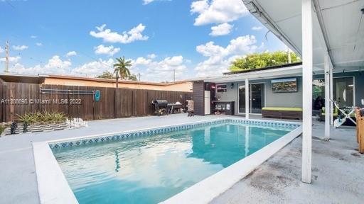 Welcome Home! Nestled in Hollywood, FL is your quiet oasis.. a beautiful 3/2 with lovely pool and hosting area that will leave you looking forward to the weekend! Park in your circular driveway, and enter your smart, solar-paneled home with an open floor plan showcasing your gorgeous kitchen. Equipped with self-closing white cabinets, lower-placed microwave, and stainless steel appliances with wall-mounted hood, this showstopping kitchen is a must see! Your primary room is equipped with walk-in closet, double-sink and backlit mirrors for the primary bathroom. The laundry room boasts a top-of-the-line washer and dryer, perfect storage and wall cabinets for easy organization. With inside + outside bar, pergola, fruit trees, impact windows, roof 2020, shed and storage.. This is HOME!