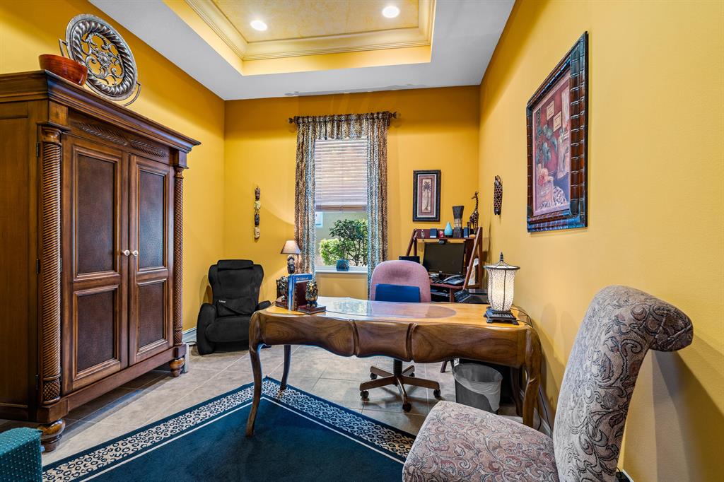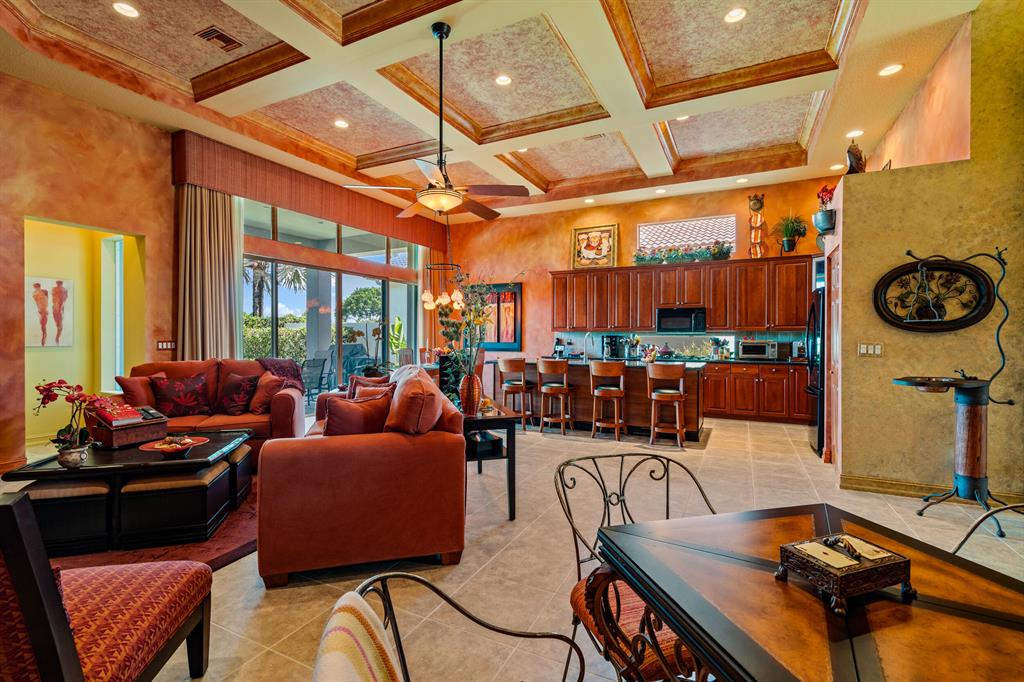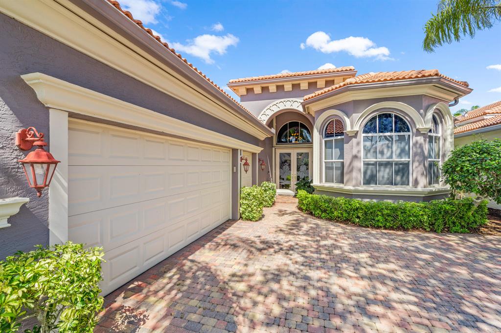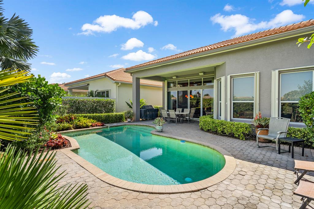 If you've been waiting for a home in Villagio, this fabulously designed, beautifully appointed, and immaculately maintained FURNISHED great room ''Portofino'' could be the perfect choice. Located within walking distance to the Club via a cart path shortcut, this 3BR/3BA+Den features a side-entry 2.5 car garage and Accordian hurricane shutters. Ultra-lush landscaping provides great curb appeal in the front and complete privacy in the back. The privately landscaped pool and patio area overlooks golf and water views of the Tradition Course. The spacious foyer's soaring ceilings impress, while the large great room boasts dramatic box-beam ceilings and crown moldings, providing serious architectural interest.