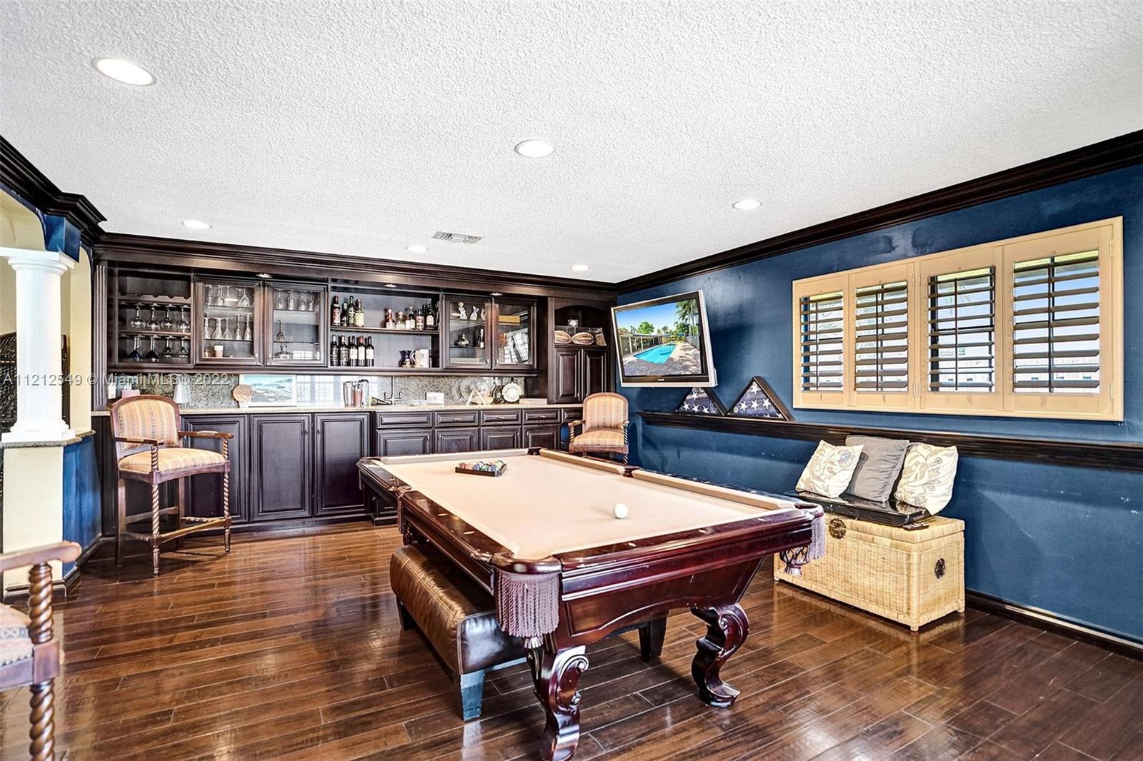 Rarely available - This immaculate and remodeled 4-bedroom 3-bathroom waterfront/pool single family home is the Largest custom-built 1 story home in New Orleans Villas Estates - no homeowners assoc! Features include 350 sq ft Billiard room with mahogany cabinetry & custom-built wet bar for entertaining off living room; expansive Gourmet kitchen with kitchen window overlooking pool deck, stovetop island, lighted breakfast bar and newer appliances; 2 large dining rooms & family room; custom plantation shutters, huge inside laundry rm! Garage-Tek system; outdoor living at its finest with resort-style southern exposure pool with brick paver patio flanked by eight 20-foot coconut palm trees along an expansive canal front with custom designed commercial-grade shade awning.