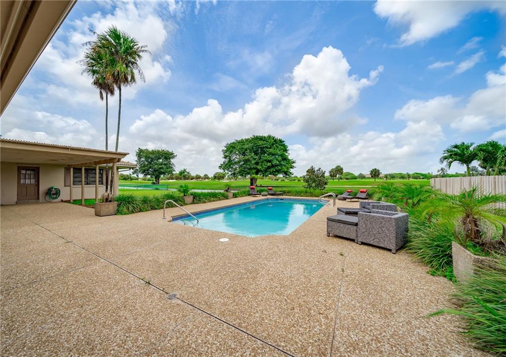 Beautiful, Move In Ready in an exclusive community on the 8th hole of Plantation Preserve Golf Course, this 5BR/2.5BA, 3,250sqft residence enchants with tropical palm trees, gleaming floors, recessed lighting, an expansive living room, and open concept gourmet kitchen featuring granite countertops, stainless-steel appliances, and an adjoining family room. Host gatherings in outdoor space with a pool, covered patio, pergola, and golf course views. Experience true bliss in the oversized primary bedroom, which features an enviable closet and a luxurious en suite boasting a wet room with a rain shower and a standalone soaking tub. Other features: 2-car garage, circular driveway, formal dining, handicap accessibility, no HOA, near shops, and more! Come See!