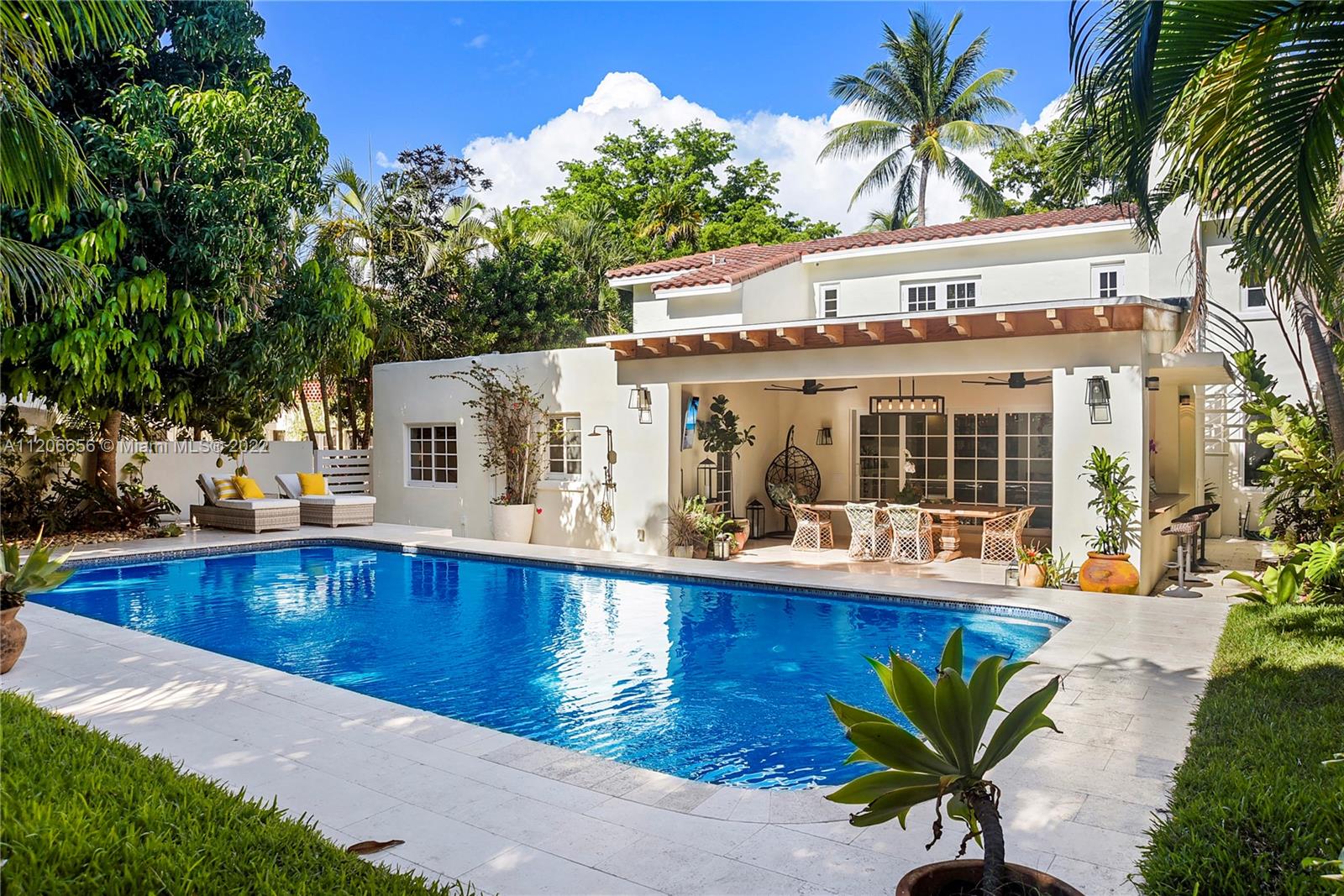 Renovated & ready for you! Completely gated, private oasis on prestigious Pine Tree Drive! No expense was spared while remodeling this home, featuring a new open gas kitchen w/ Wolf & Sub Zero appliances, & island, new impact windows & doors, carport w/ garage door, & new A/C, & electrical! Fantastic layout w/ 1 BD down w/ access to private backyard, & 3 BD upstairs w/ custom closets, including primary suite w/ terrace. Also offering stunning porcelain tile & wood floors, impressive great room w/ fireplace, wine storage, & Florida room w/ sliding doors that completely recess. Step outside & fall in love w/ your new terrace w/ covered summer kitchen w/ ice maker, TV, & Sonos system, recently redone PebbleTec heated saltwater pool, shower, lush landscaping, & gorgeous mango trees!