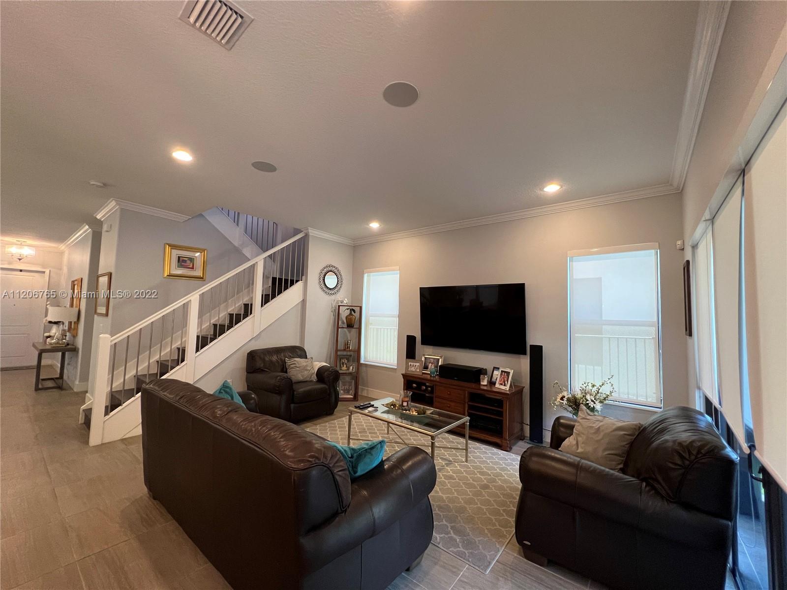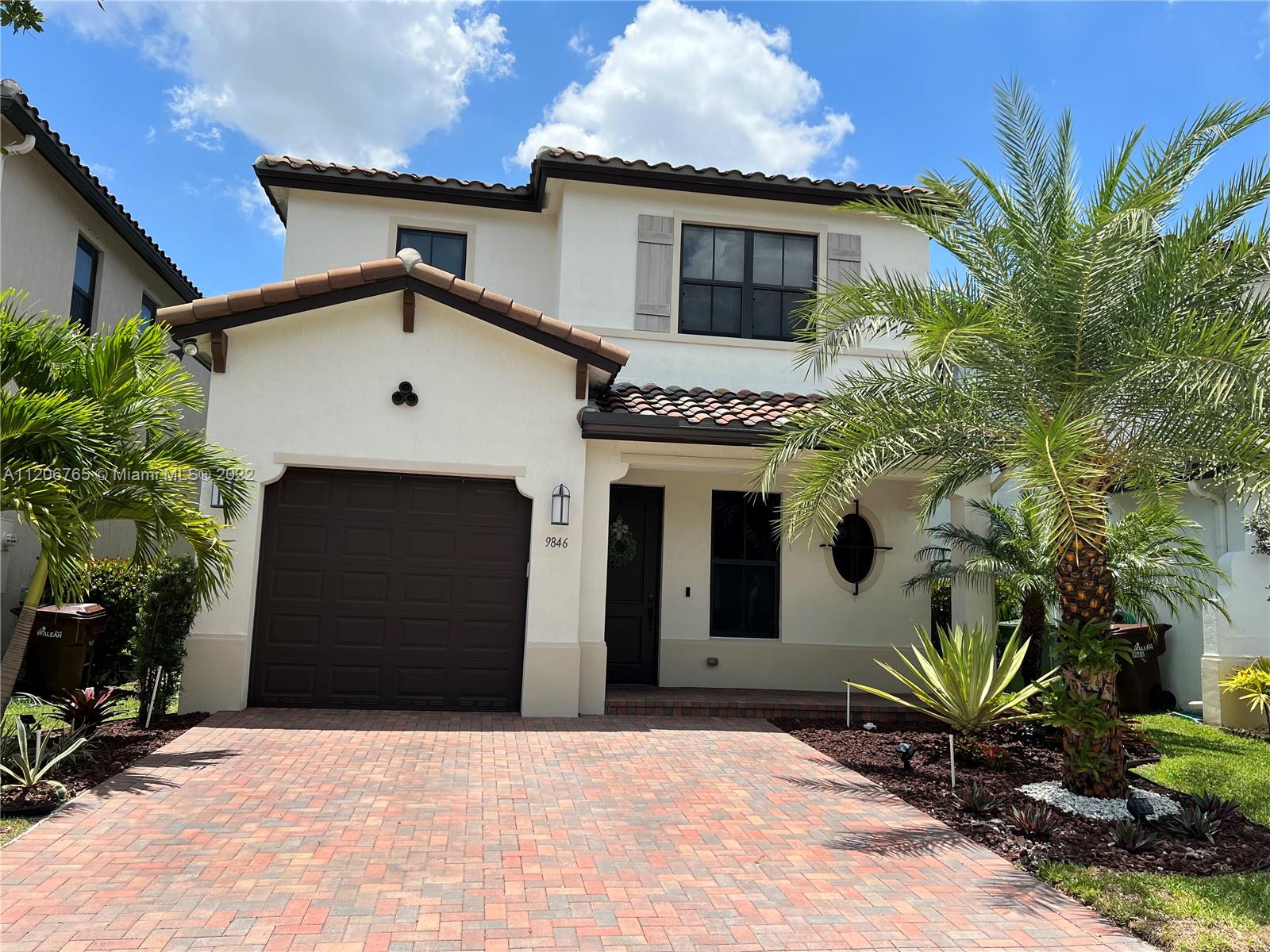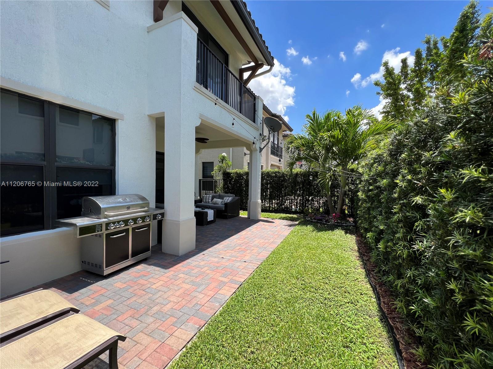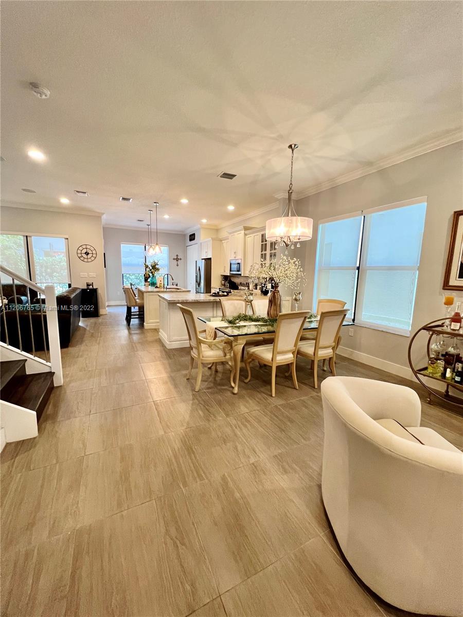 This beautifully upgraded 3 bedroom with 2 1/2 bathroom is a must see. Enjoy the open floor plan with crown moldings and high ceilings, 24 x 24 porcelain tile in the first floor, and impact windows/sliders throughout. The kitchen has custom cabinetry with stainless steel appliances, granite countertops and marble backsplash. The stairs, second floor and master bedroom have high-end laminate flooring with carpeting in the 2nd and 3rd bedrooms. Large loft area can be converted into 4th bedroom. The backyard is completely fenced in with greenery for privacy. Spacious patio has extended paver area for entertaining. Bonterra is a gated community with 24 hour security and amenities including pool, playground, gym and clubhouse. Easy access to I-75, Turnpike and Palmetto expressway.