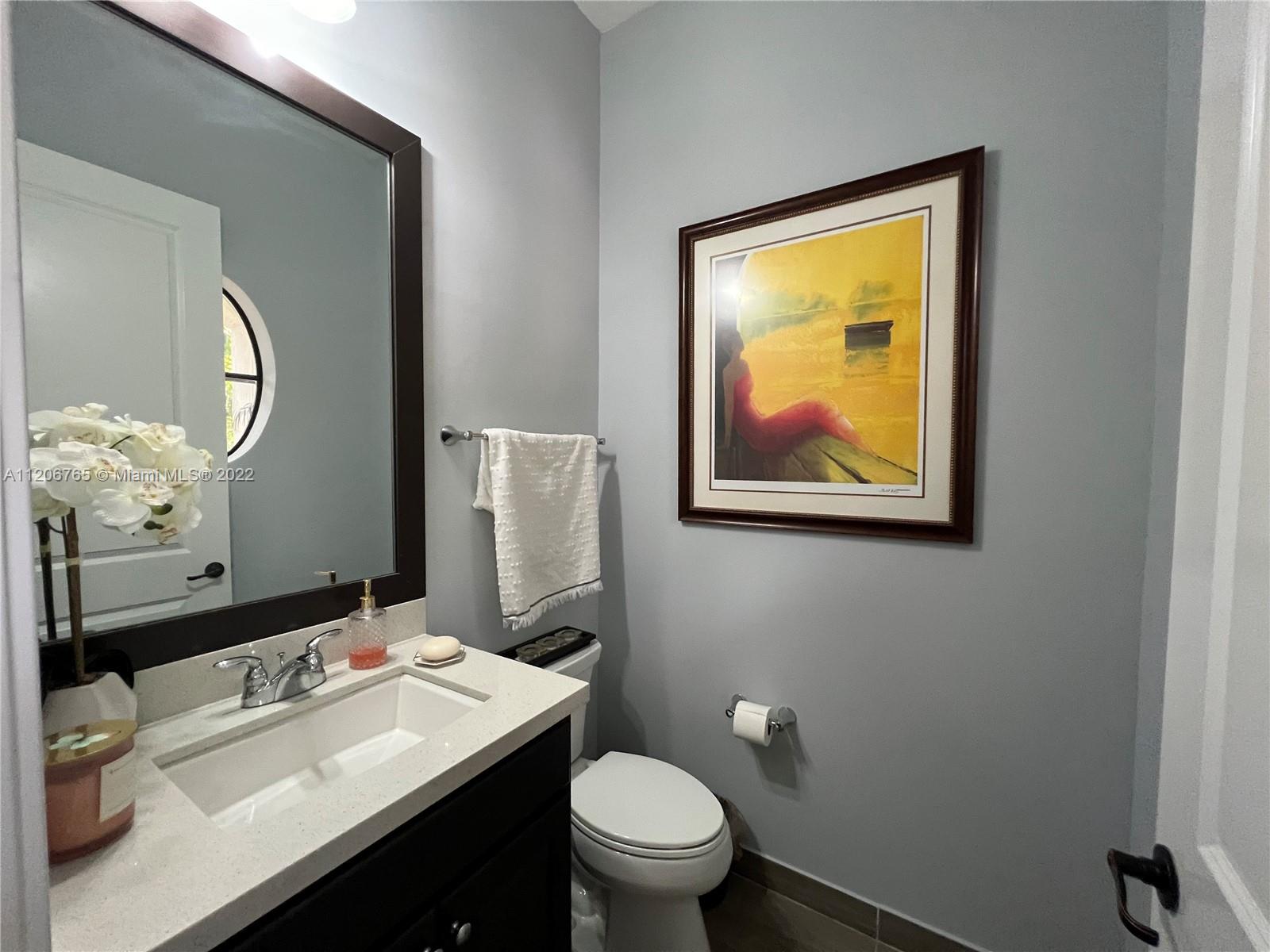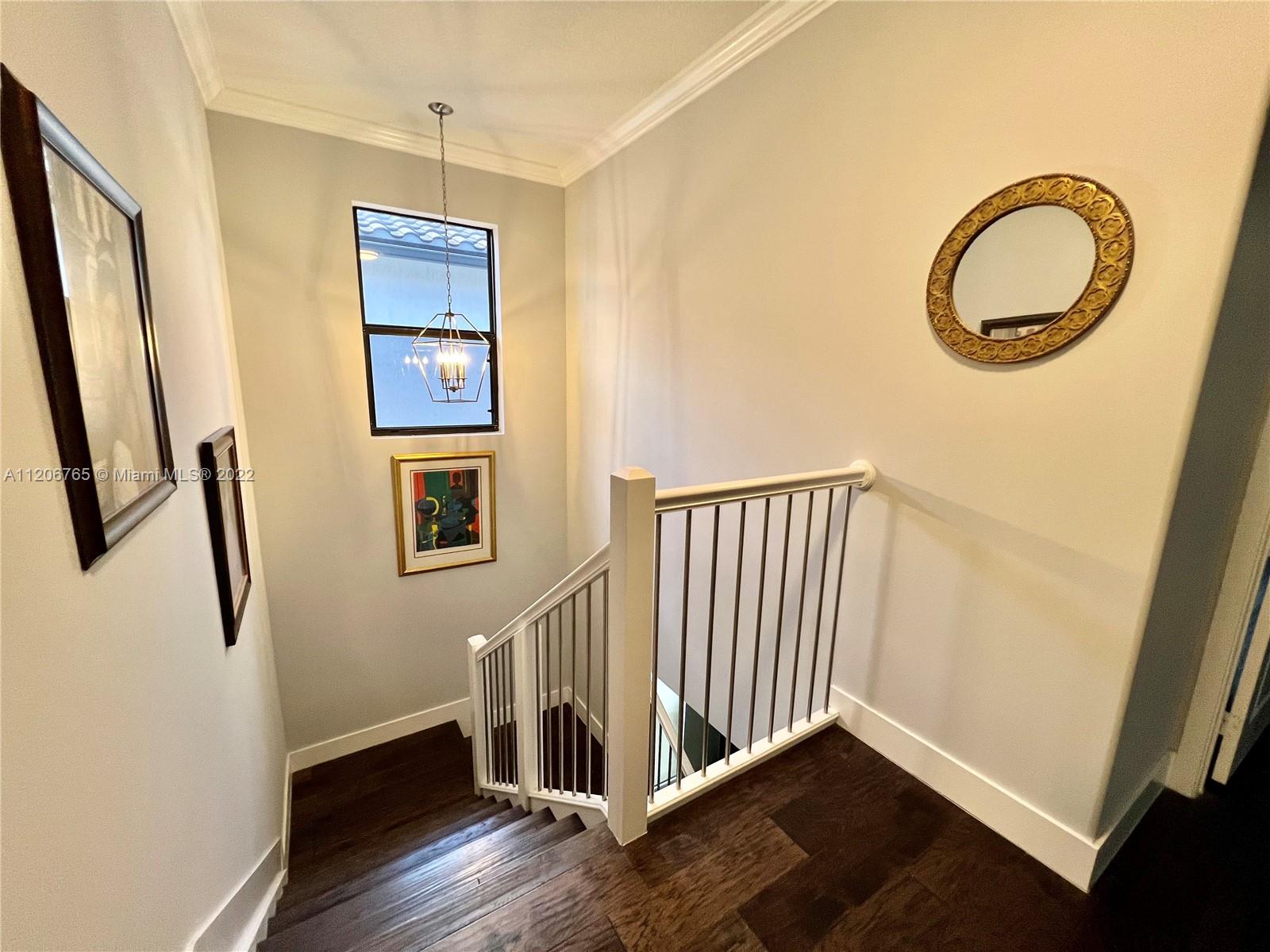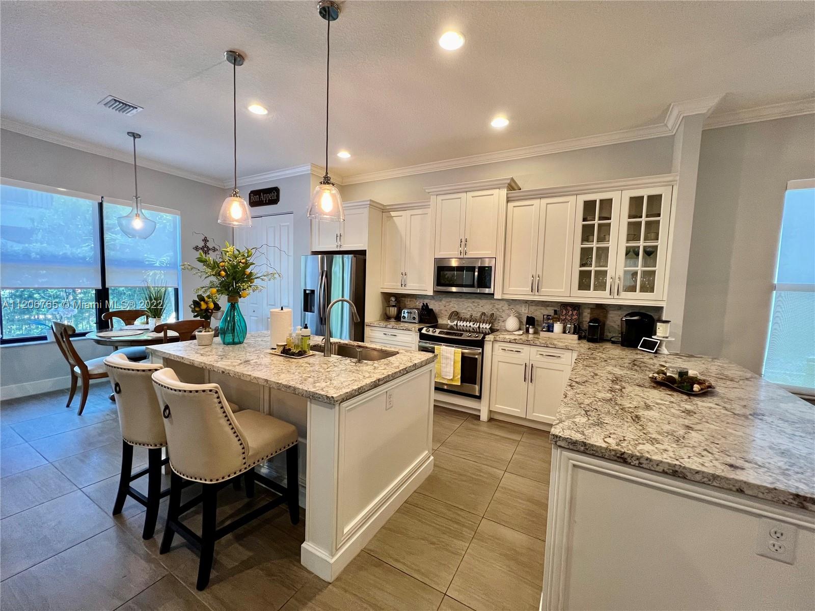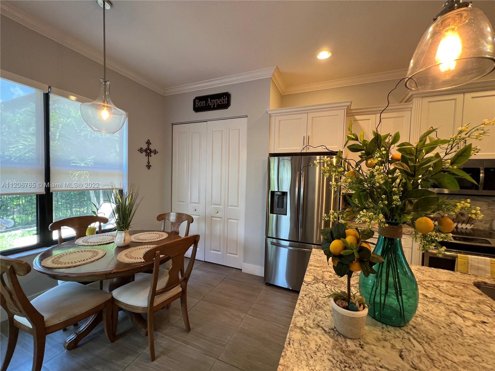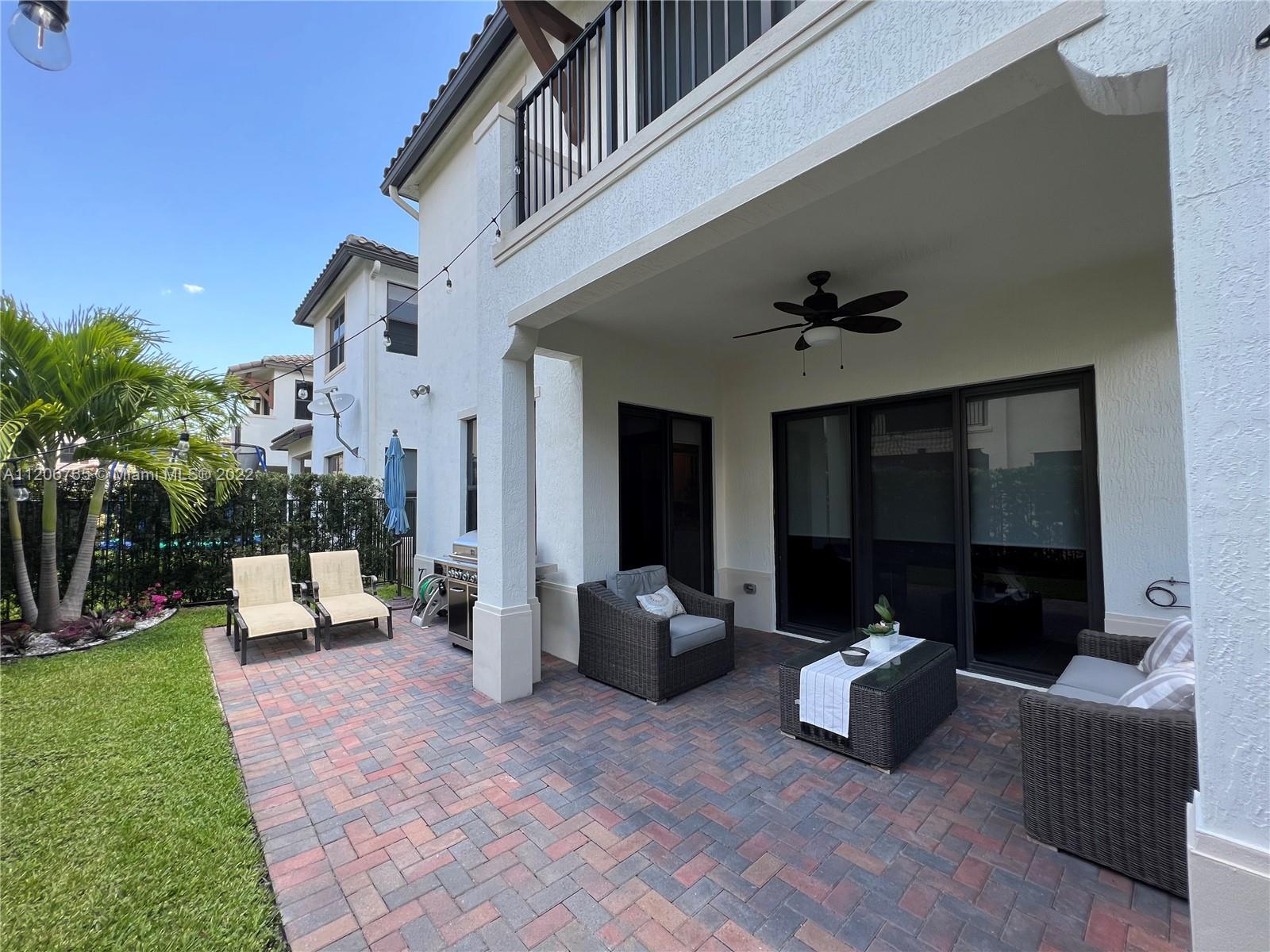 This beautifully upgraded 3 bedroom with 2 1/2 bathroom is a must see. Enjoy the open floor plan with crown moldings and high ceilings, 24 x 24 porcelain tile in the first floor, and impact windows/sliders throughout. The kitchen has custom cabinetry with stainless steel appliances, granite countertops and marble backsplash. The stairs, second floor and master bedroom have high-end laminate flooring with carpeting in the 2nd and 3rd bedrooms. Large loft area can be converted into 4th bedroom. The backyard is completely fenced in with greenery for privacy. Spacious patio has extended paver area for entertaining. Bonterra is a gated community with 24 hour security and amenities including pool, playground, gym and clubhouse. Easy access to I-75, Turnpike and Palmetto expressway.