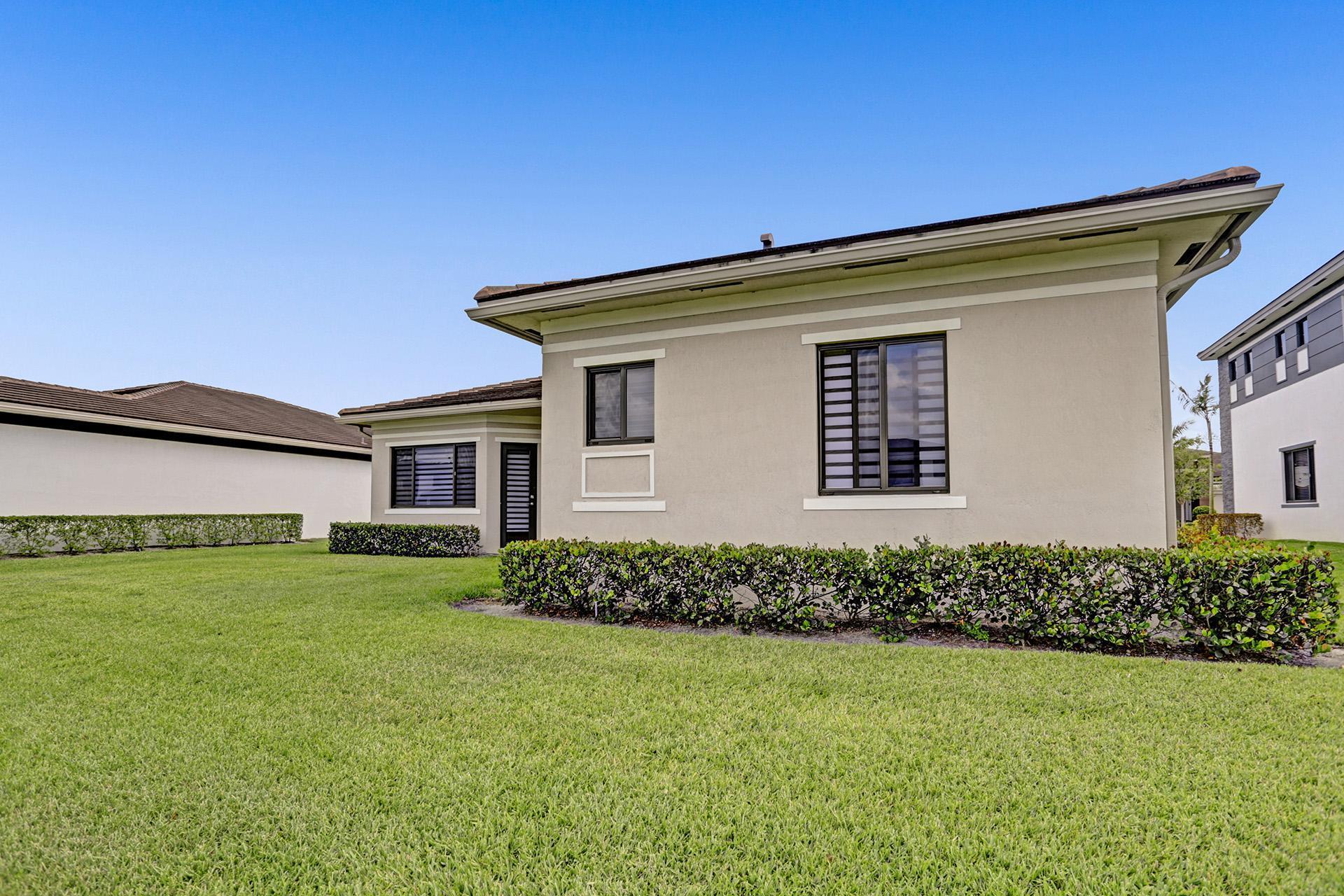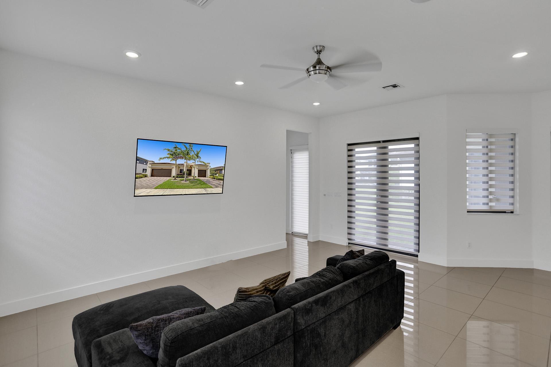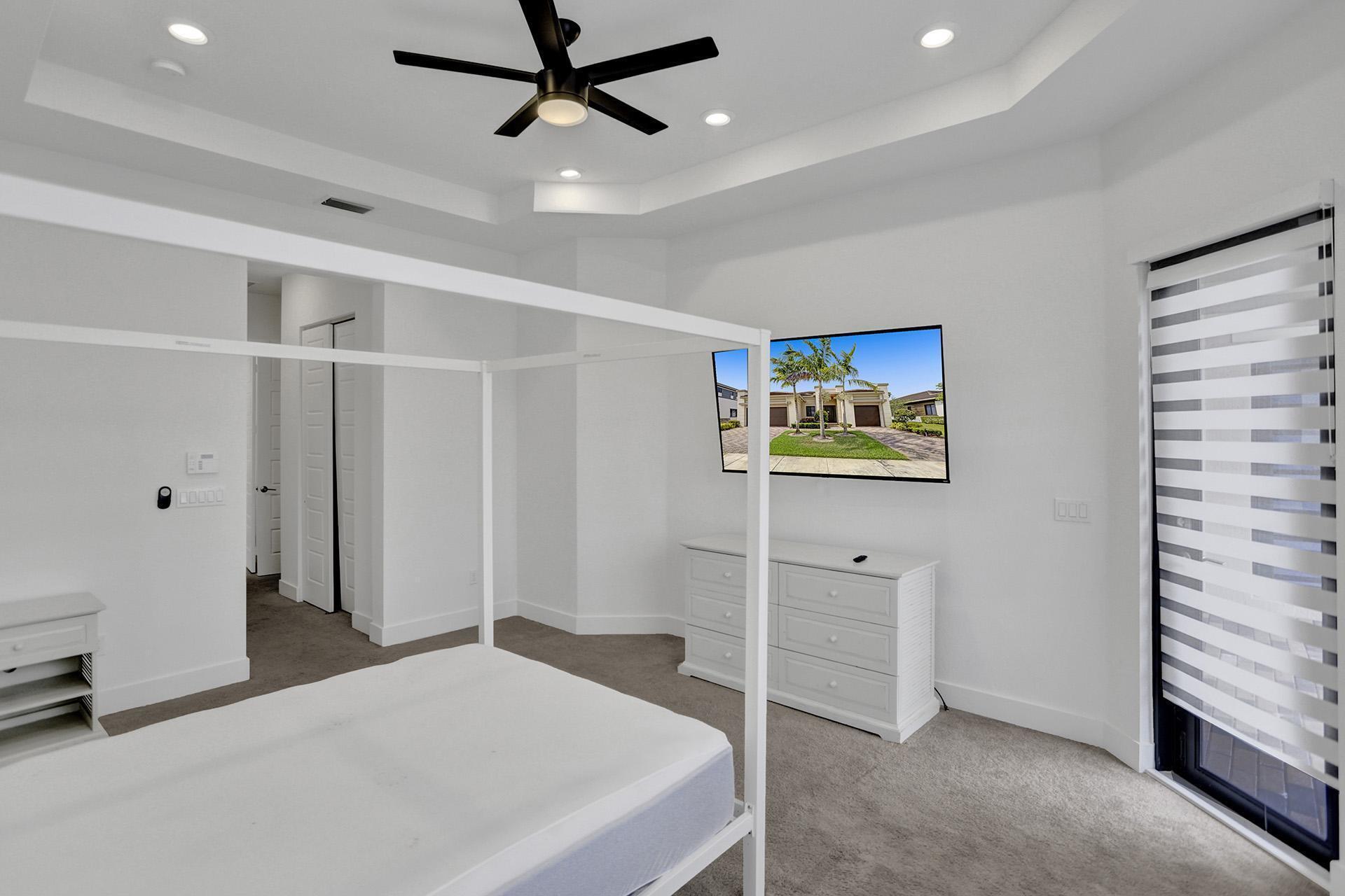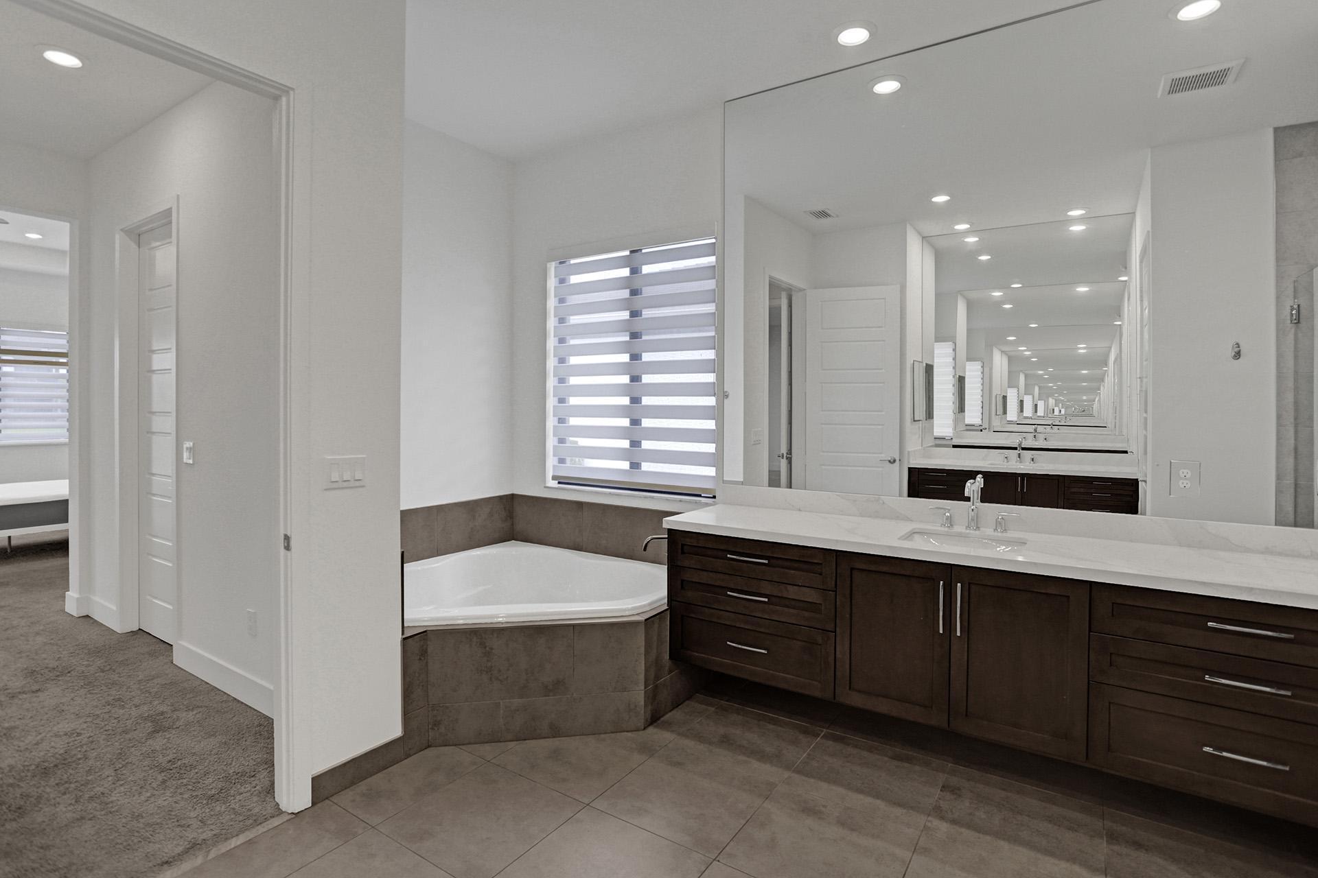 Presidential Collection: Contemporary 4 Bedroom 3 Bath 3 Car Garage One story Home with Lake View. Former model home. Private Triple Split floor plan. Modern Kitchen with 42'' cabinets, soft close hinges, pantry, quartz counters, state of the art stainless steel appliances, covered patio, Move right in, ceiling fans throughout, zebra shades, impact doors and windows, and many community amenities. Must See!