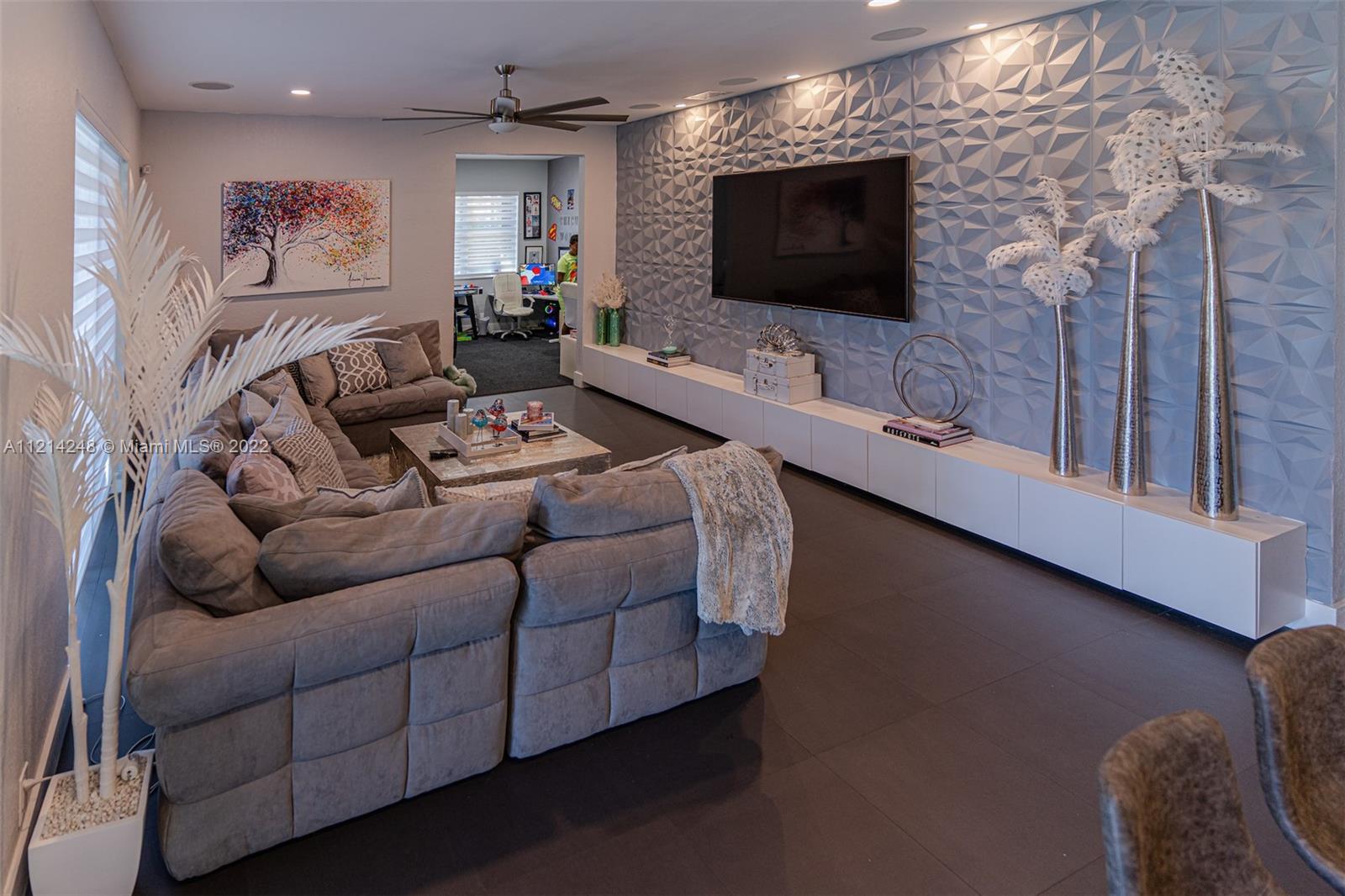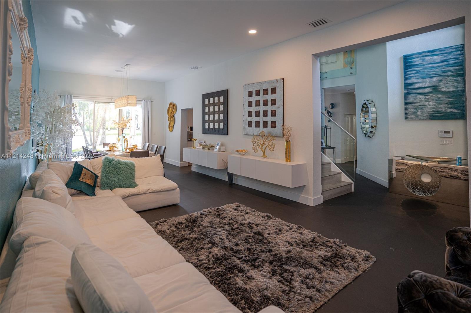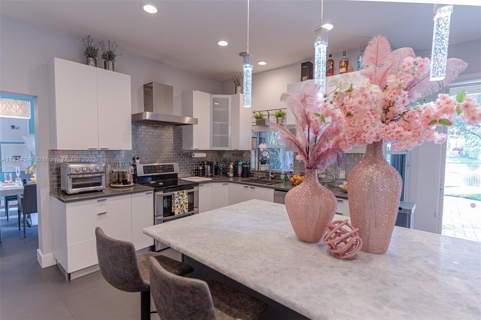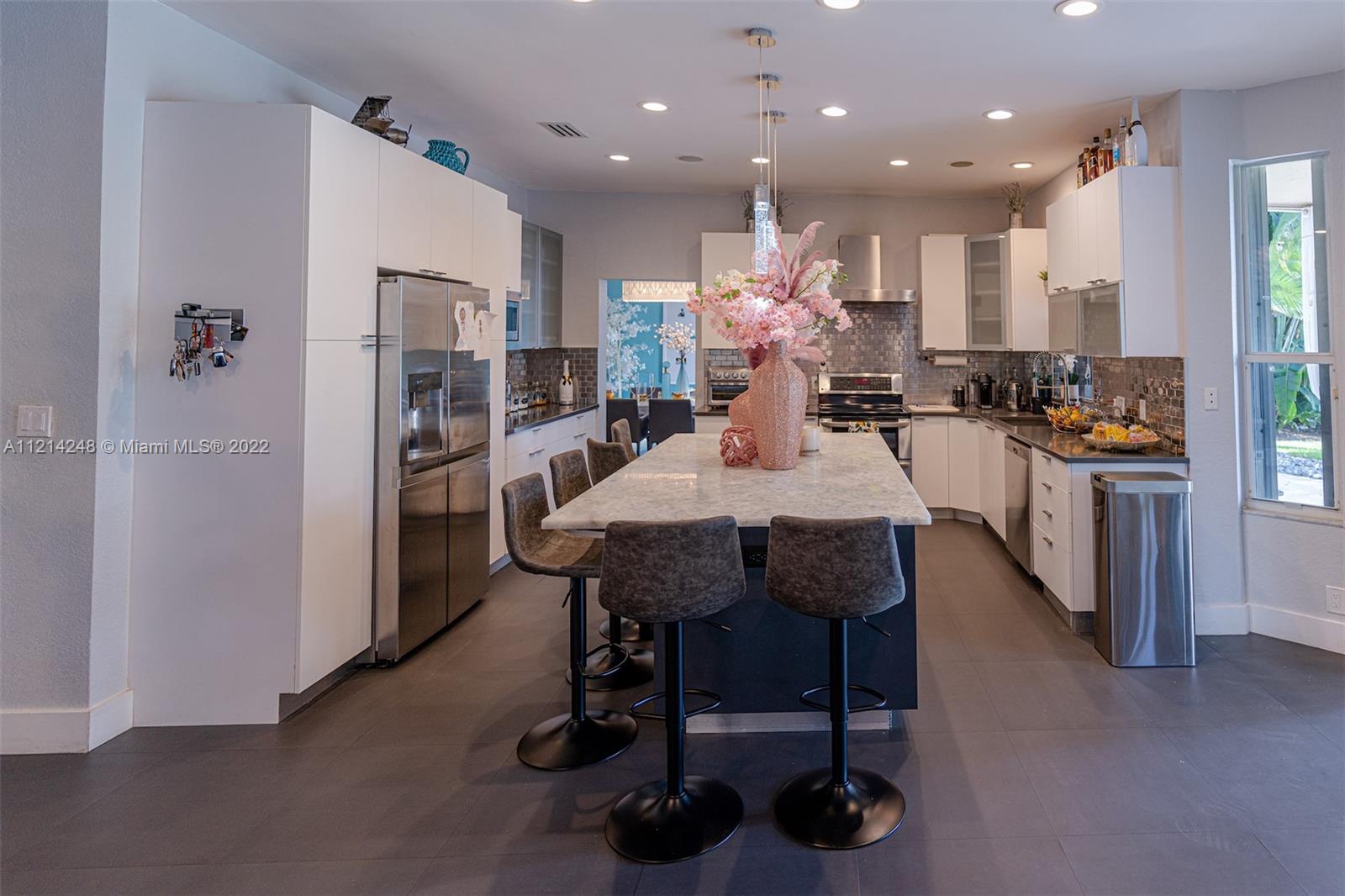 Looking for the perfect escape from the city? Stunning waterfront, cul-de-sac home. Sitting on one of the largest lot in the area (.39 acre). This two-story 4,000SF+ living residence was completely remodeled. Featuring sleek, warm modern details throughout. Offering 75 feet of water frontage, outdoor area with a heated water jet pool, ivory travertine pavers, beautiful 30 feet tall palm trees with lots of privacy, and lush landscaping. Renovated in 2018, this 7 bedroom/5 full bathroom home complete with a playroom, music studio, beautiful island, 16’ x 14’ converted closet, 3-parking garages, oversized master suite with 40’ x 16’ balcony, Crestron controls, sound system throughout, 10’ ceilings throughout 1st floor, and more!
