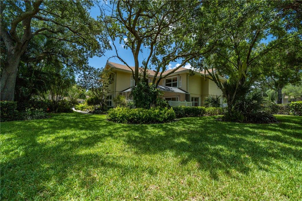 Beautiful corner townhouse unit ideally situated in the back of the community. 24 hr. manned gated community. 2 large primary suites upstairs with 1/2 bath down. A large screened-in patio offers privacy with a garden-like view in front of the home. The first floor is all tile with lots of light. Enjoy a game of tennis on the tennis courts or head out to the pool overlooking the lake. Beautiful tropical landscaping is professionally maintained. Winding sidewalks throughout this man-gated community are great for walking or a safe off-street bike ride in a garden-like setting.