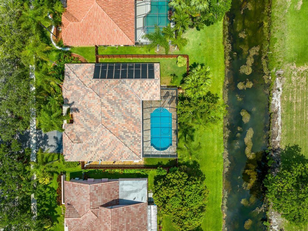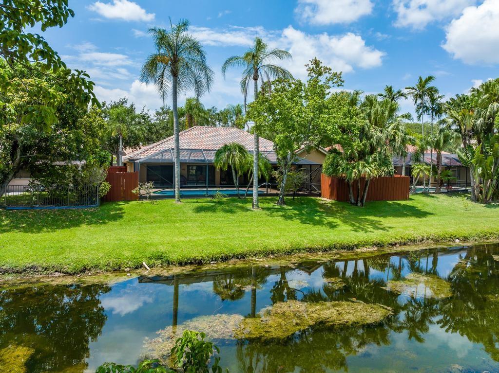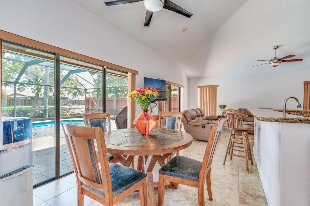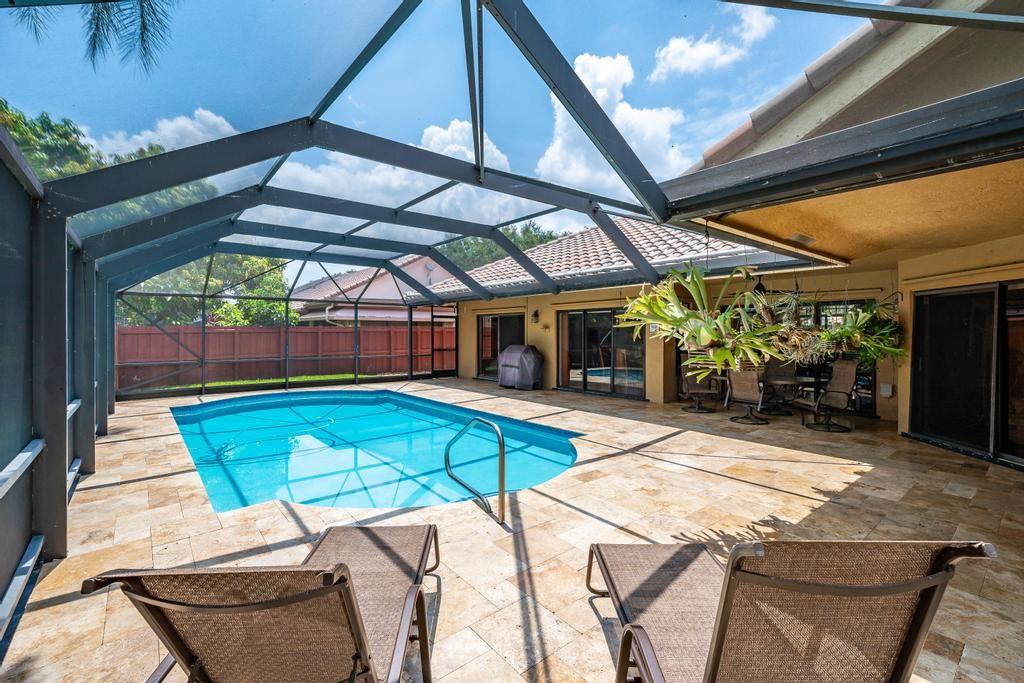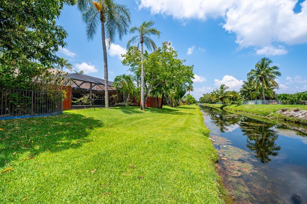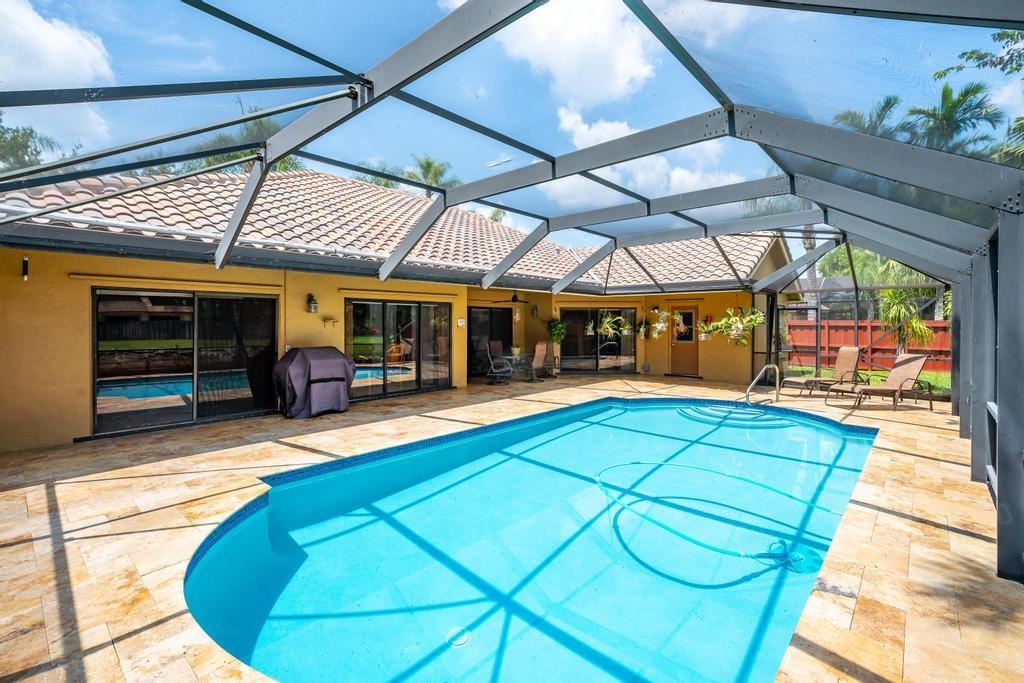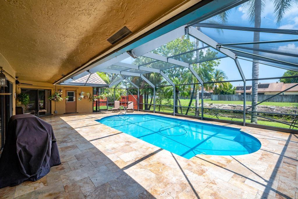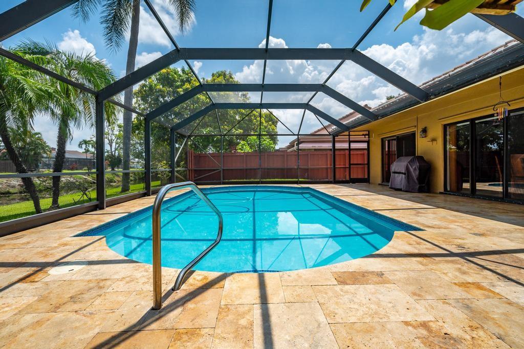 Beautiful, updated, waterfront pool home in Fox Run in Jacaranda. This well-maintained home features an open-concept floor plan, high ceilings, lots of natural light and a view of the renovated pool and spacious travertine deck. Enjoy the lush, tropical landscaping from the screened waterfront patio. The zoned sprinklers use canal water to irrigate the lawn and garden, providing extra savings. The oversized primary bedroom suite features an amazing spa shower, walk-in closet, bamboo flooring and sliding glass/cabana door access to the waterfront pool and patio. The living area and large extended family room are perfect for all to enjoy. The open kitchen has a breakfast bar, pantry, granite counters and custom cabinets.
