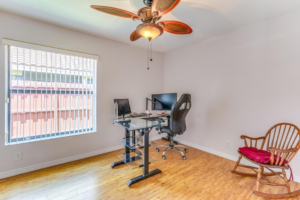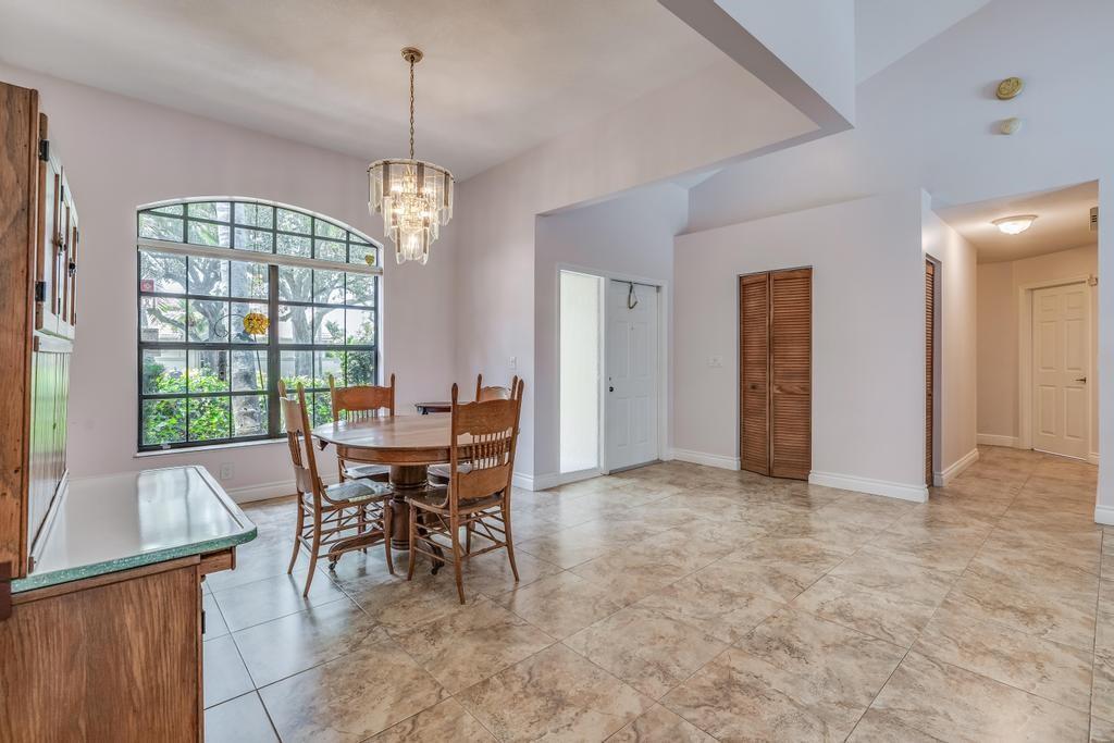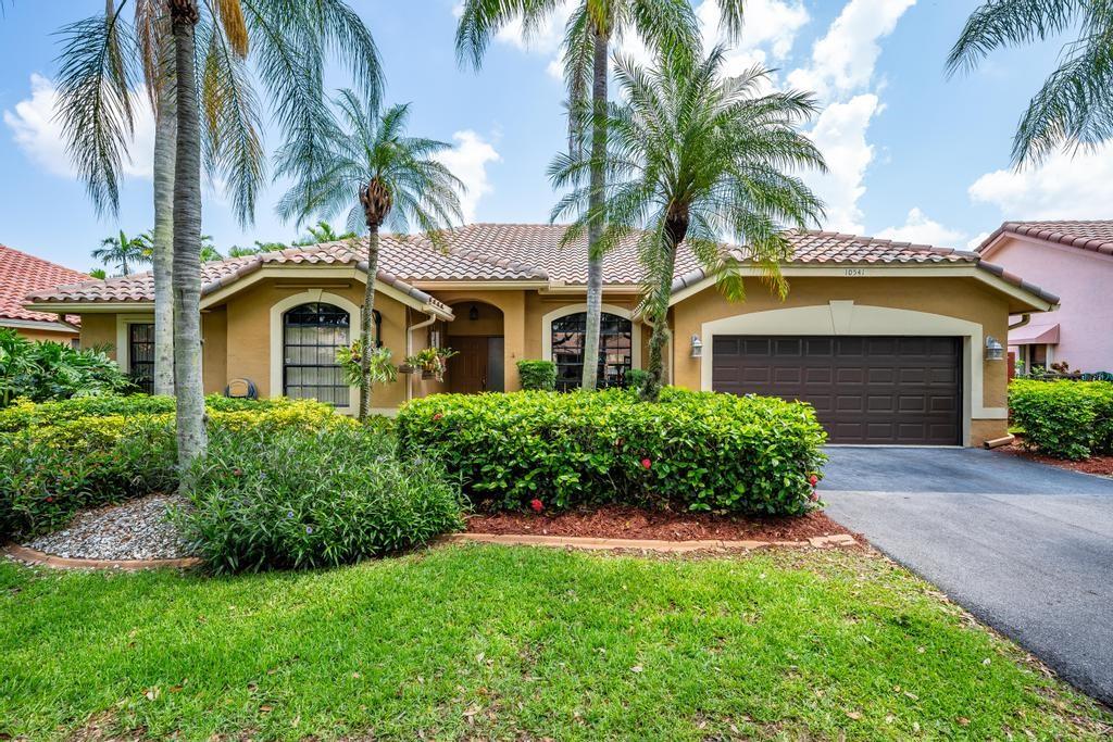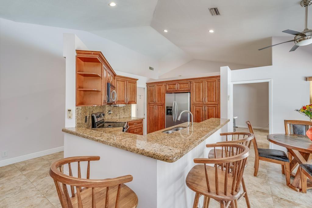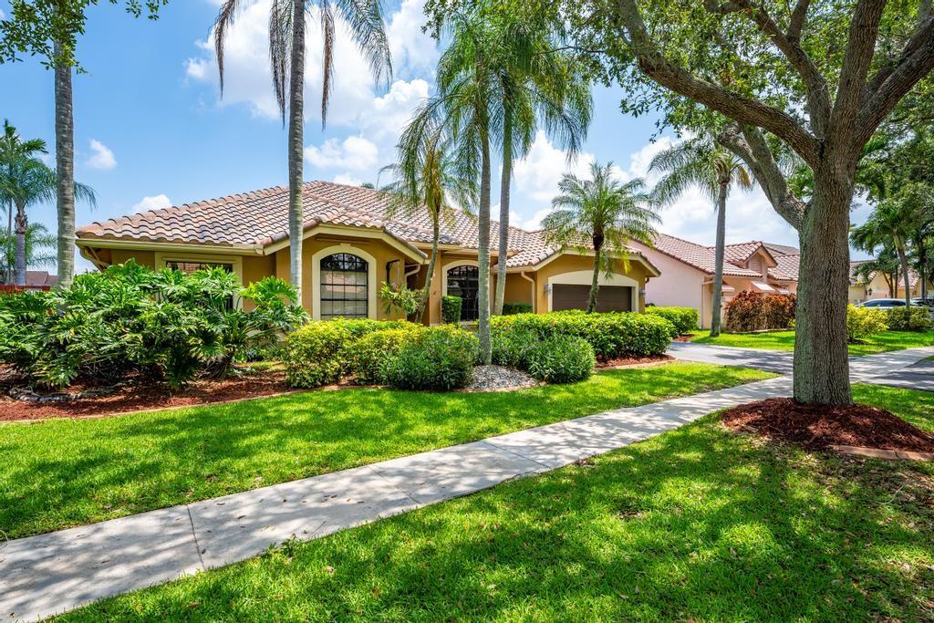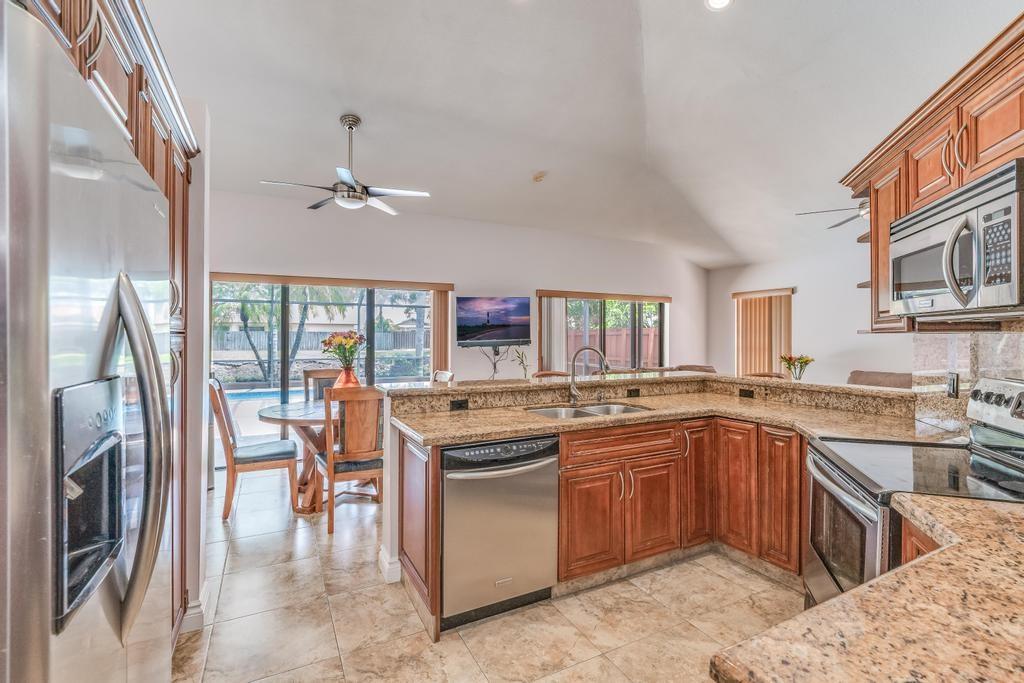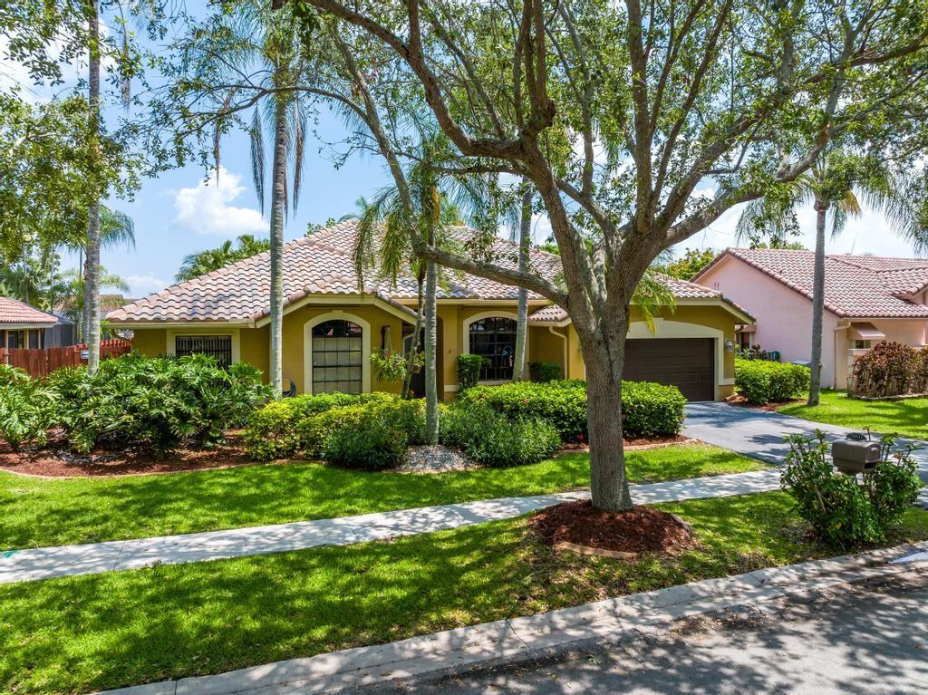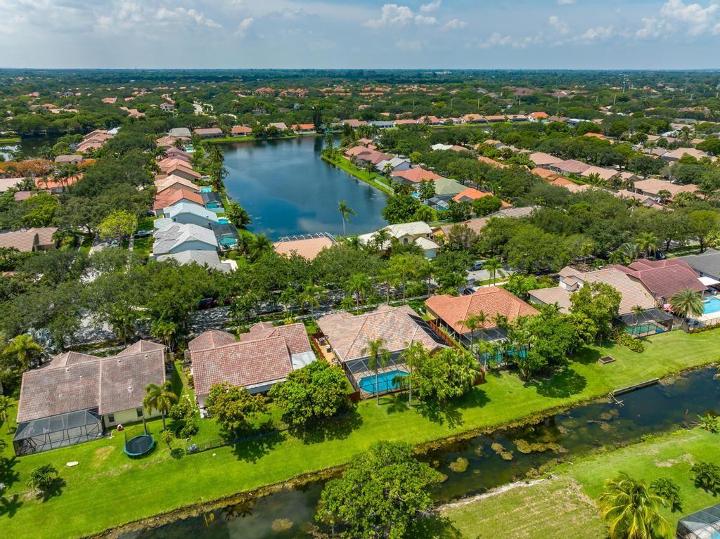 Beautiful, updated, waterfront pool home in Fox Run in Jacaranda. This well-maintained home features an open-concept floor plan, high ceilings, lots of natural light and a view of the renovated pool and spacious travertine deck. Enjoy the lush, tropical landscaping from the screened waterfront patio. The zoned sprinklers use canal water to irrigate the lawn and garden, providing extra savings. The oversized primary bedroom suite features an amazing spa shower, walk-in closet, bamboo flooring and sliding glass/cabana door access to the waterfront pool and patio. The living area and large extended family room are perfect for all to enjoy. The open kitchen has a breakfast bar, pantry, granite counters and custom cabinets.