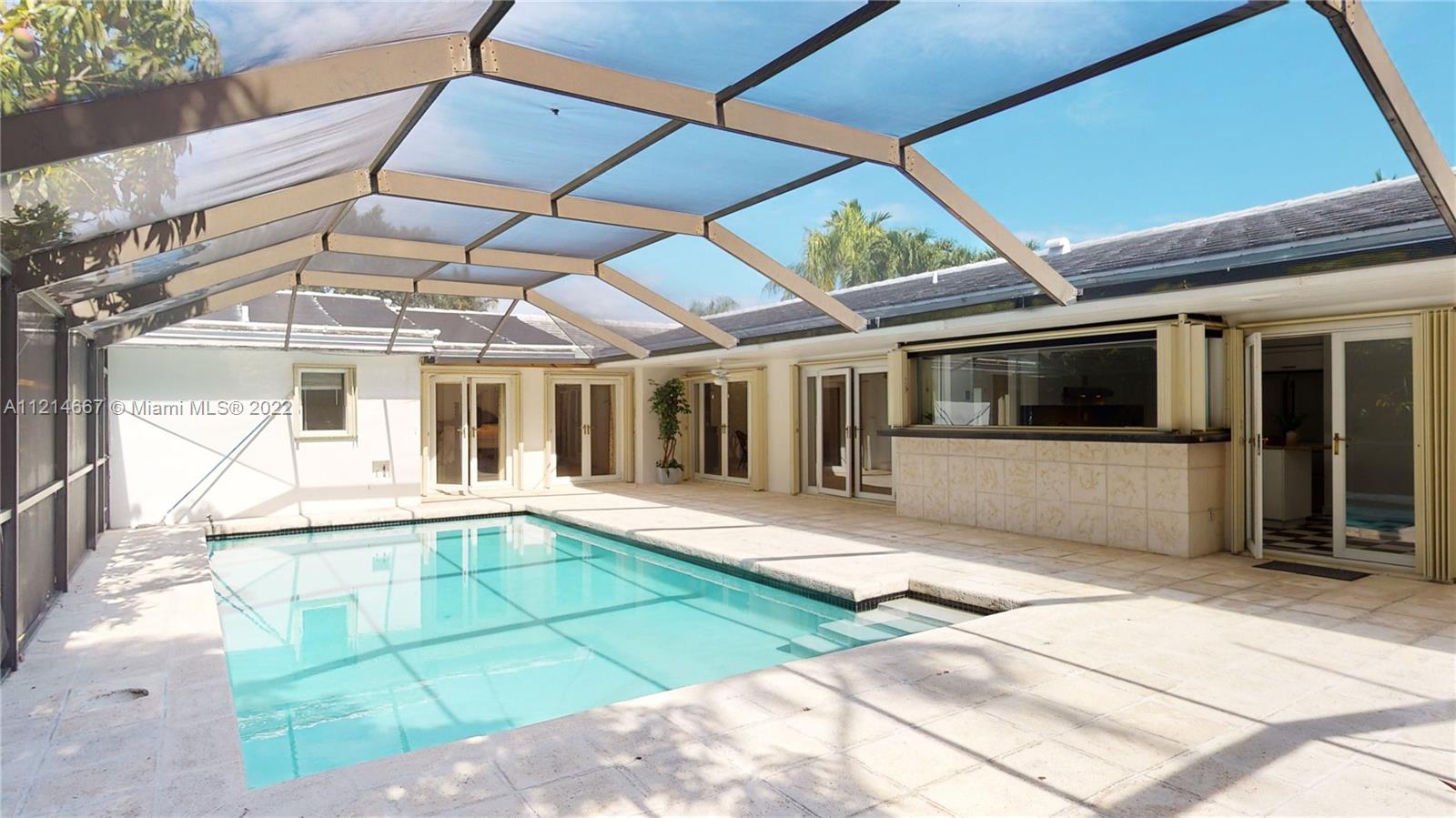 Nestled in South Coral Gables on a private cul-de-sac resides this lovely home situated on an approx. 10,000 SF lot. The living areas have beautifully refinished blond oak hardwood floors and look out onto the screened pool area. This special home offers a new eat-in kitchen w/ marble countertops w/stainless steel appliances. Four bdrms, three baths w/large mstr. bdrm featuring an oversize jacuzzi, enormous walk-in shower & two big walk in closets. Two year new roof & cent ac's, passive solar pool heater, separate laundry rm, 2 car garage. Mango & papaya fruit trees shade the property. Superb South Gables location and 5 min drive to shops in Coconut Grove, South Miami, Miracle Mile, and Grove Bayfront parks. Two minutes to Ransom/Everglades & Carrolton, top rated private schools.
