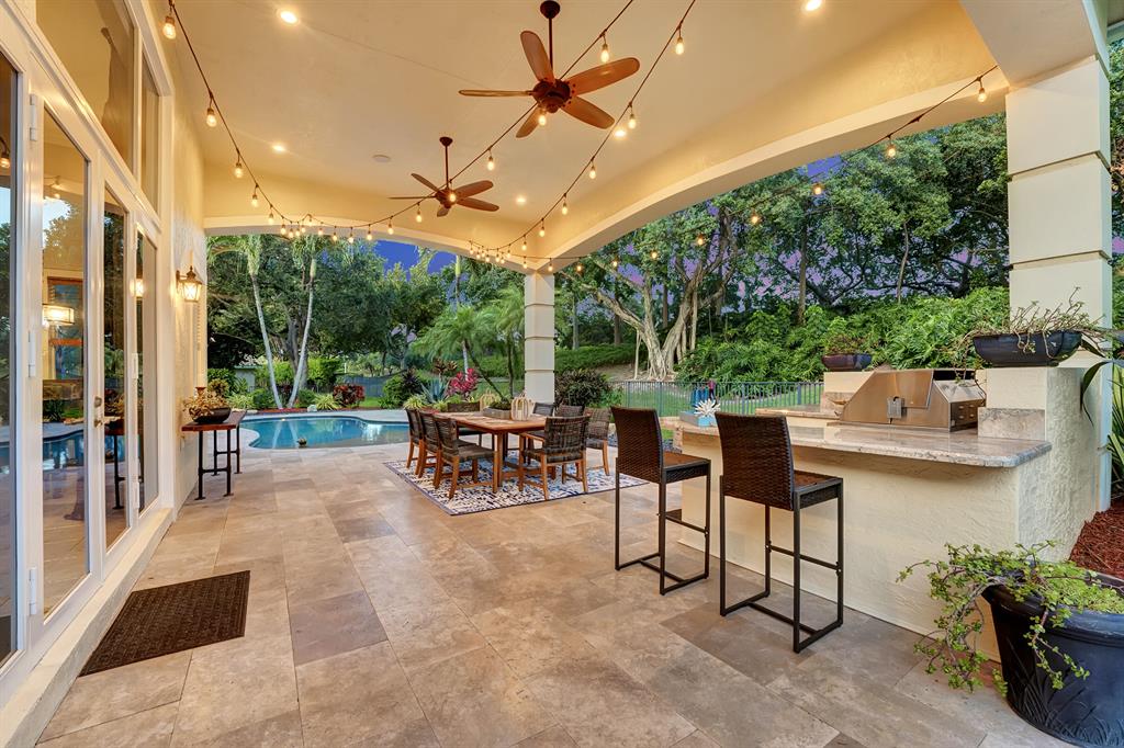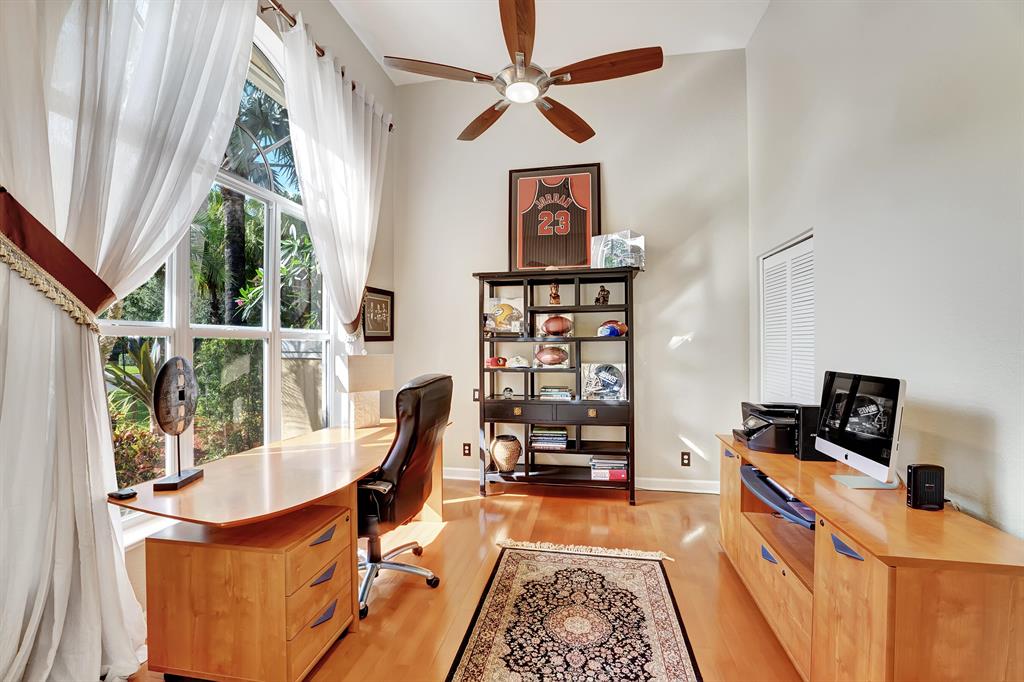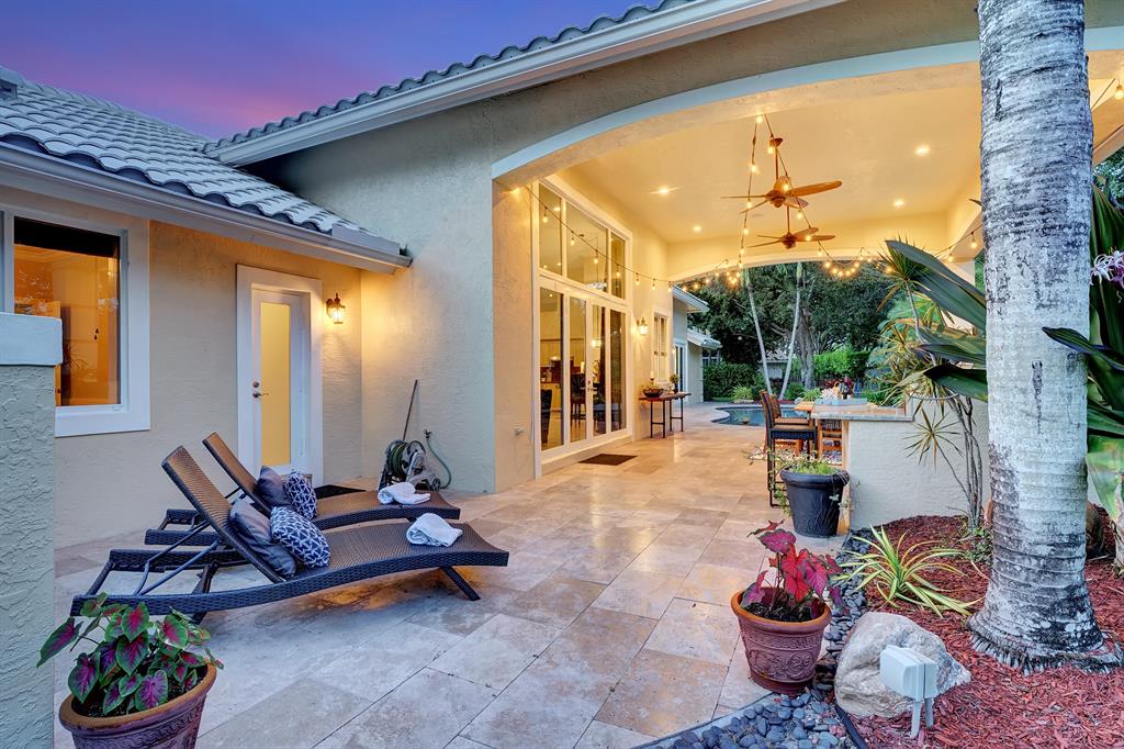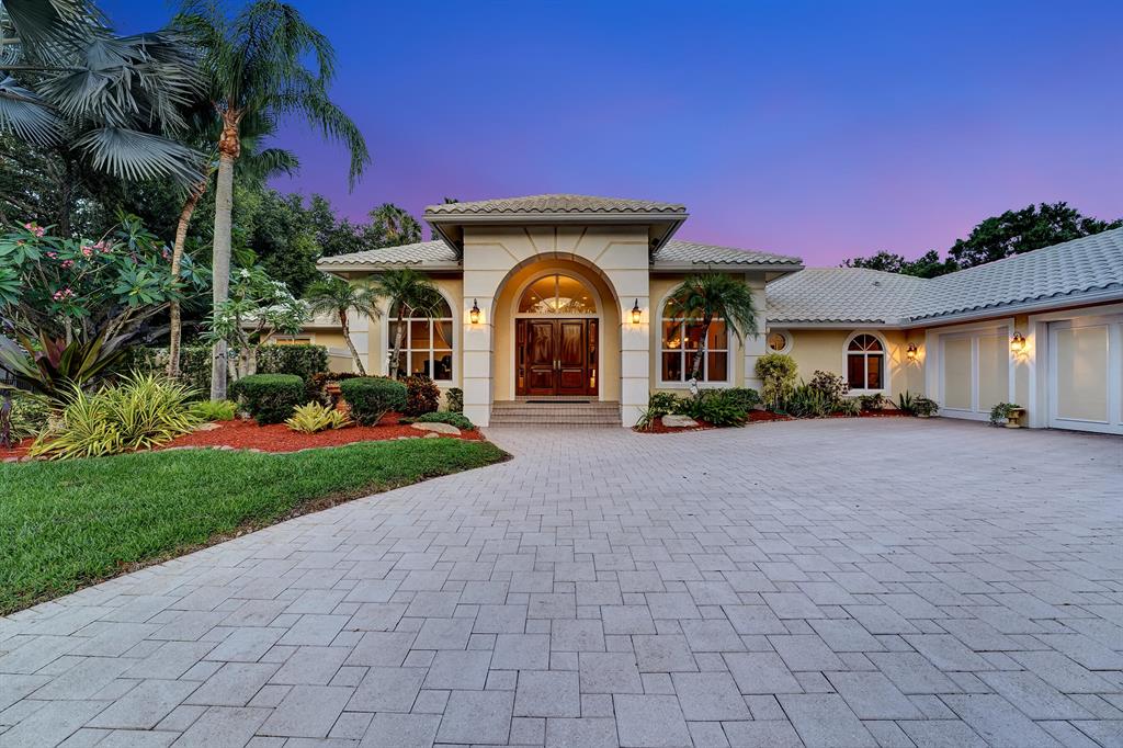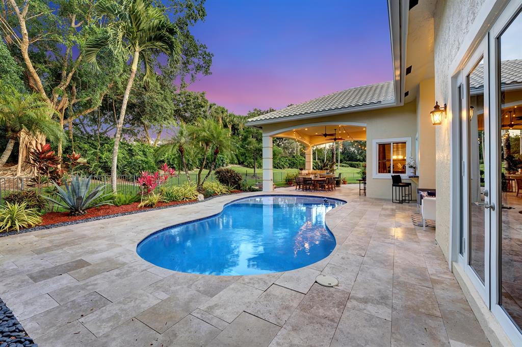 Rarely available beautiful single-story home in the Estates section that will make you say WOW! The Mahogany doors welcome you as you walk up to the grand front entrance with tropical lush greenery, a circular driveway and a 3-car garage. Meticulously cared for, this split floor plan has the primary bedroom and office on one side and the remaining 3 bedrooms & 2 baths (one is a cabana bath) on the other side; with a half-bath perfectly located near kitchen/family room. UPDATED primary bathroom like a spa! All other bathrooms updated! NEWER ROOF. IMPACT GLASS COMPLETE. And wait until you see the resort-style backyard! Extended roof provides shaded cover, outdoor kitchen, fire pit, beach-entry pool, plenty of grass space, PRIVATE and completely fenced in! YOU WILL LOVE THIS HOME!