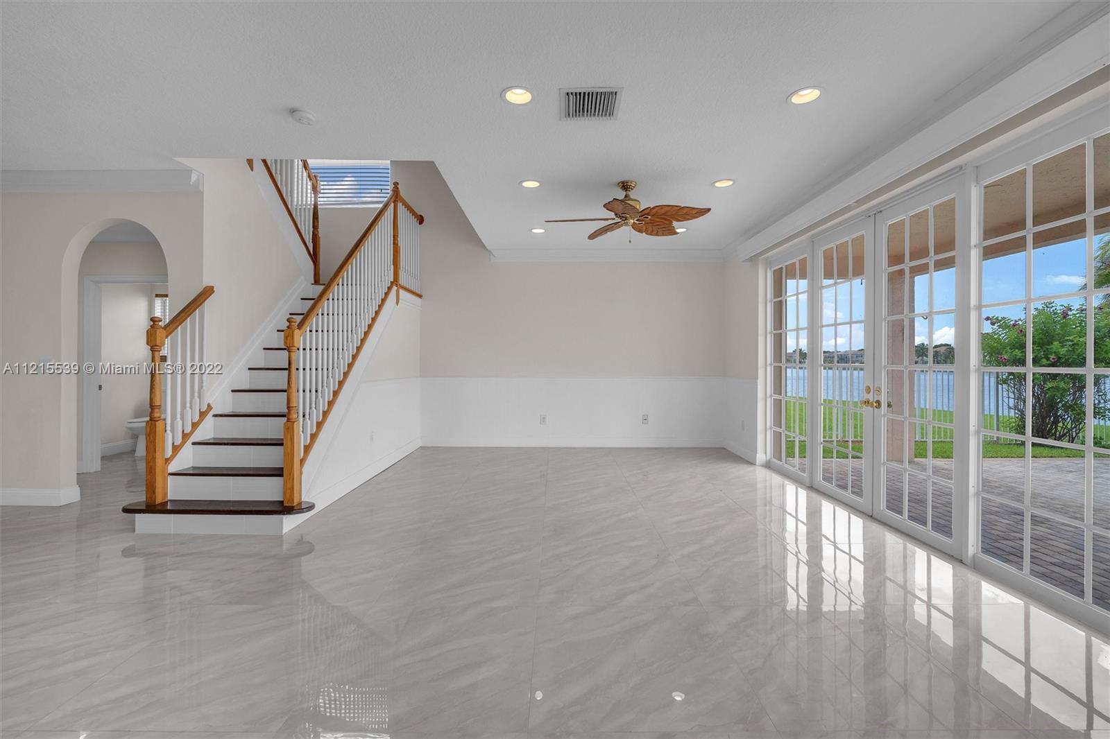 Superb tropical waterfront, pool,4 BR, 2.5 bath home in the manned-gated community of Riviera Isles in West Miramar. Huge upgraded kitchen w/ big pantry, island, wood cabinetry, granite counters, prep sink, stainless steel appliances, eat-in kitchen, more. Formal living room, formal dining, family rm, awesome new laundry room. All BR upstairs, large primary suite w/sitting area. Beautiful wide lake views, fenced yard, pool, covered patio. Resort Style amenities: manned gates, fitness center, lakeside clubhouse, tennis, basketball, huge community pool w/waterfall. Excellent location, Grade A schools. Close to Miramar Regional Park, Memorial Miramar Hospital, new shopping/dining, highways.
