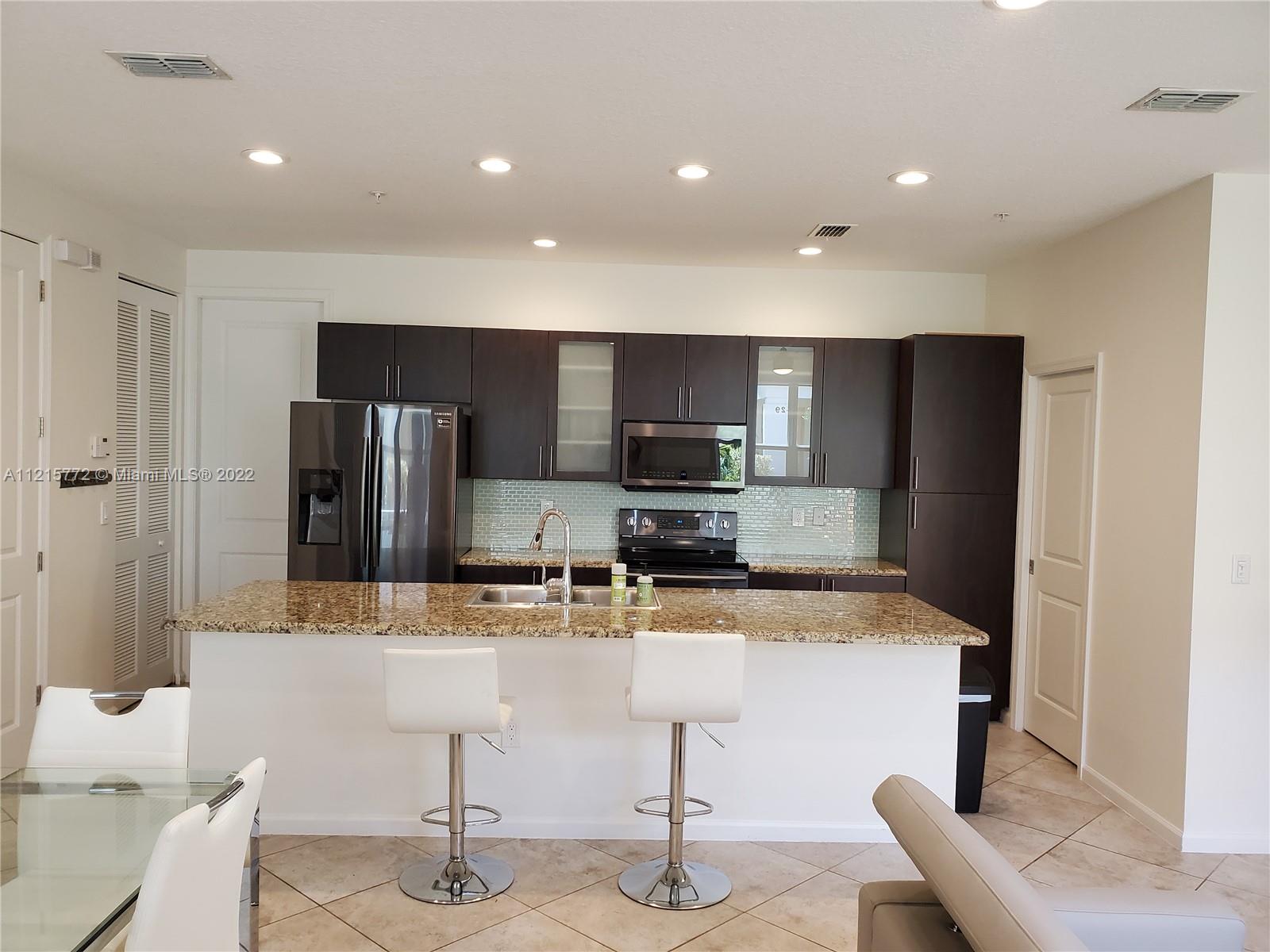 Tastefully decorated unit with large Patio. Fully furnished and move-in ready! The spacious eat-in kitchen features stainless steel appliances, a granite countertop, and a tiled backsplash. The half bathroom and laundry room are downstairs, so as an entrance to 2 car garage. The family/dining combination has a large TV. The second floor has an office area with a computer table. Both bedrooms are suites with walk-in closets. The secure gated community has resort amenities: a large landscaped pool area, gym, access to Pondhawk natural area with walking trails, and Spanish River Library on the opposite side of the Lake. Close to many shopping areas, and I-95. Conveniently located between FLL and WPB airports.