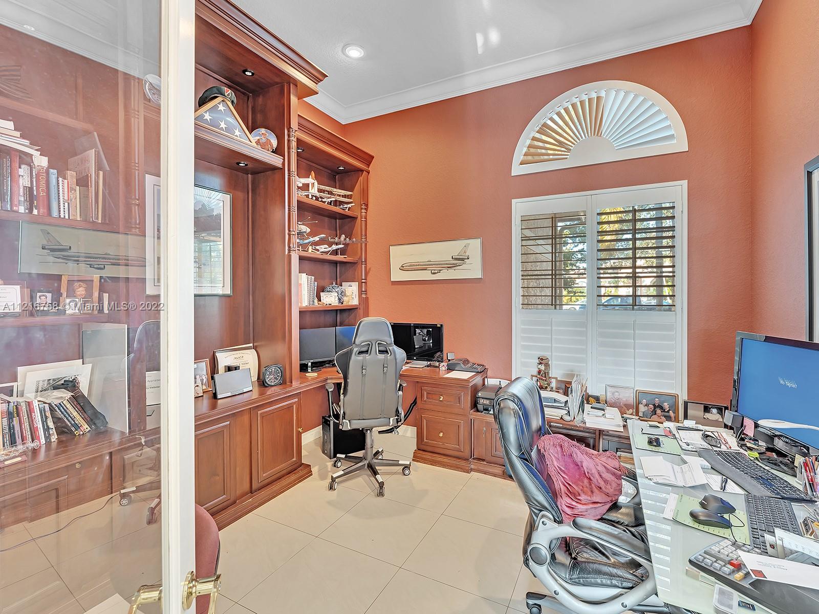 Beautiful 3,766 sqf single family home with 5 bedrooms, 4 baths and an elegant office with built-in cabinetry. Convenient split configuration/open concept layout. Many windows and glass doors let in a ton of natural light and offer stunning views of the recently updated pool/deck and lake from kitchen, informal dining, family, living room and oversized master bedroom. Plantation shutters on all windows alongside back-end of house. Master bath has dual water closets. Equipped with electric outlet to install electric car charger and power generator outlet (generator included). Most appliances, including washer/dryer are less than 2 years old. Property is on private cul de sac in beautifully maintained and highly sought after gated community with too many amenities to list! Gorgeous property!